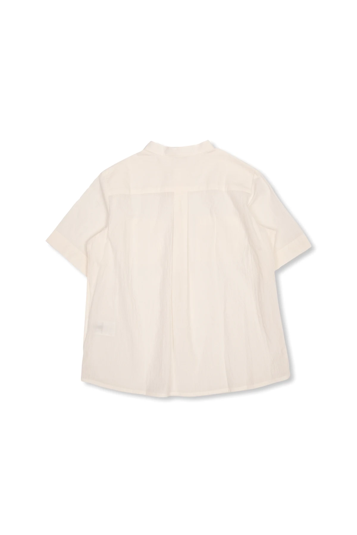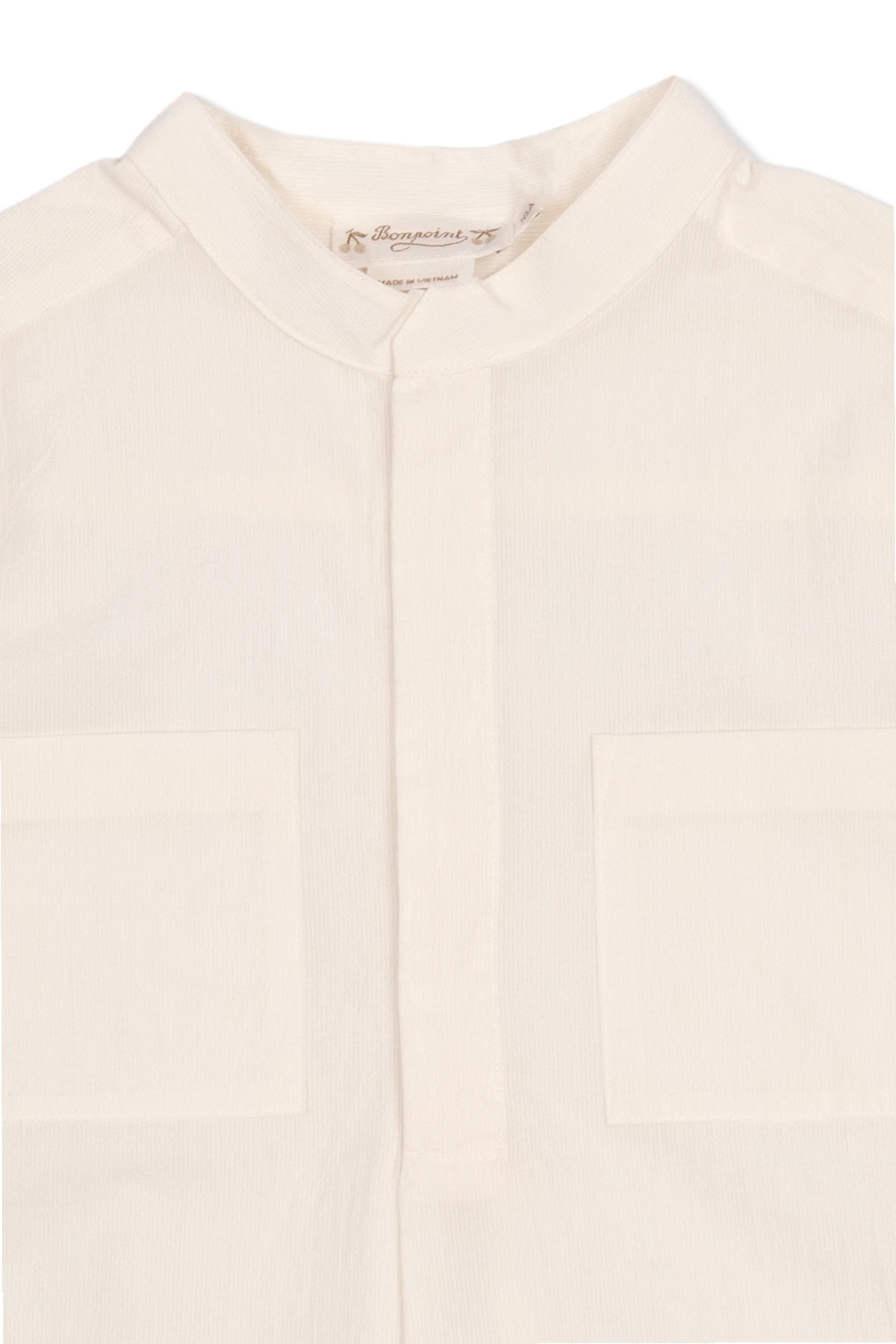 Cream ‘Cillian’ shirt from Bonpoint. Made of cotton, this style features a standing collar, button fastenings, two frontal pockets and short sleeves.