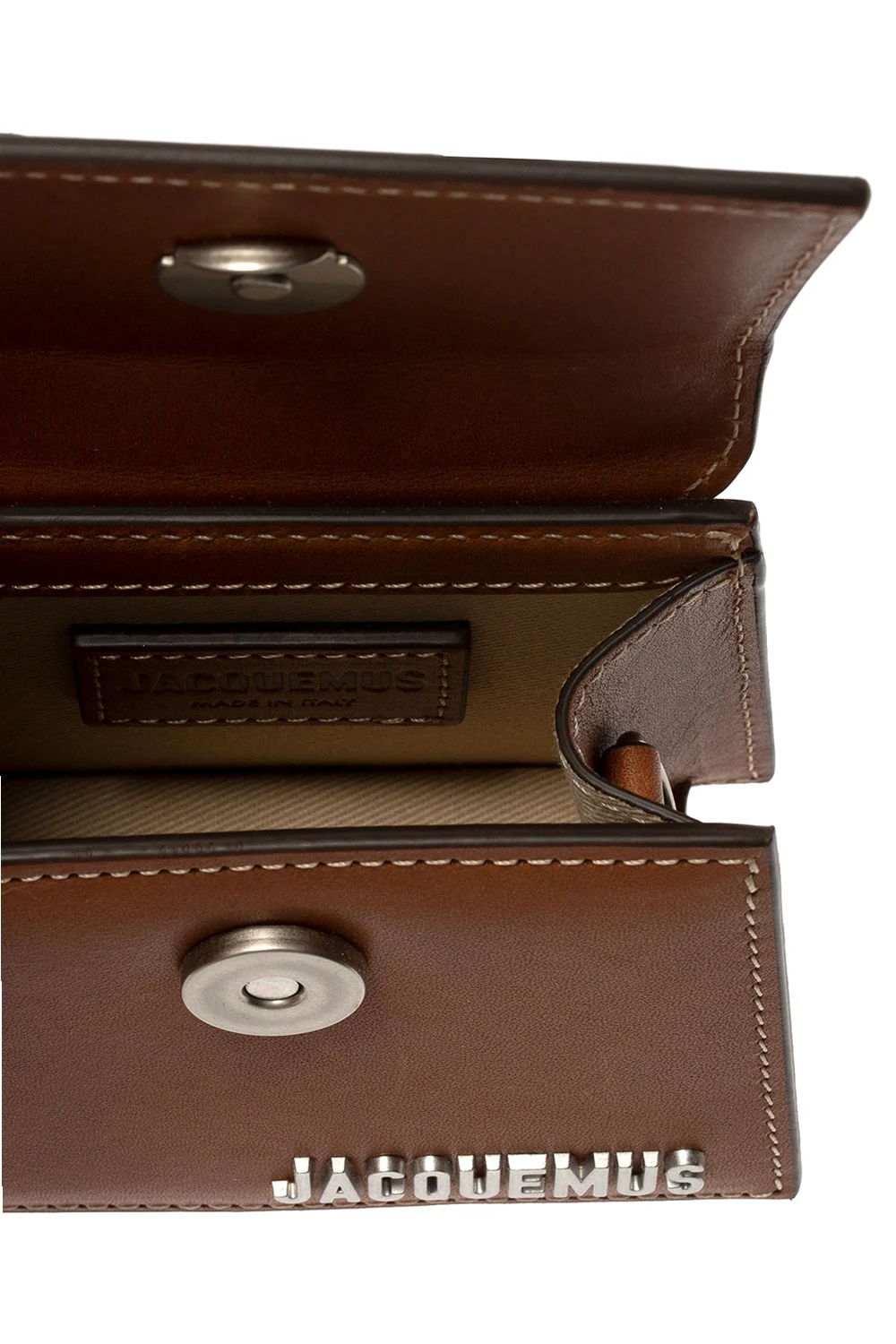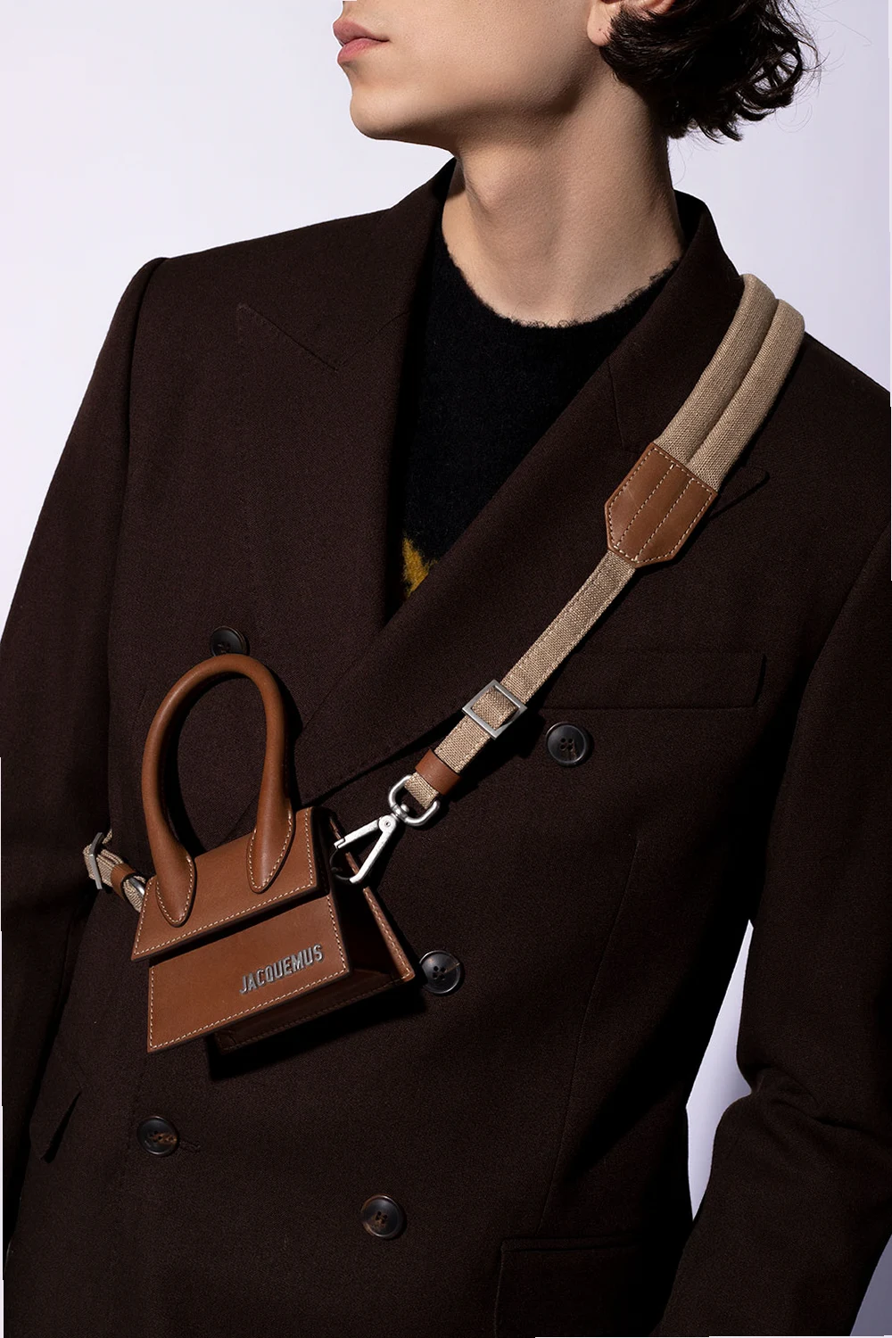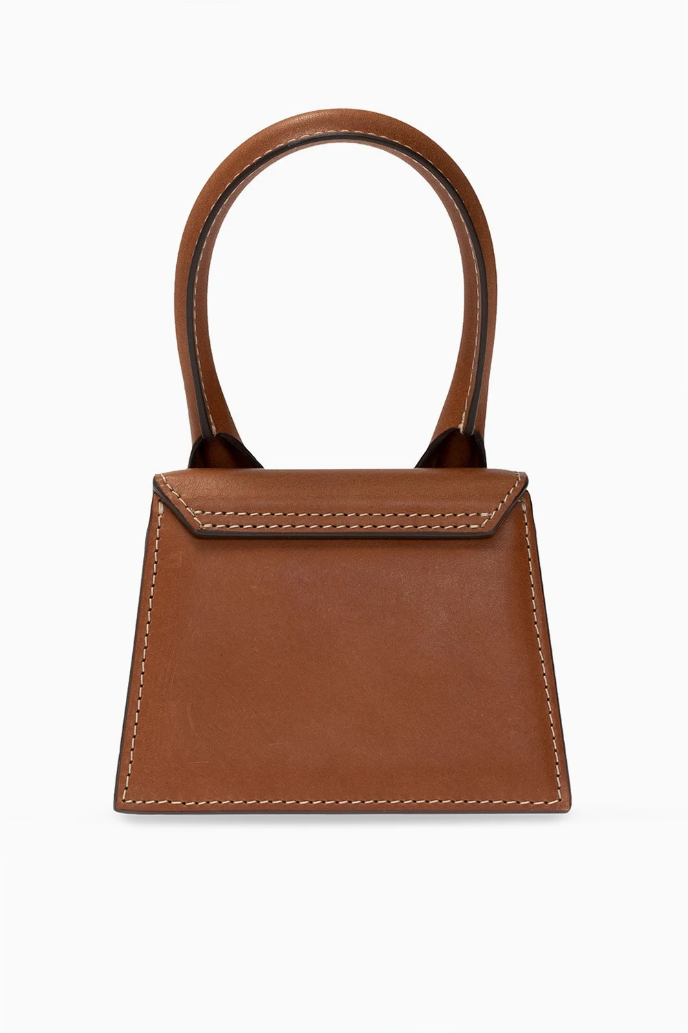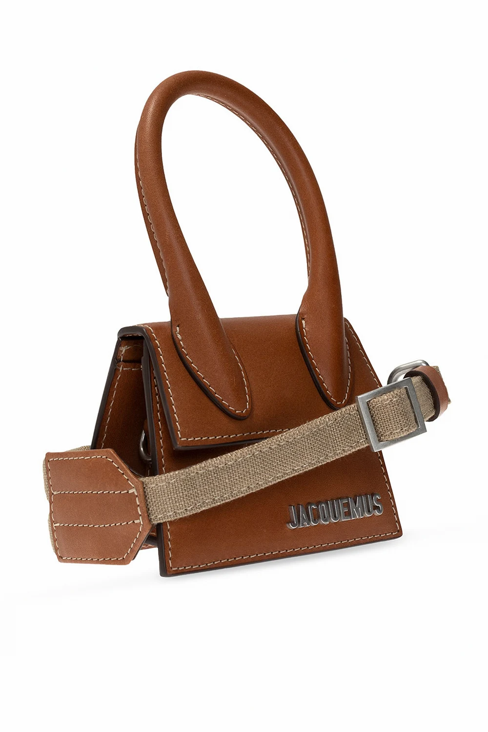 Brown \'Le Chiquito\' shoulder bag from Jacquemus. Crafted from leather, this design fastens via a snap and features exposed stitching details, a silver-tone metal logo plaque, a half-round handle, a detachable and adjustable shoulder strap in beige and brown, and one internal compartment.