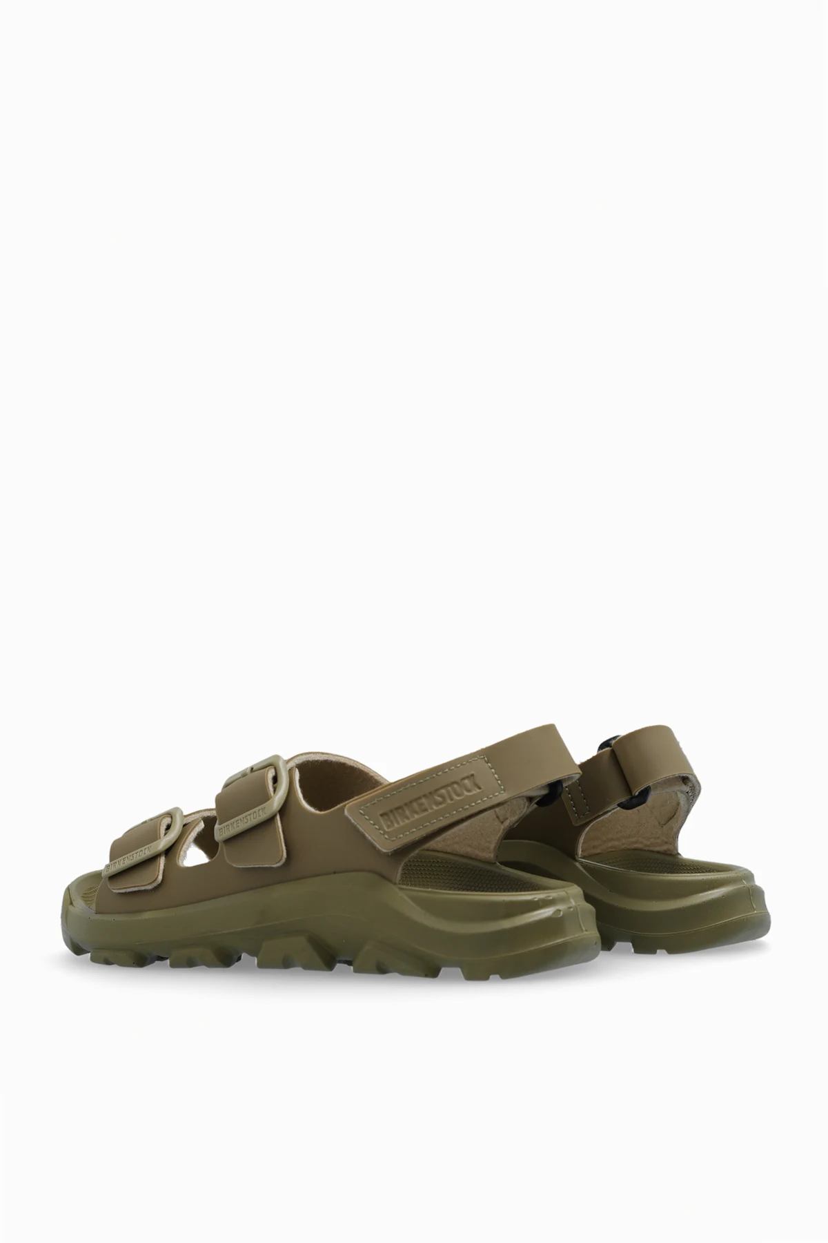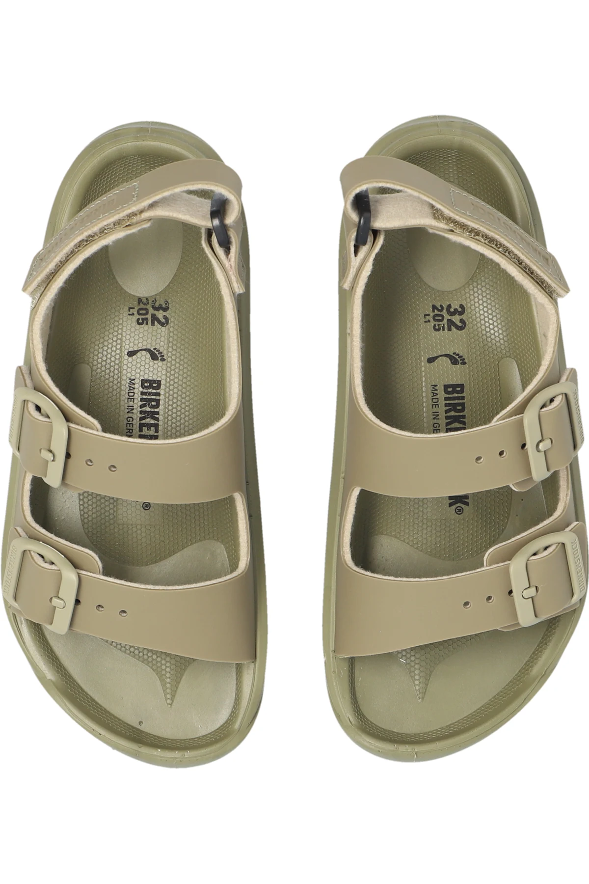 Khaki ‘Mogami AS’ sandals from Birkenstock Kids. Made with Birko-Flor®, this model showcases an embossed logo, adjustable straps with a buckle, a velcro strap, an anatomically shaped, tapered, watertight footbed with toe protection and the highly functional khaki sole which is injected into the footbed and upper in two layers - this makes the sandal extremely flexible and durable in any terrain. Birko-Flor® is made of easy-care and hygienic PVC, lined on the inside with a soft, breathable fleece layer. High-quality, comfortable and durable material very gentle to the skin.