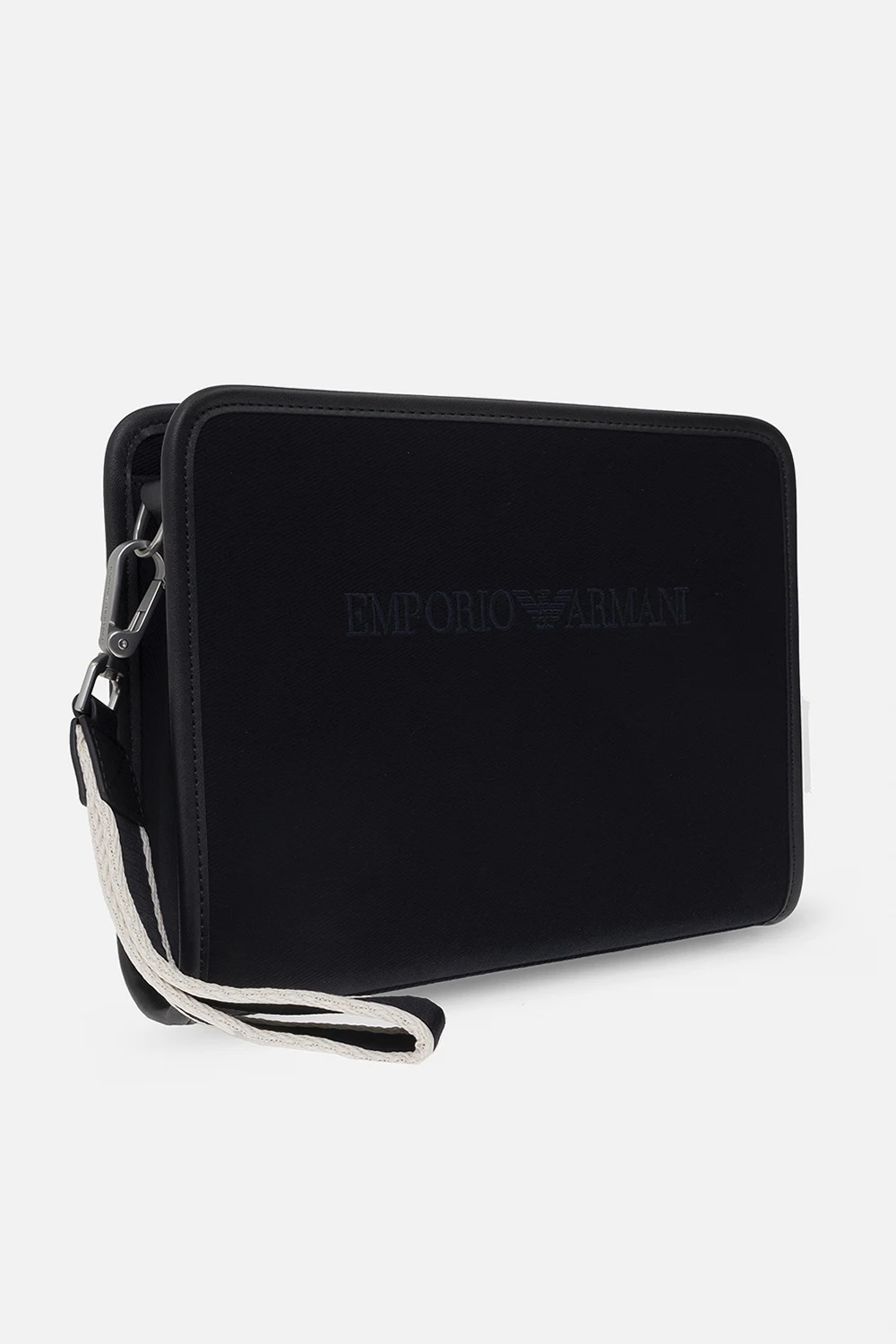 Navy blue handbag from Emporio Armani. Crafted from fabric, this design fastens with a zipper and features an embroidered logo on the front, a side wrist strap in navy blue and white, silver-tone metal hardware and one internal compartment with a slip pocket.