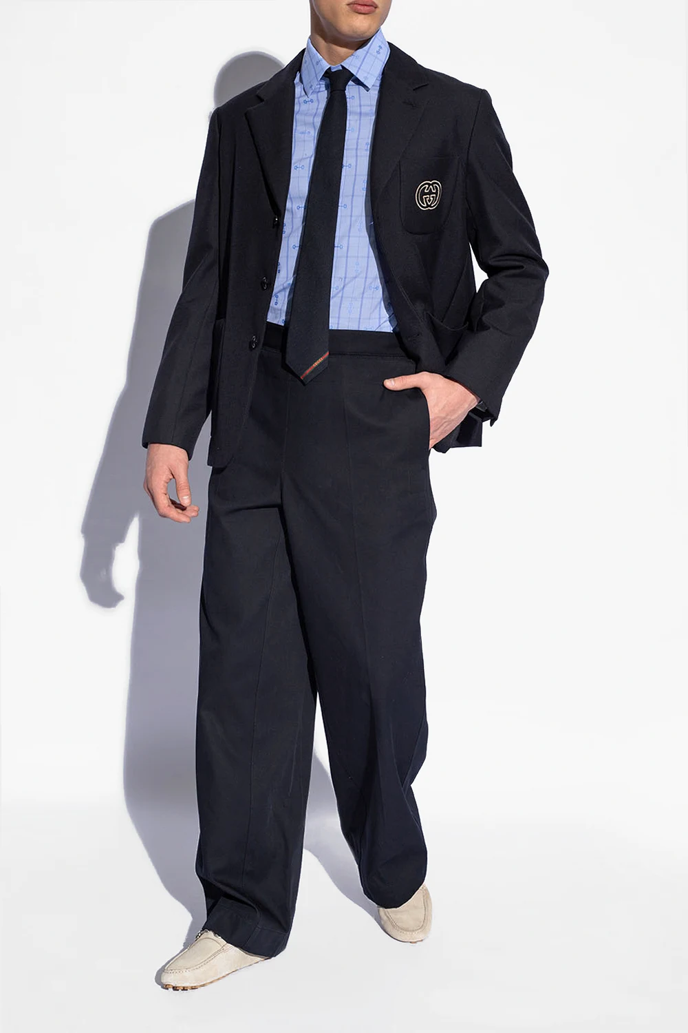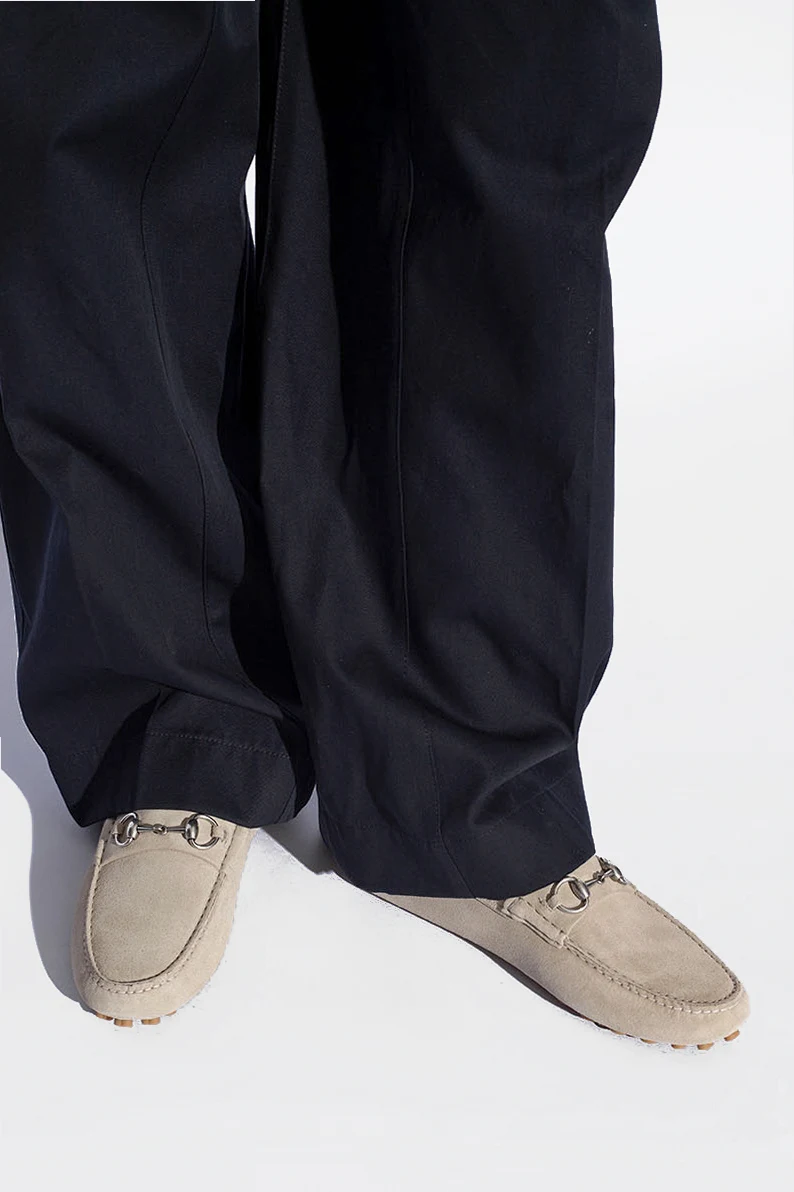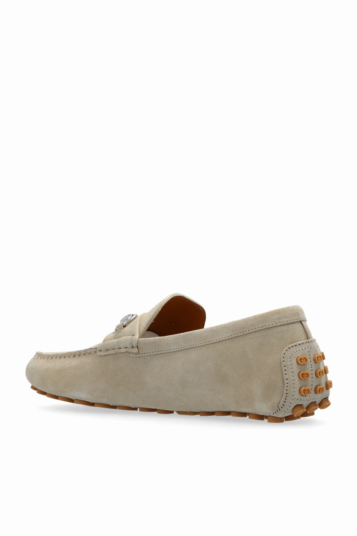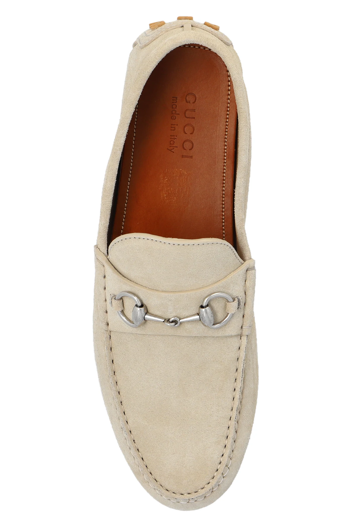 Greyish beige moccasins from Gucci. Made of suede, this pair features the brand’s signature horsebit detail in silver-tone and rubber Interlocking G details in brown.