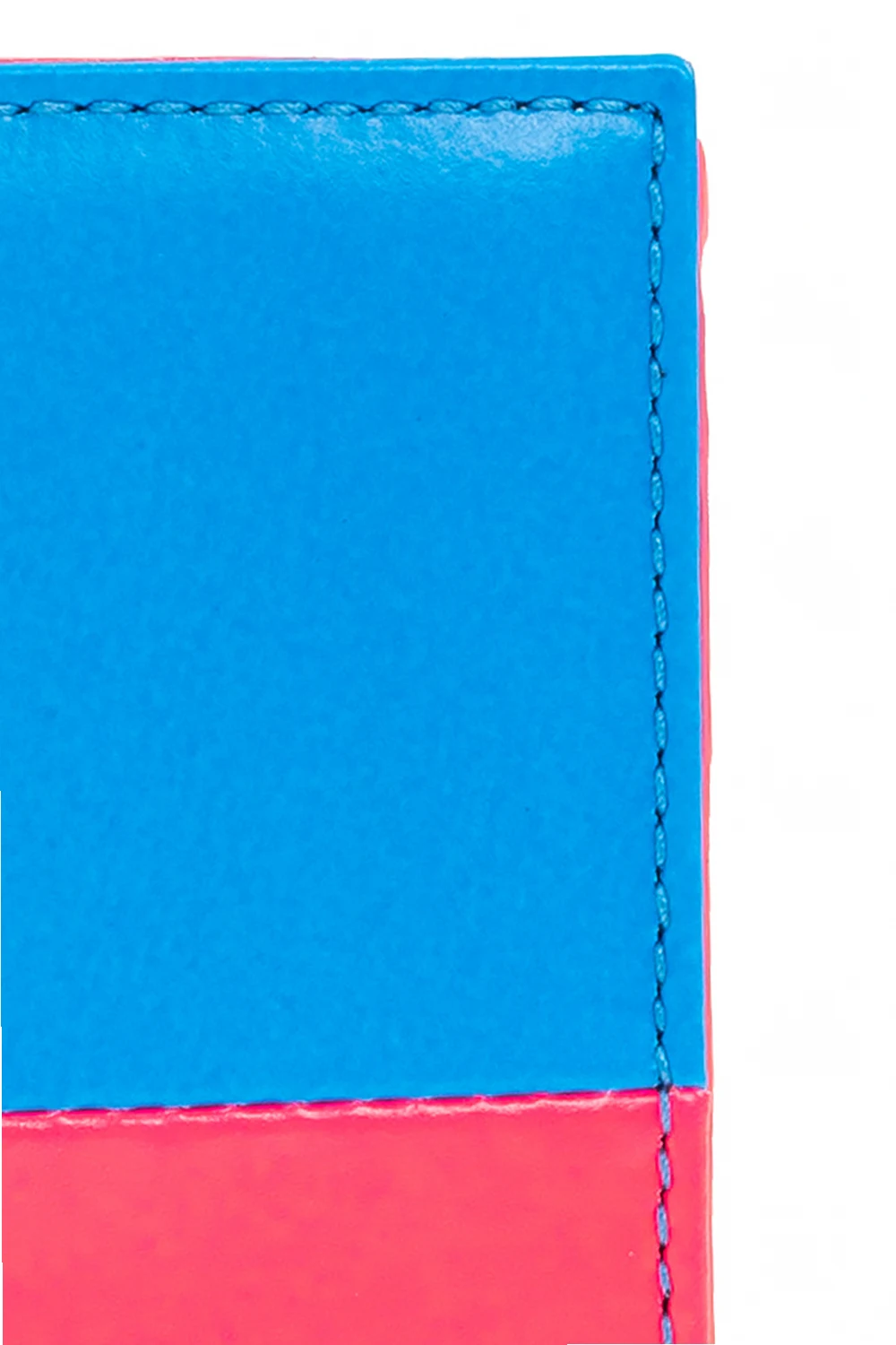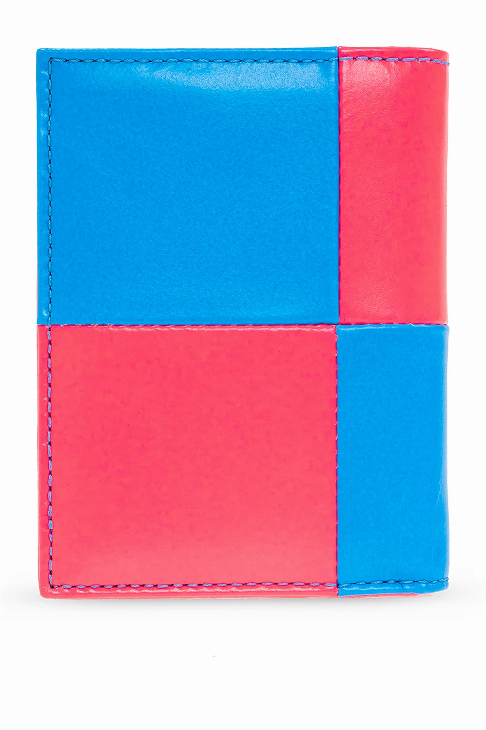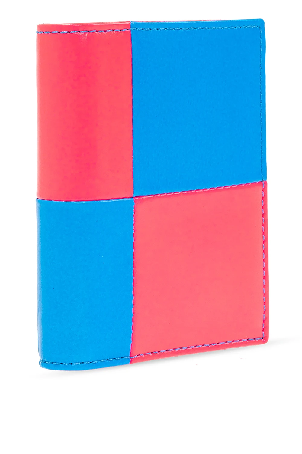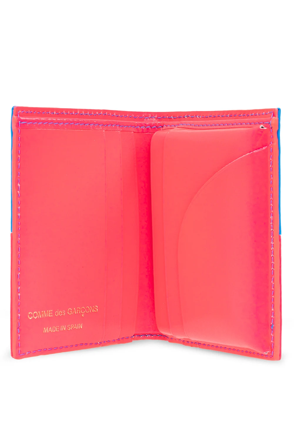 Neon pink and blue folding wallet from Comme des Garçons. Crafted from goat leather, this design showcases an embossed gold-tone logo and an interior with a bill compartment and six card slots.