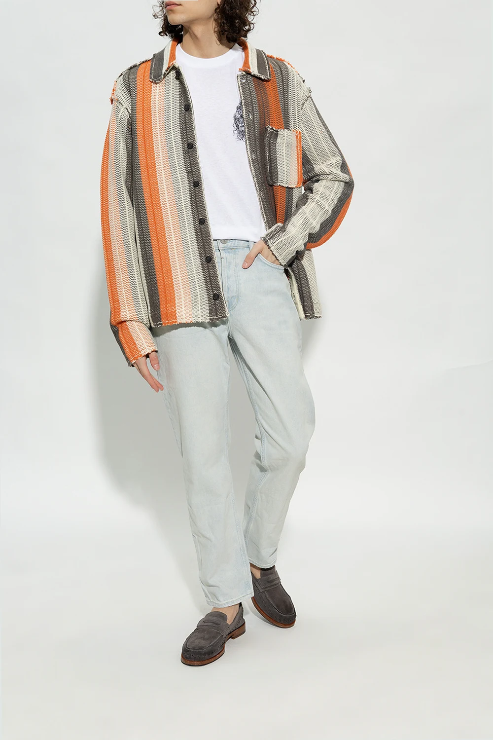 Dark grey ‘Sammy’ loafers from AllSaints. Made of suede, this pair features decorative stitches and a brown sole made of leather and rubber.