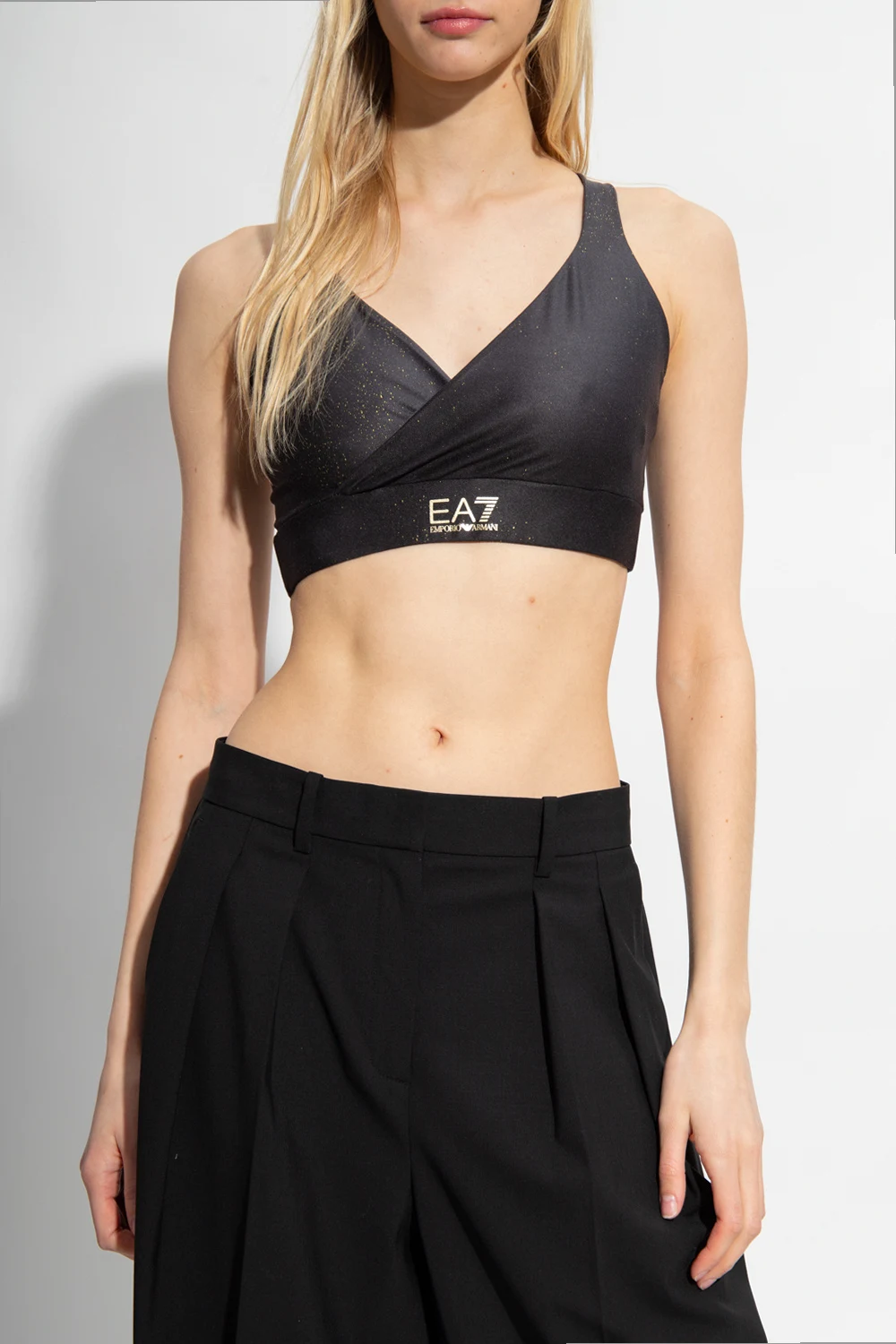Black cropped tank top from EA7 Emporio Armani. Decorated with a gold-tone print and logo, this design has criss-cross straps at the back.
