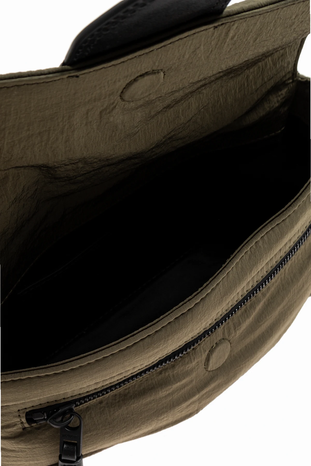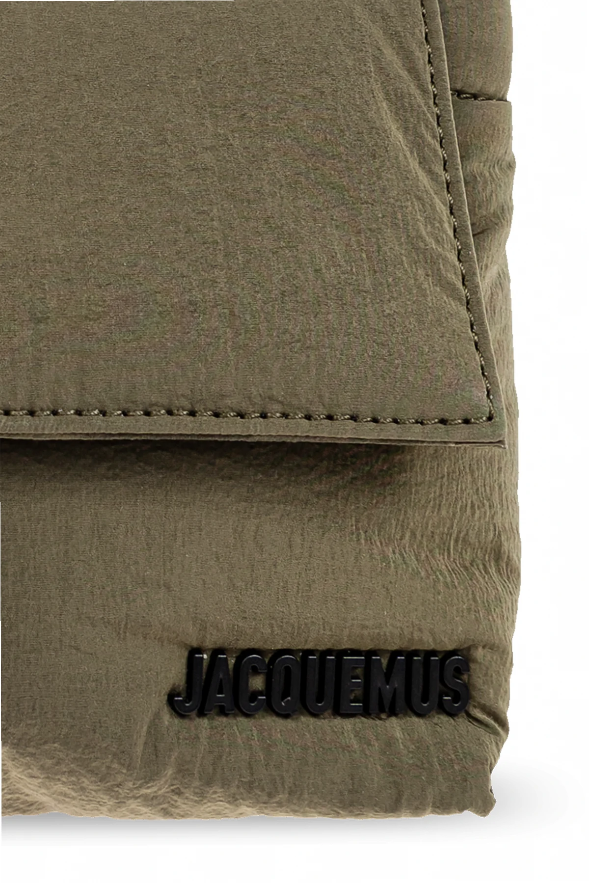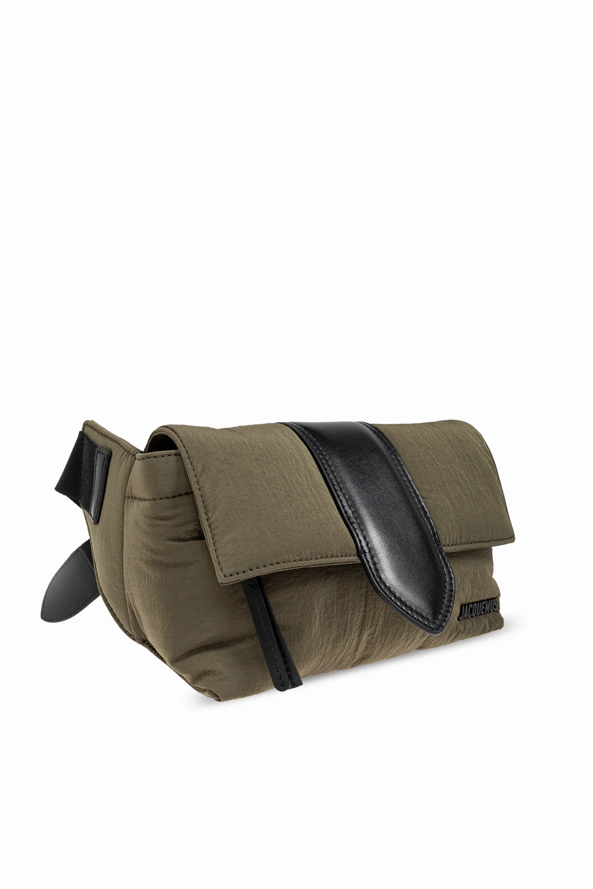 Introducing the exquisite \'La Banane\' waist bag by the renowned designer Jacquemus. This elegant accessory seamlessly marries functionality with unparalleled style, making it a quintessential addition for the modern man. The bag boasts a sophisticated rectangular shape, adorned with a magnetic flap closure. A central black leather strap accentuates the flap, imparting a refined touch to the bag\'s overall aesthetic. Crafted from premium green (khaki) textile material, the bag is complemented by luxurious black leather details. The interior features a secure zippered pocket, ensuring the safety of your essentials, and additional slip pockets to enhance its practicality. The spacious interior is designed to accommodate all your necessities while maintaining a sleek profile. The wide, adjustable strap allows for versatile wear—either around the waist or over the shoulder. The minimalist yet elegant design is crowned with a black metal \'JACQUEMUS\' logo on the flap, underscoring the exclusivity of this piece. Why Choose This Product? Exclusive design by Simon Porte Jacquemus. Premium materials: green (khaki) textile and black leather. Secure magnetic closure with additional zippered interior pocket. Adjustable strap for versatile carrying options. Spacious interior with multiple pockets for enhanced functionality. Iconic \'JACQUEMUS\' metal logo accent.