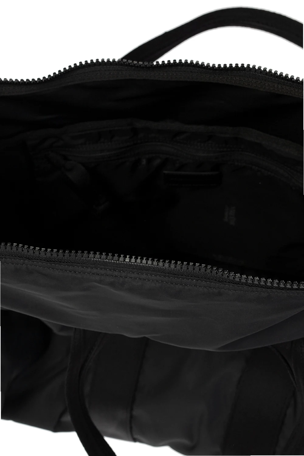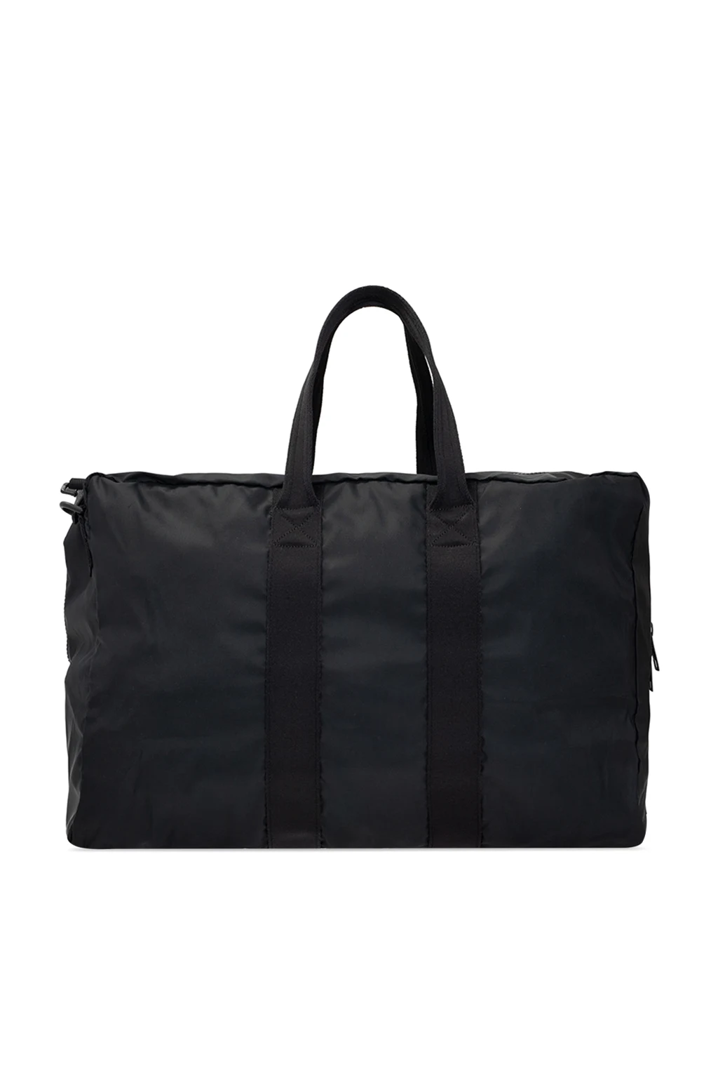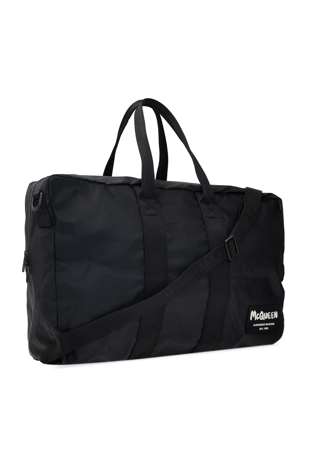 Black holdall bag from Alexander McQueen. Fastened with a two-way zip, this model features a logo patch, two half-round handles, detachable and adjustable strap as well as one internal compartment with one zip pocket.