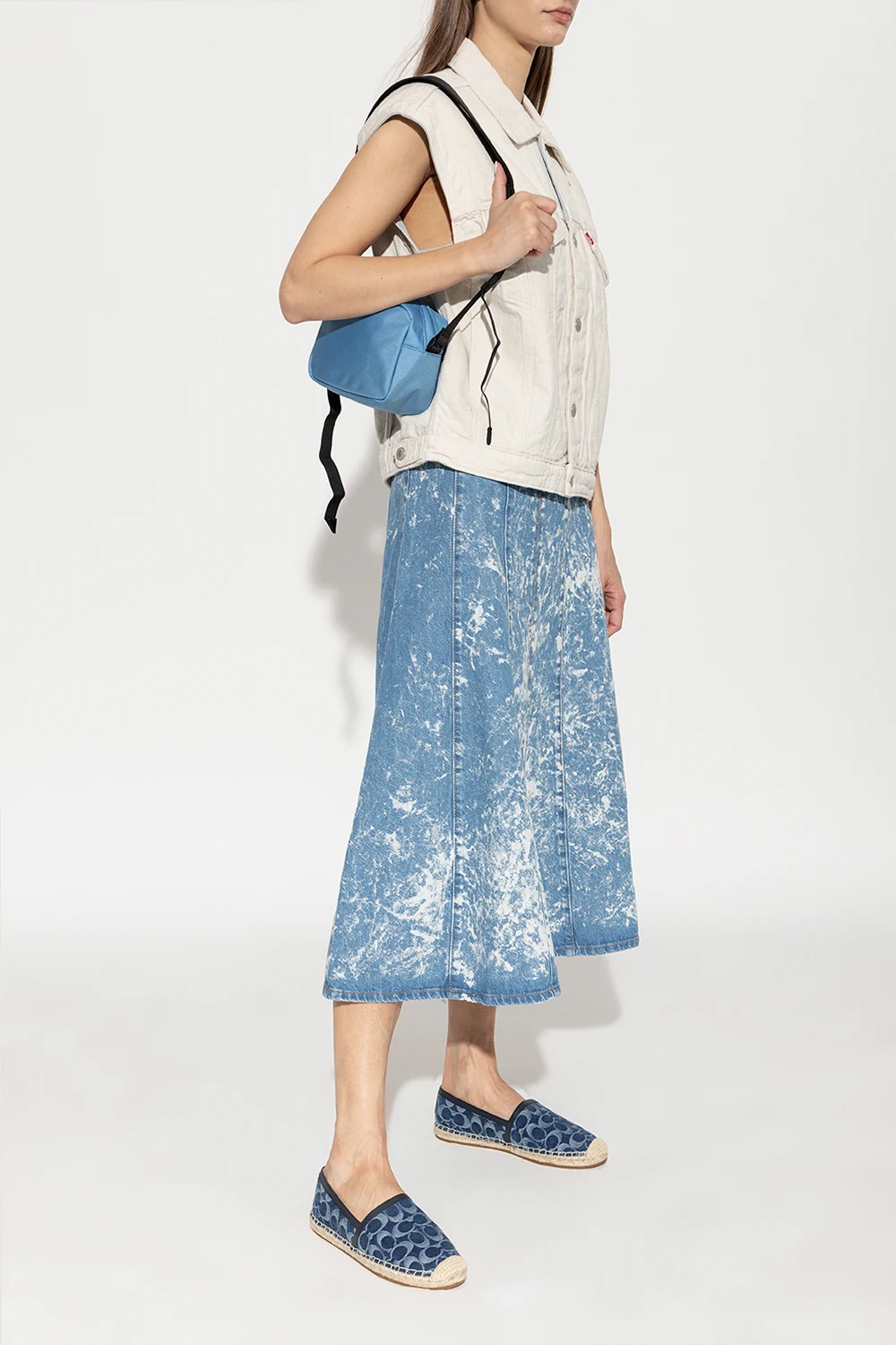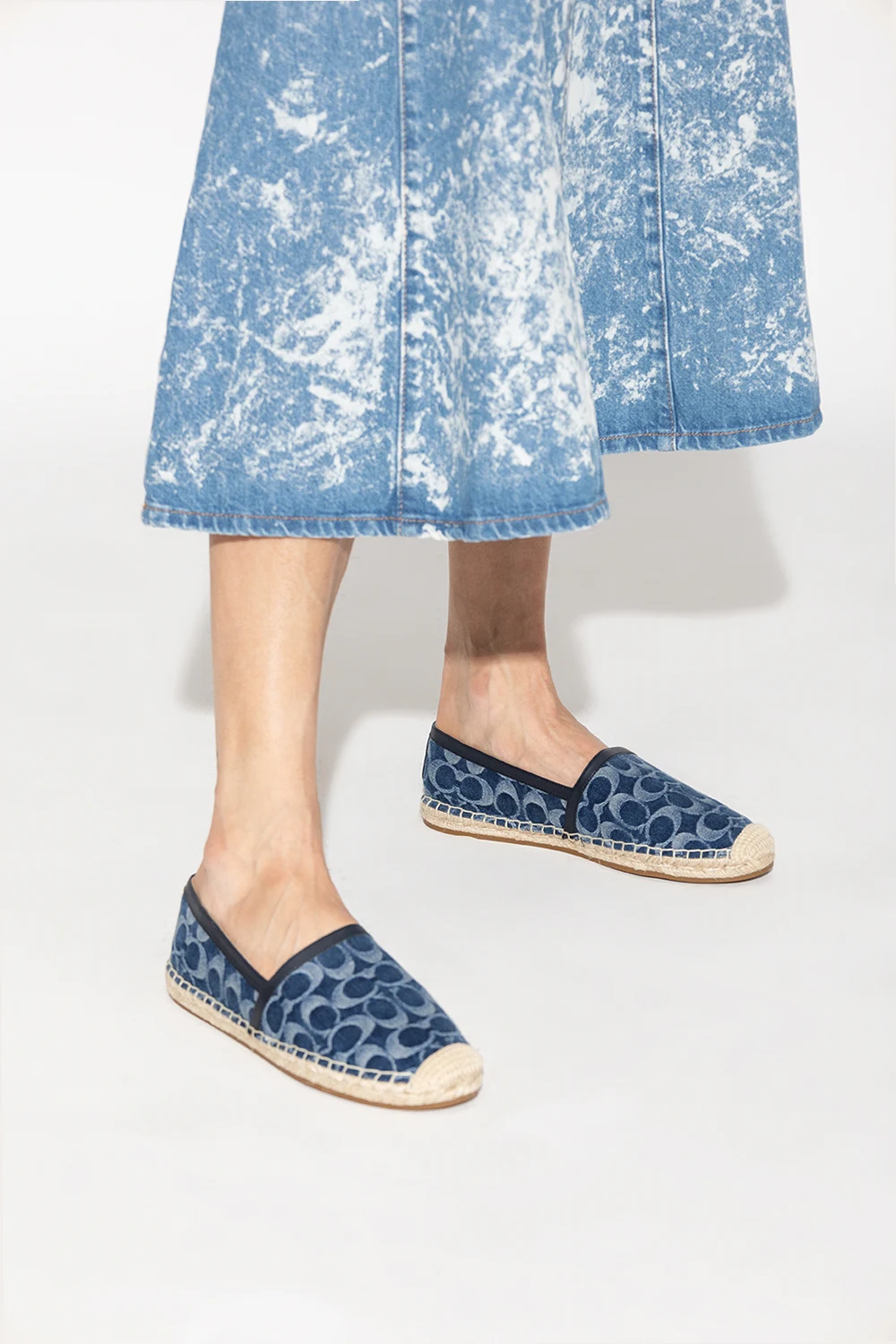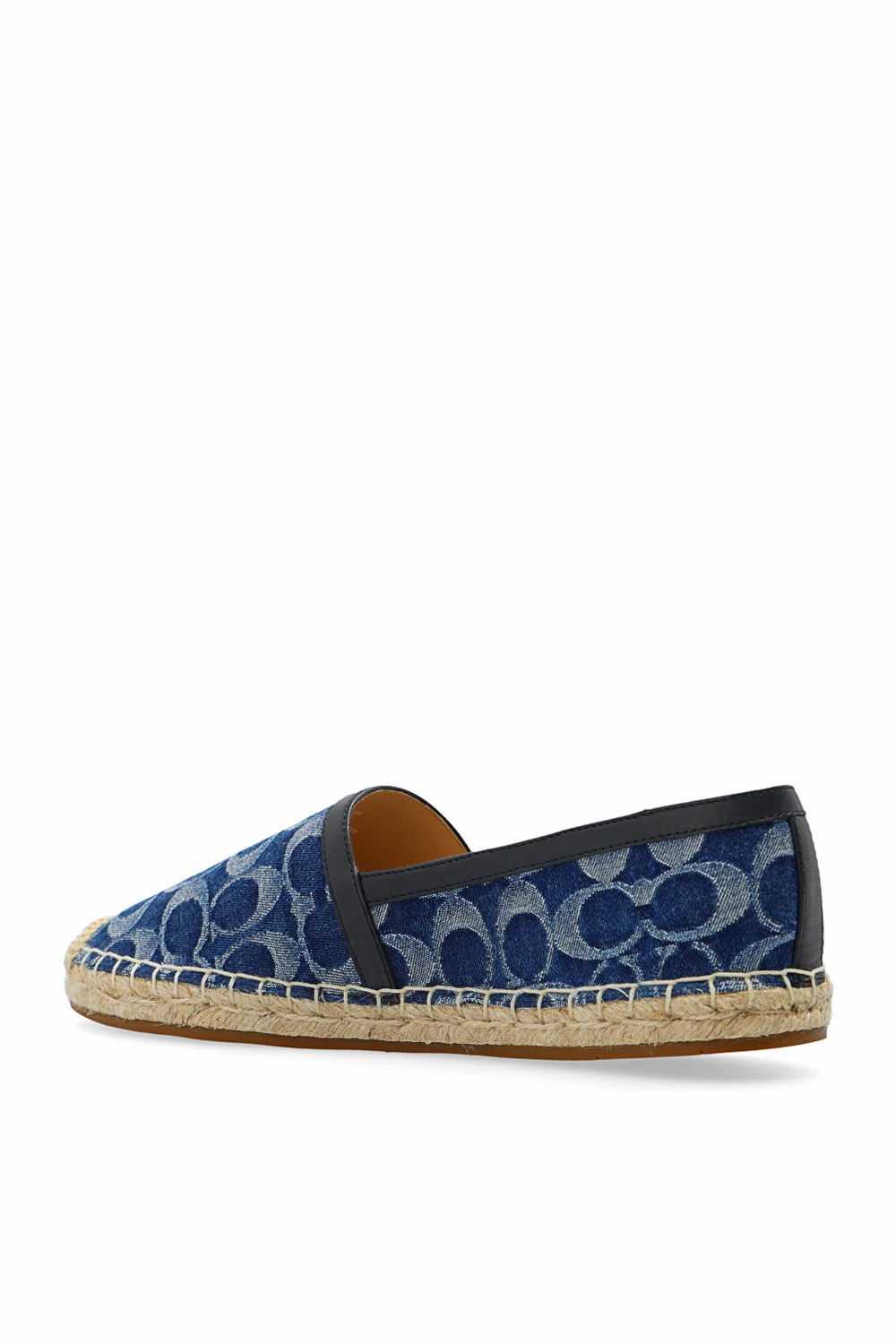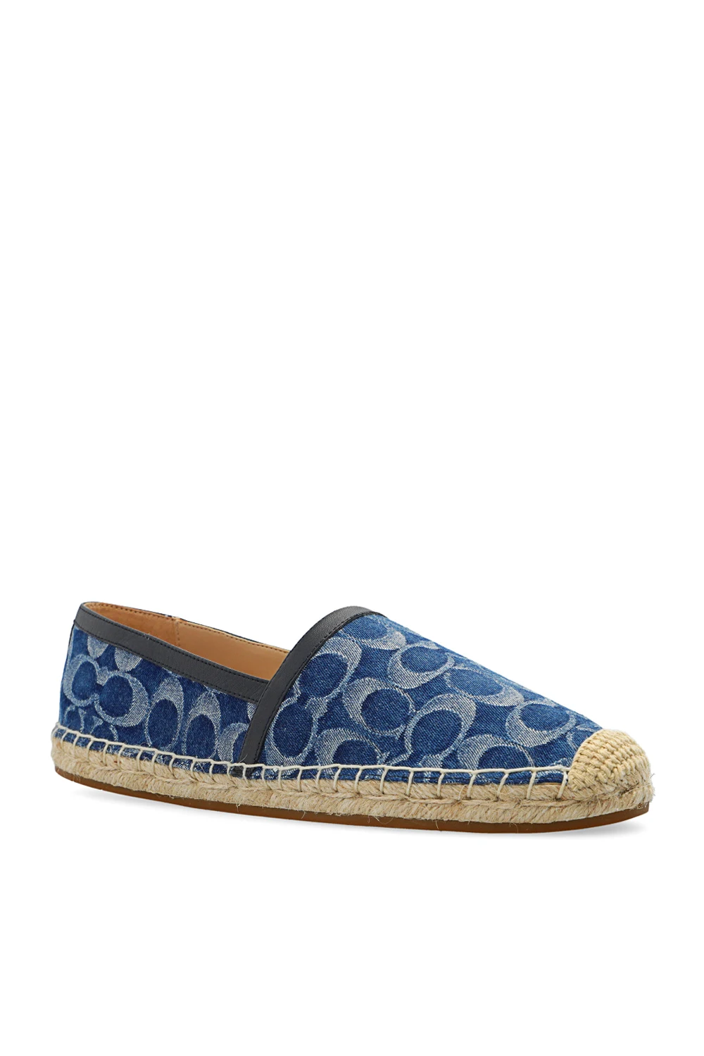 Navy blue and white ‘Collins’ espadrilles from Coach. Made of leather and fabric, this model sits in a beige rubber sole with a jute overlay and showcases the brand\'s ‘C’ monogram pattern.