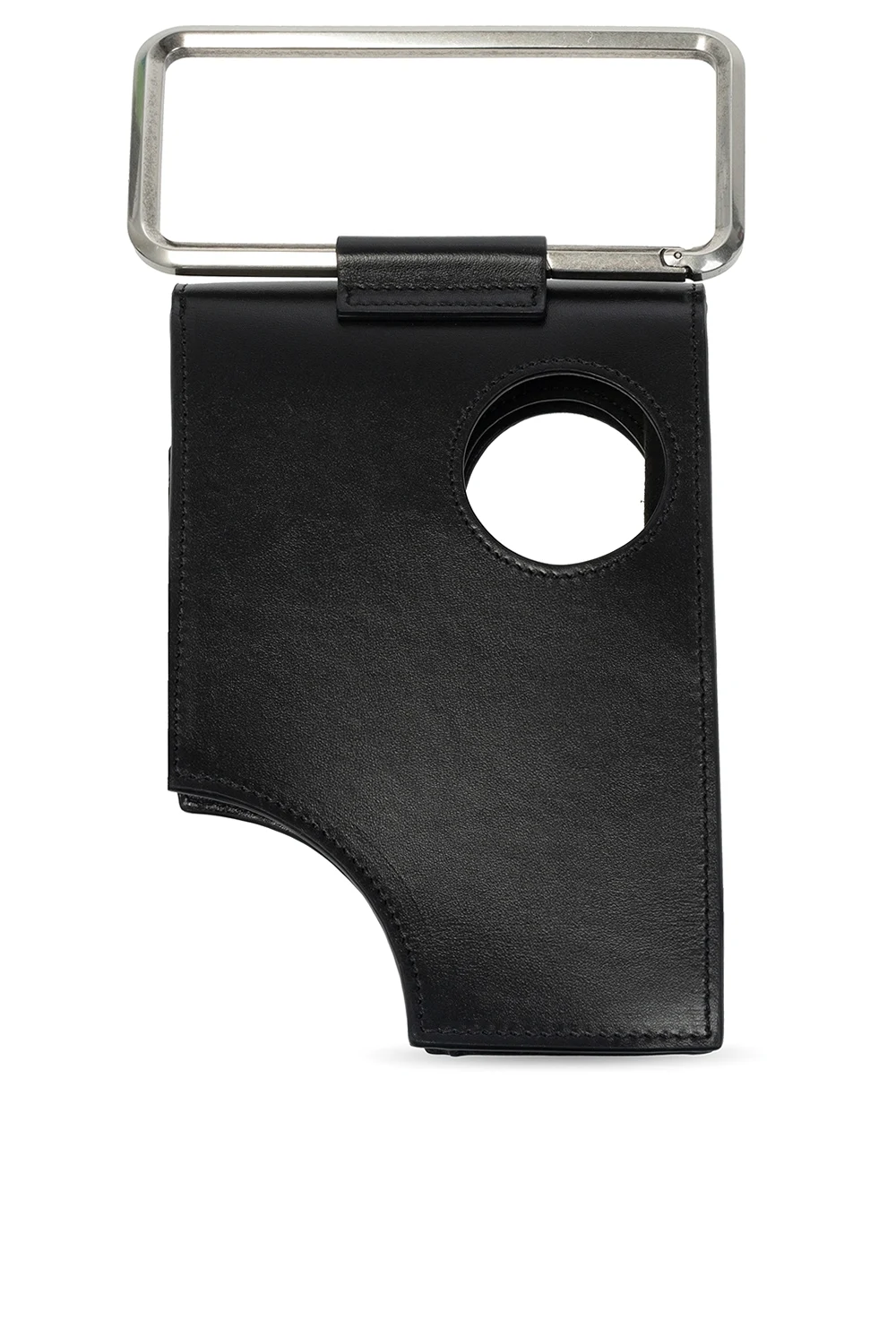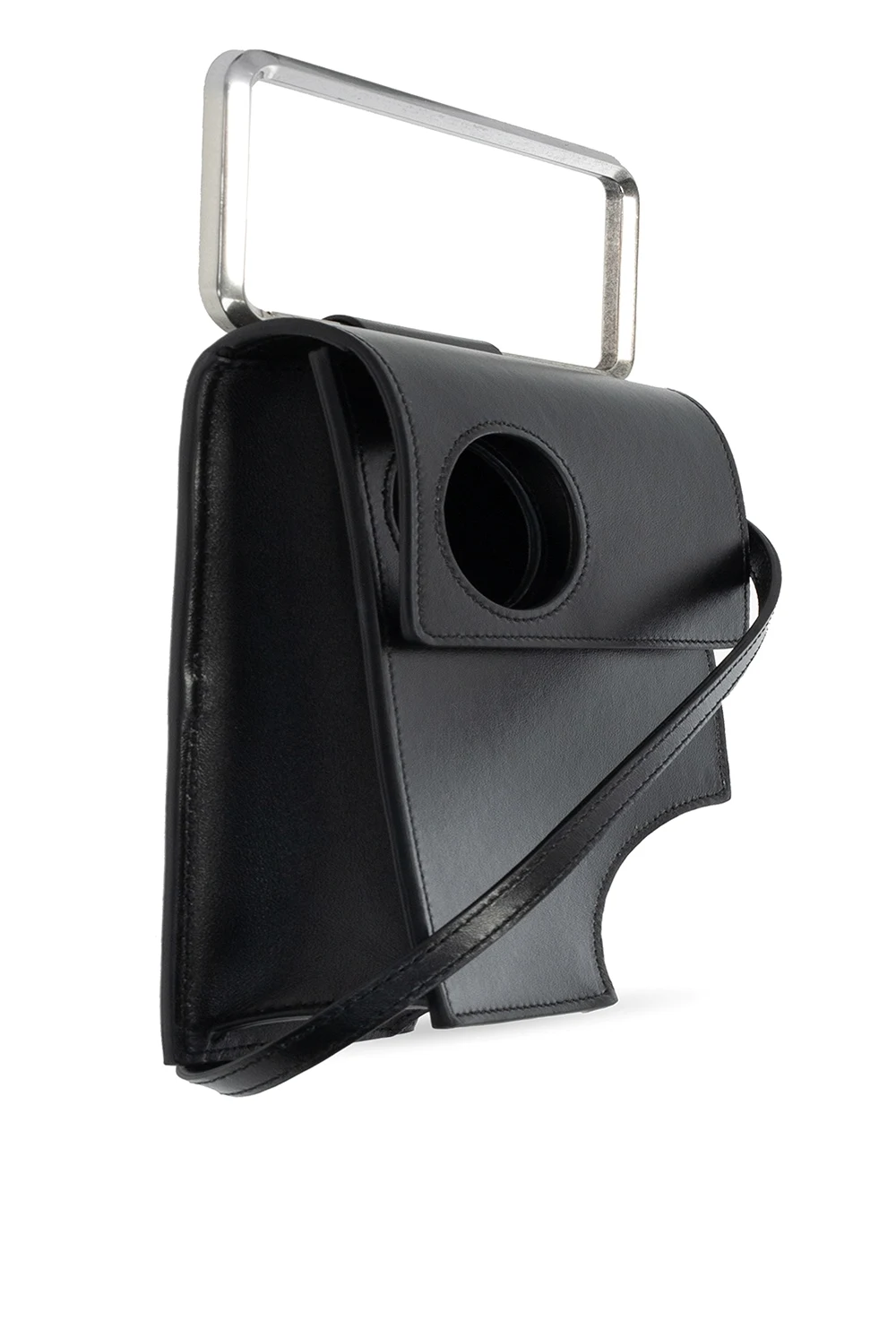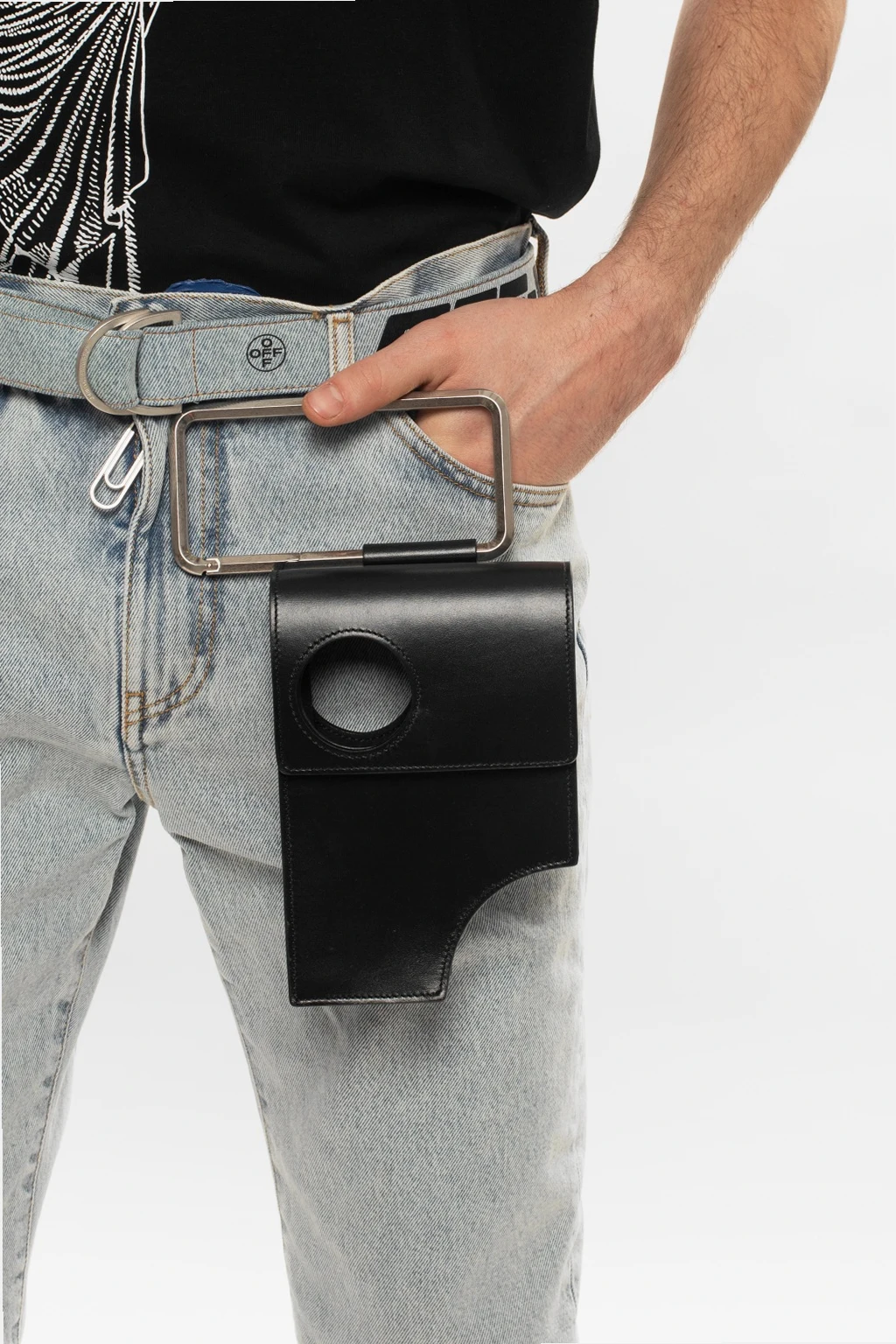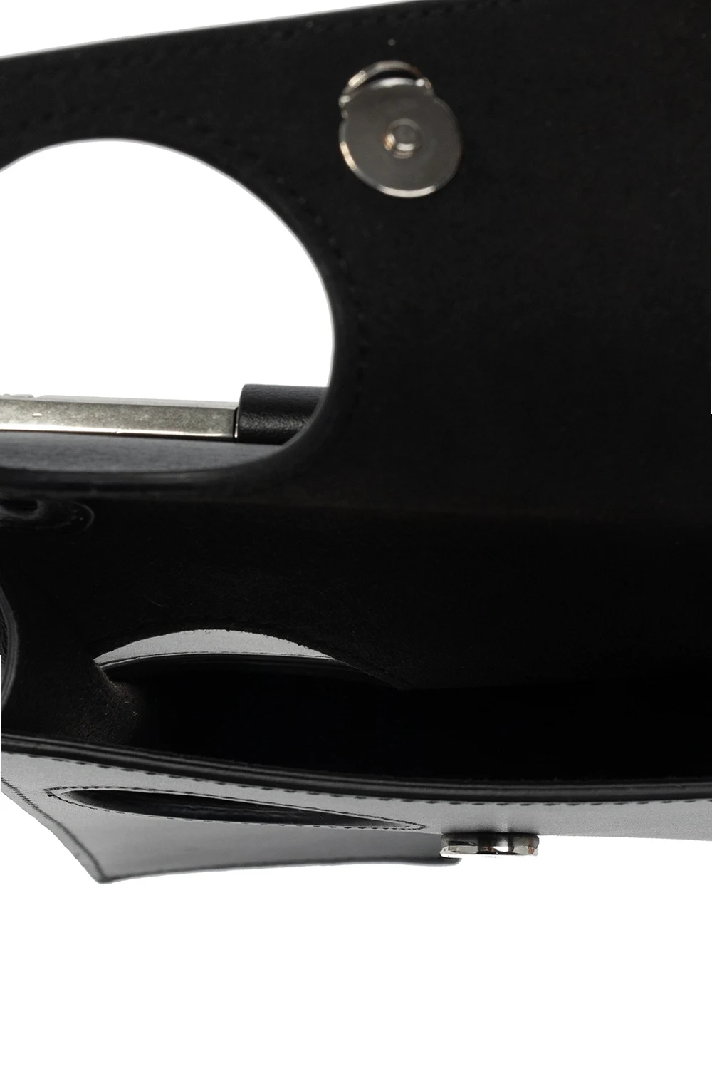 Black hand bag from Off-White. Crafted from leather, this design features a magnetic snap fastening, decorative logo-embossed handle, cut-out detail and one internal compartment.
