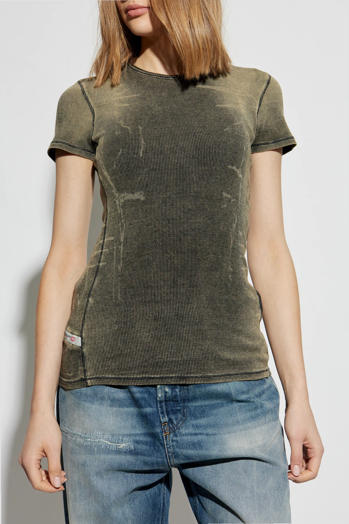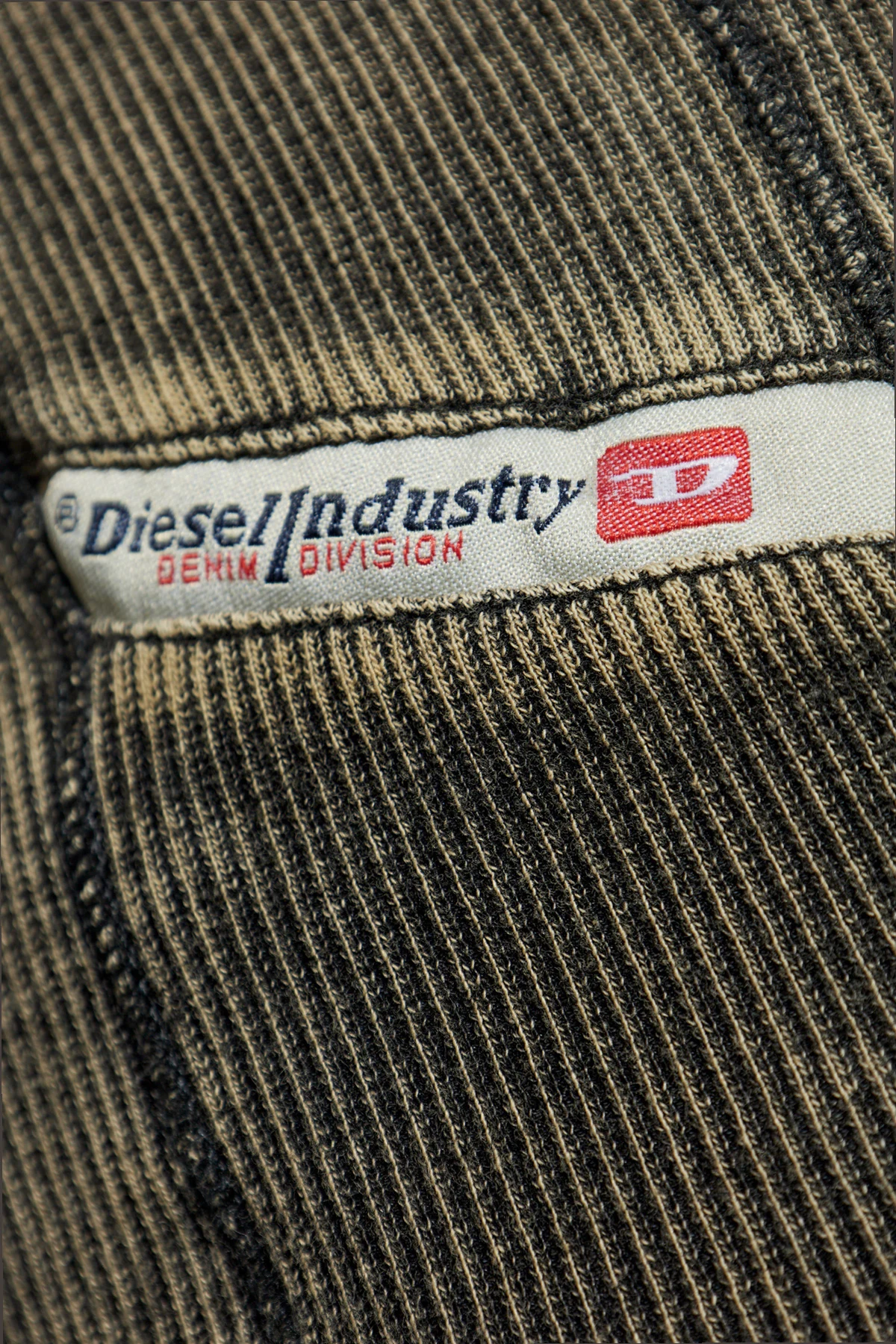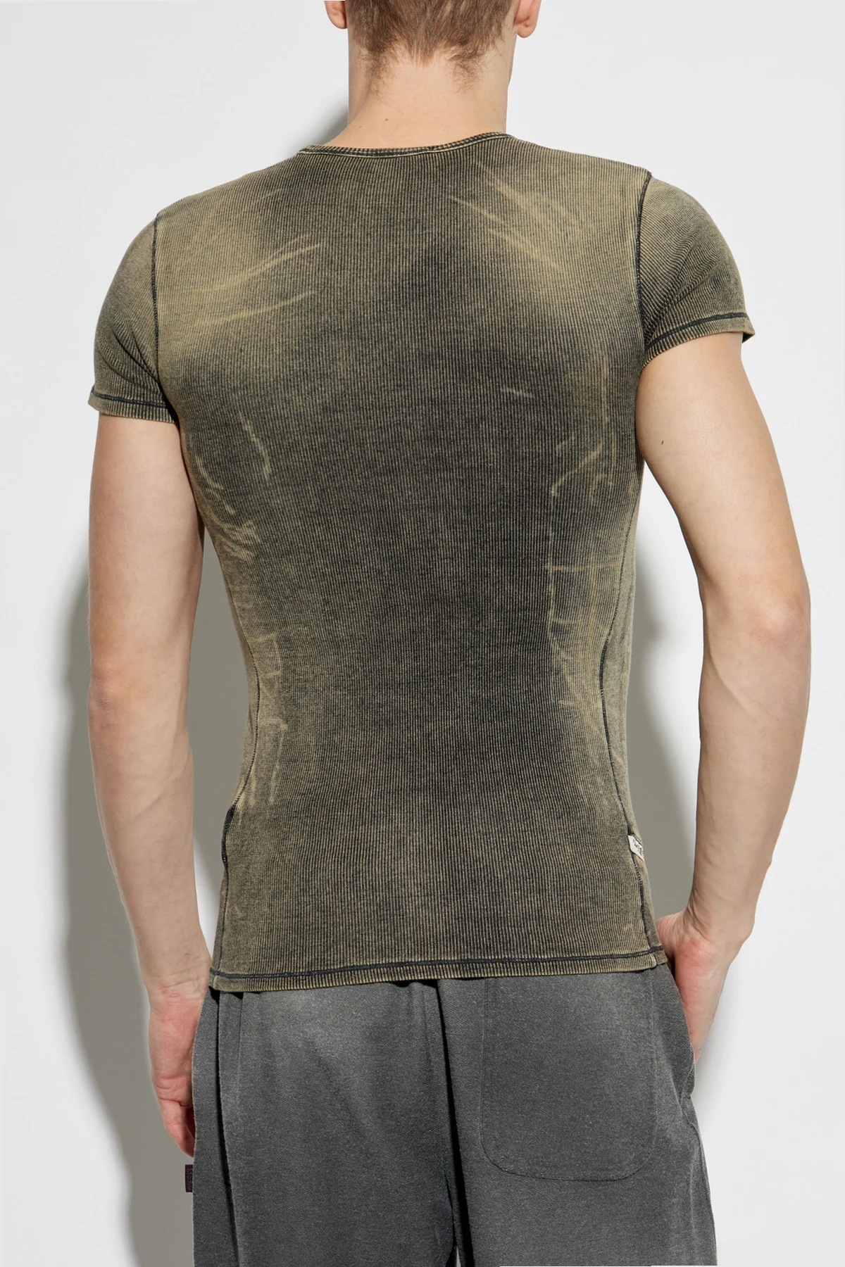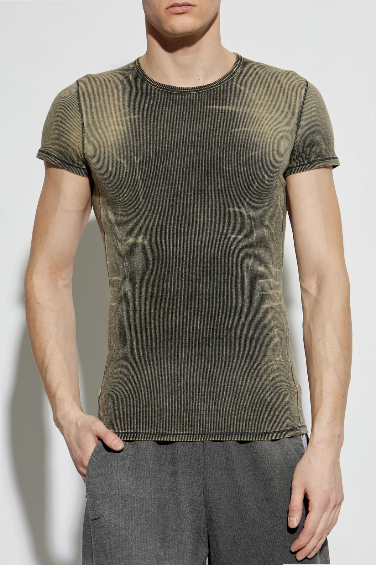 Introducing the Ribbed Top T-HANS by Diesel, a masterful blend of classic elegance and contemporary edge. This t-shirt is an embodiment of style, featuring a classic fit with short sleeves and a round neckline, artfully accentuating the physique with its ribbed texture. The top boasts a distinctive vintage-inspired distressed appearance, with a deep olive hue that exudes sophistication. The subtle ribbing adds depth and texture, enhancing the casual allure of this garment. Crafted from a premium blend of cotton and elastane, it promises both comfort and lasting quality. Embellished with the iconic \"Diesel Industry Denim Division\" patch in vivid red and white, this piece is a testament to authenticity and brand prestige. It is the quintessential wardrobe staple, effortlessly merging modern design with classic appeal. Dlaczego warto kupić ten produkt? Exclusive Design: Unique vintage look with a distressed finish. Premium Material: Crafted from high-quality cotton and elastane. Authenticity: Features the renowned Diesel logo patch. Versatile Fashion: Perfect for everyday wear with a touch of elegance.