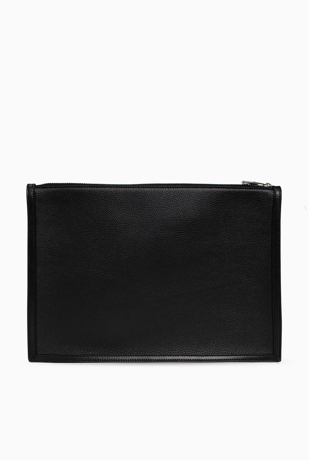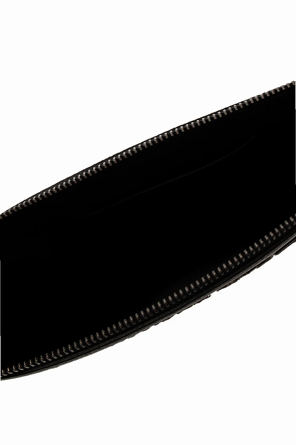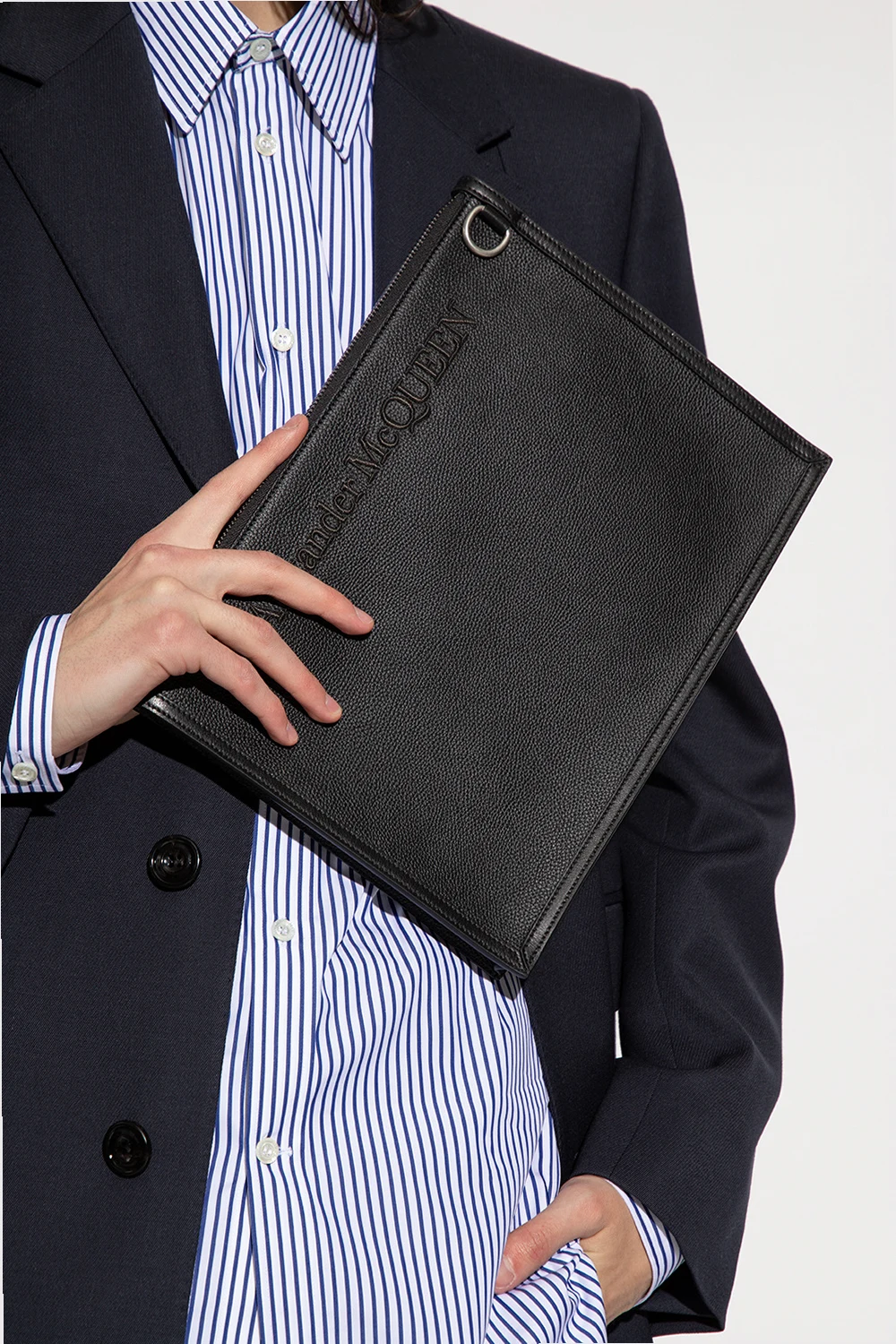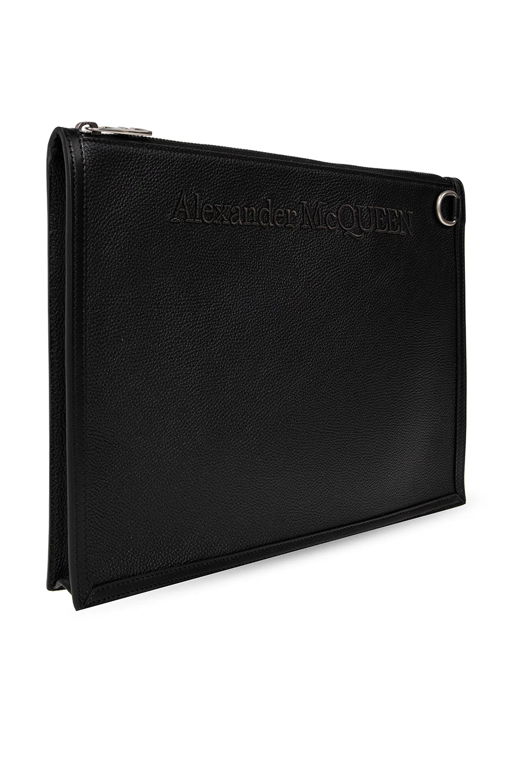 Black ‘Edge’ pouch from Alexander McQueen. Crafted from grained calf leather, this design features a zip fastening, an embroidered logo and silver-tone ‘D-Ring’ hardware on the front and one internal compartment with a card slot.