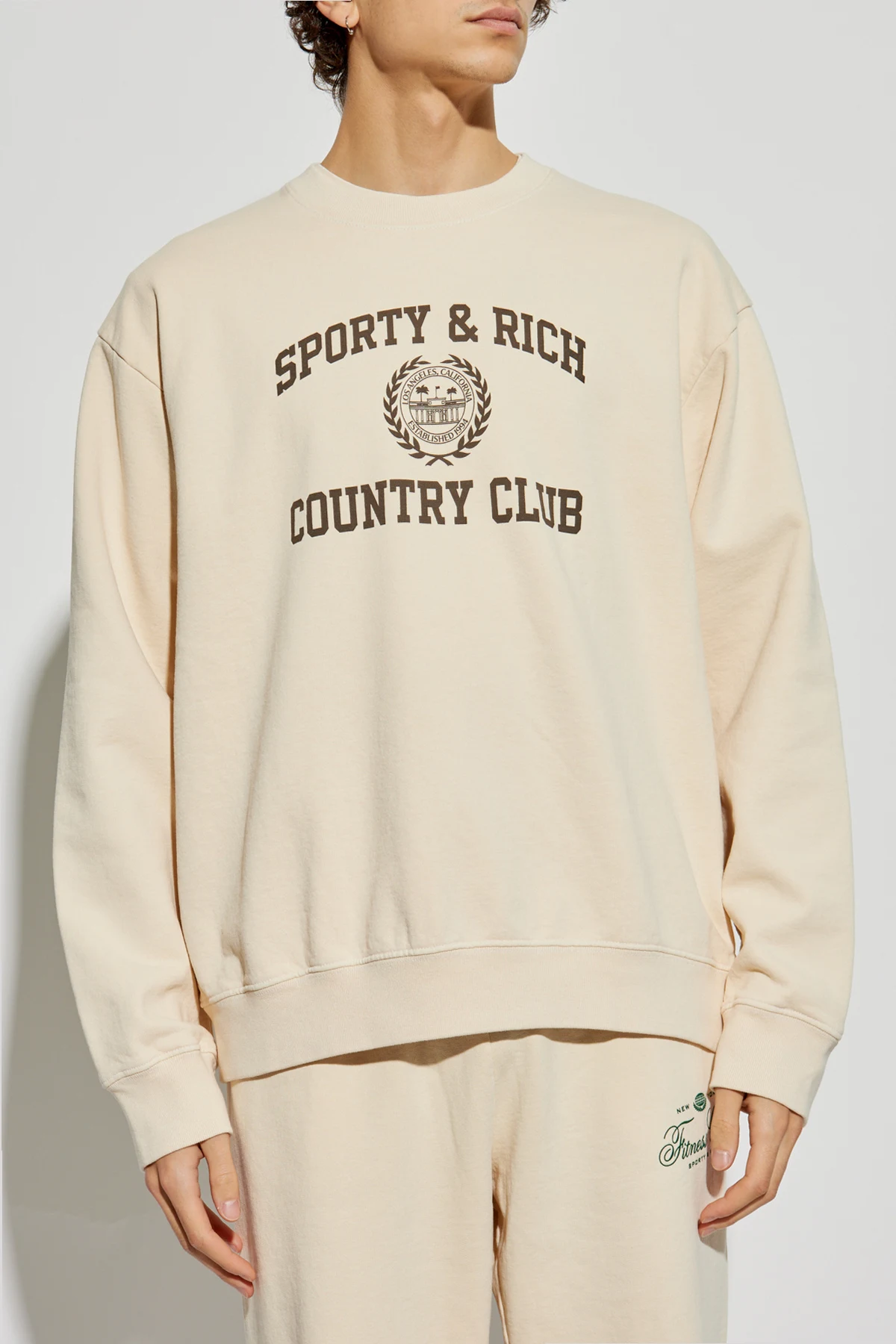 Introducing the Cream Sweatshirt from the exquisite \"Sporty & Rich Country Club\" collection, a paragon of sophistication and casual elegance. This unisex garment is crafted from luxurious 100% cotton, ensuring a soft and delightful touch. The sweatshirt boasts a classic crewneck design with long sleeves, complemented by ribbed cuffs and hem for a timeless fit. Its front is adorned with a dark print, featuring the inscription \"SPORTY & RICH COUNTRY CLUB\" alongside an emblem depicting a building, palm, and the words \"LOS ANGELES, CALIFORNIA ESTABLISHED 1994\" encircled by a laurel wreath. Sporty & Rich, conceived by the visionary Emily Oberg, is renowned for its vintage sportswear fused with understated luxury. This piece, like all their offerings, transcends fleeting trends, promising a chic presence both on and off the court. Why Choose This Product? Crafted from premium 100% cotton for unparalleled comfort. Timeless design suitable for various occasions. Distinctive emblem and inscription that exude sophistication. A perfect blend of vintage style and modern luxury.