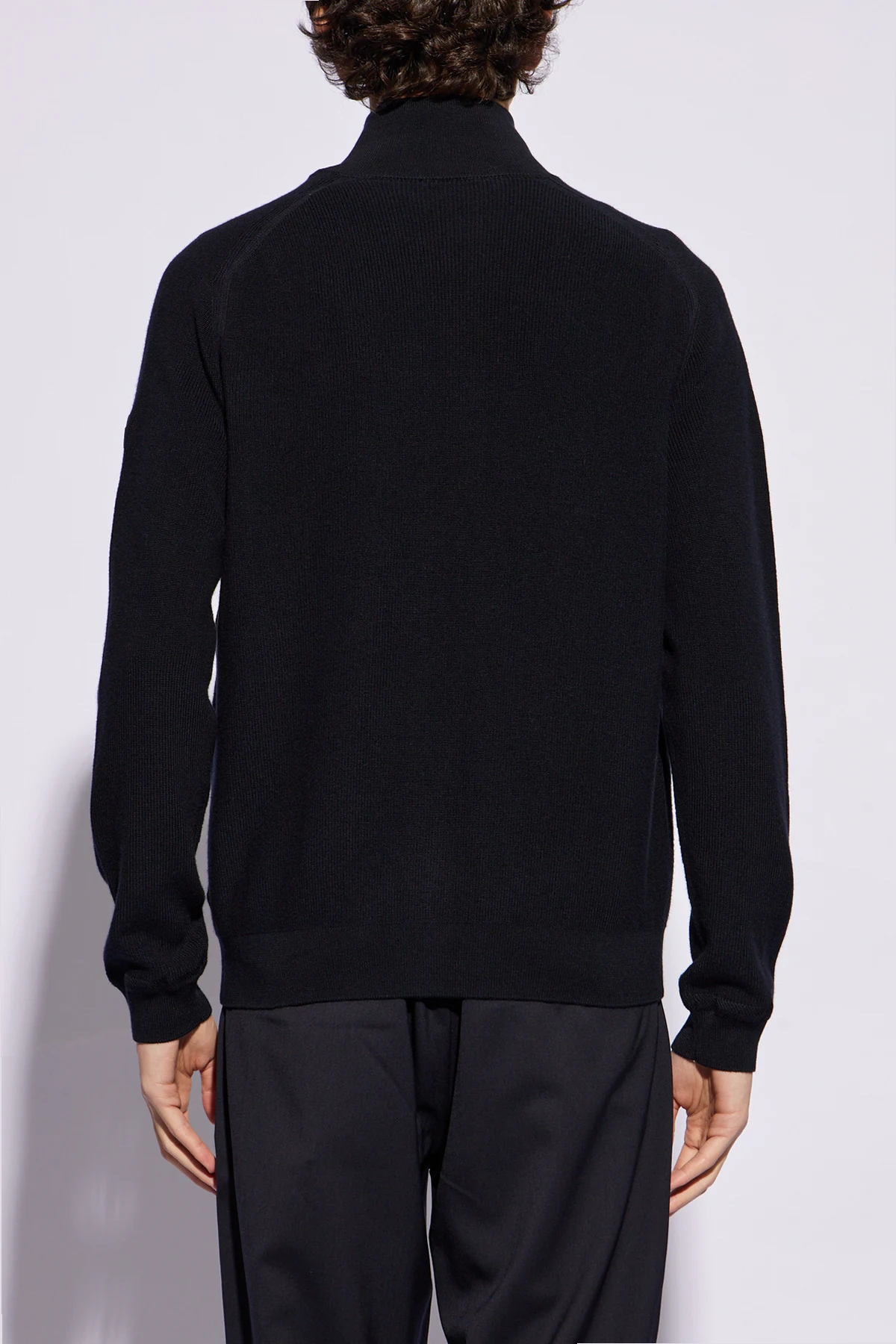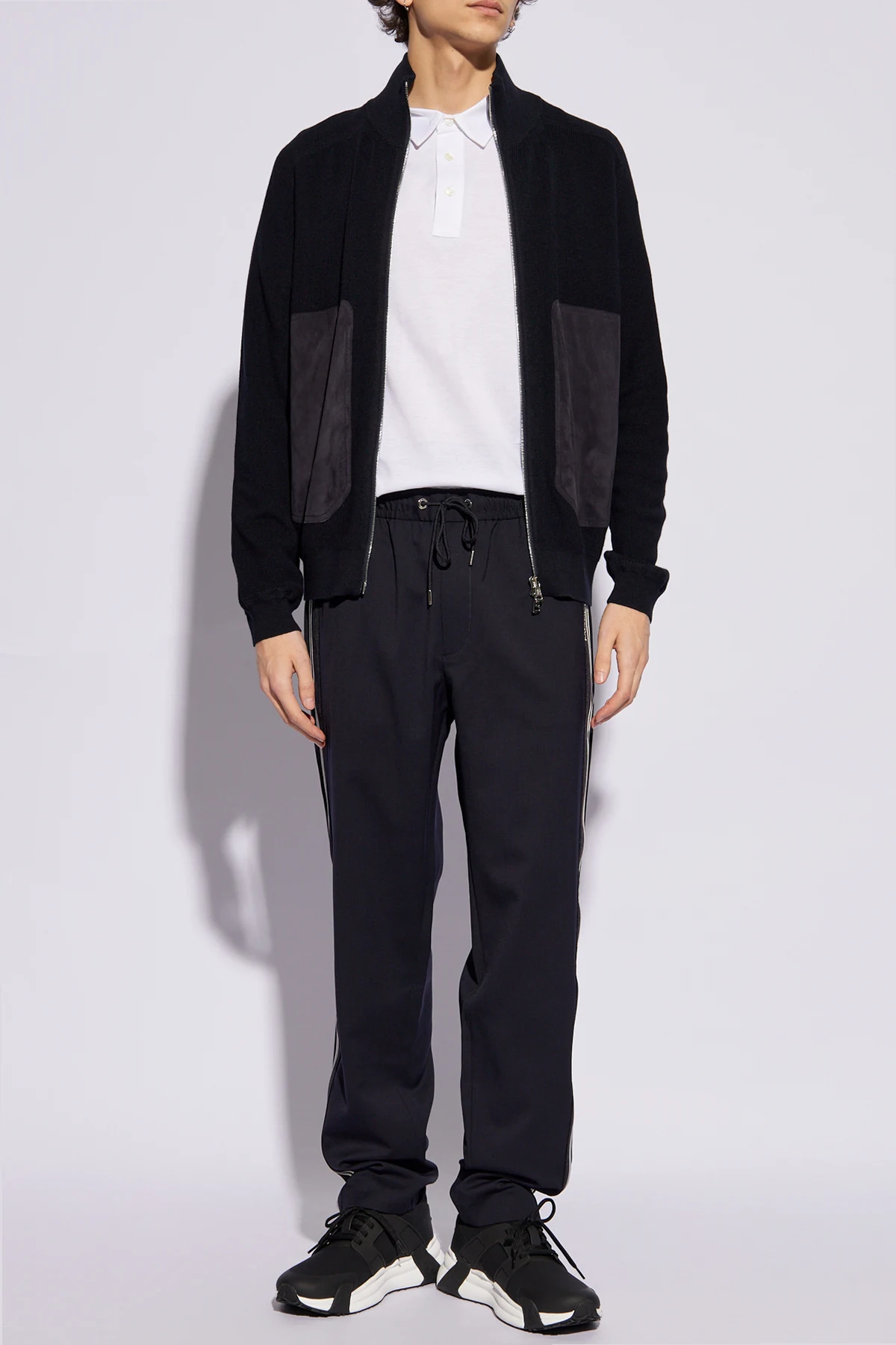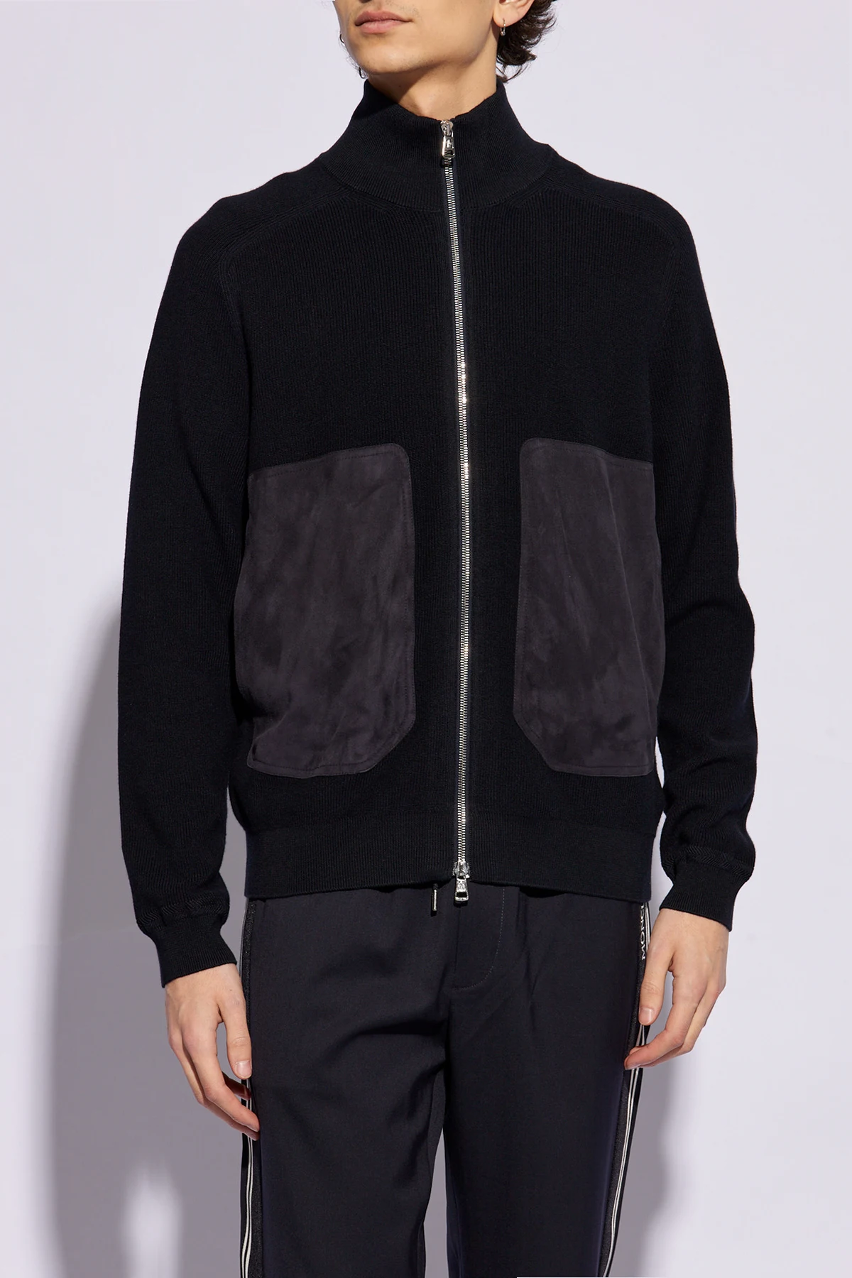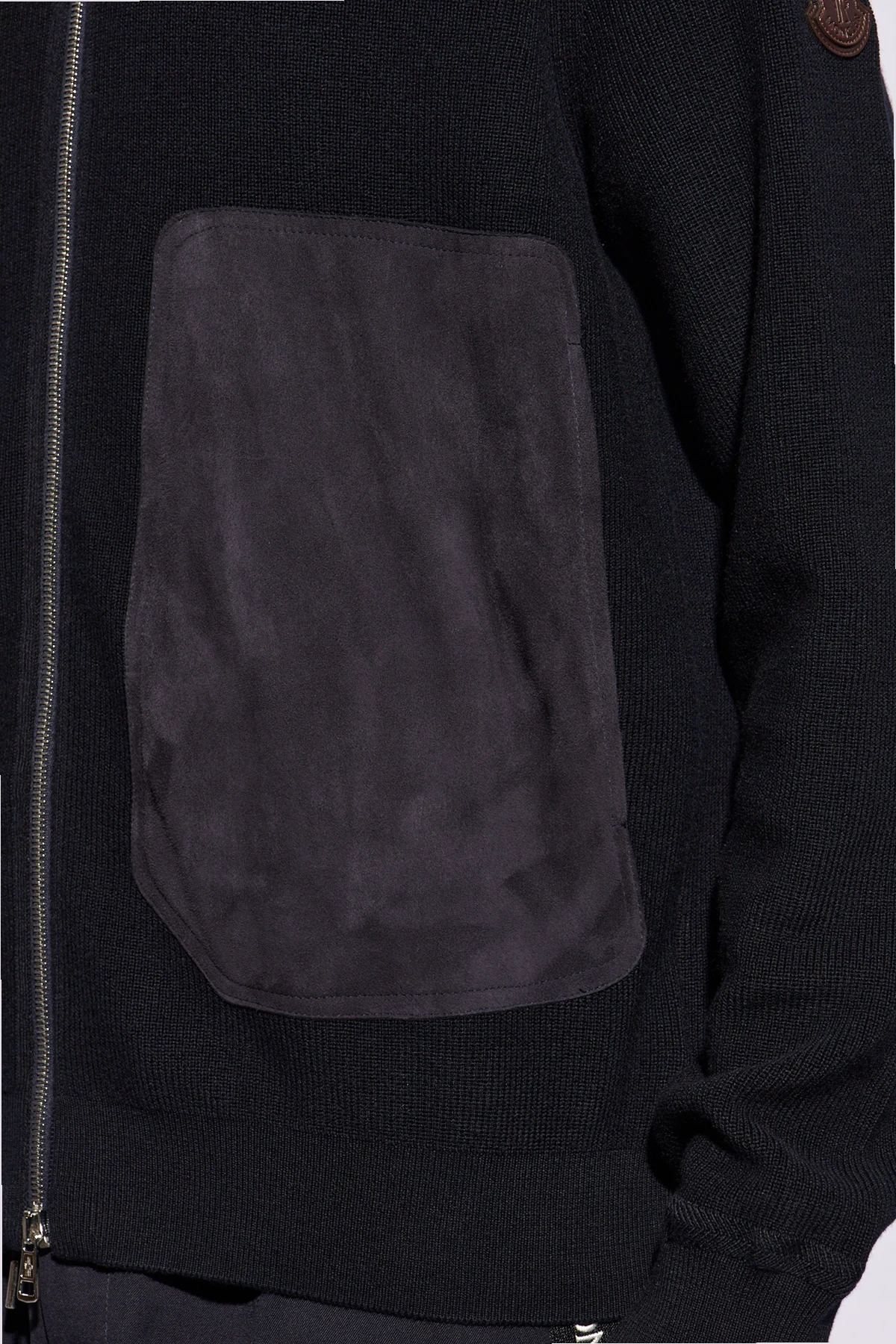 Navy blue cardigan from Moncler. Made from a cotton and cashmere blend, this style fastens via a two-way zip and features two frontal pockets trimmed with suede and long sleeves – one is accentuated with a logo patch.