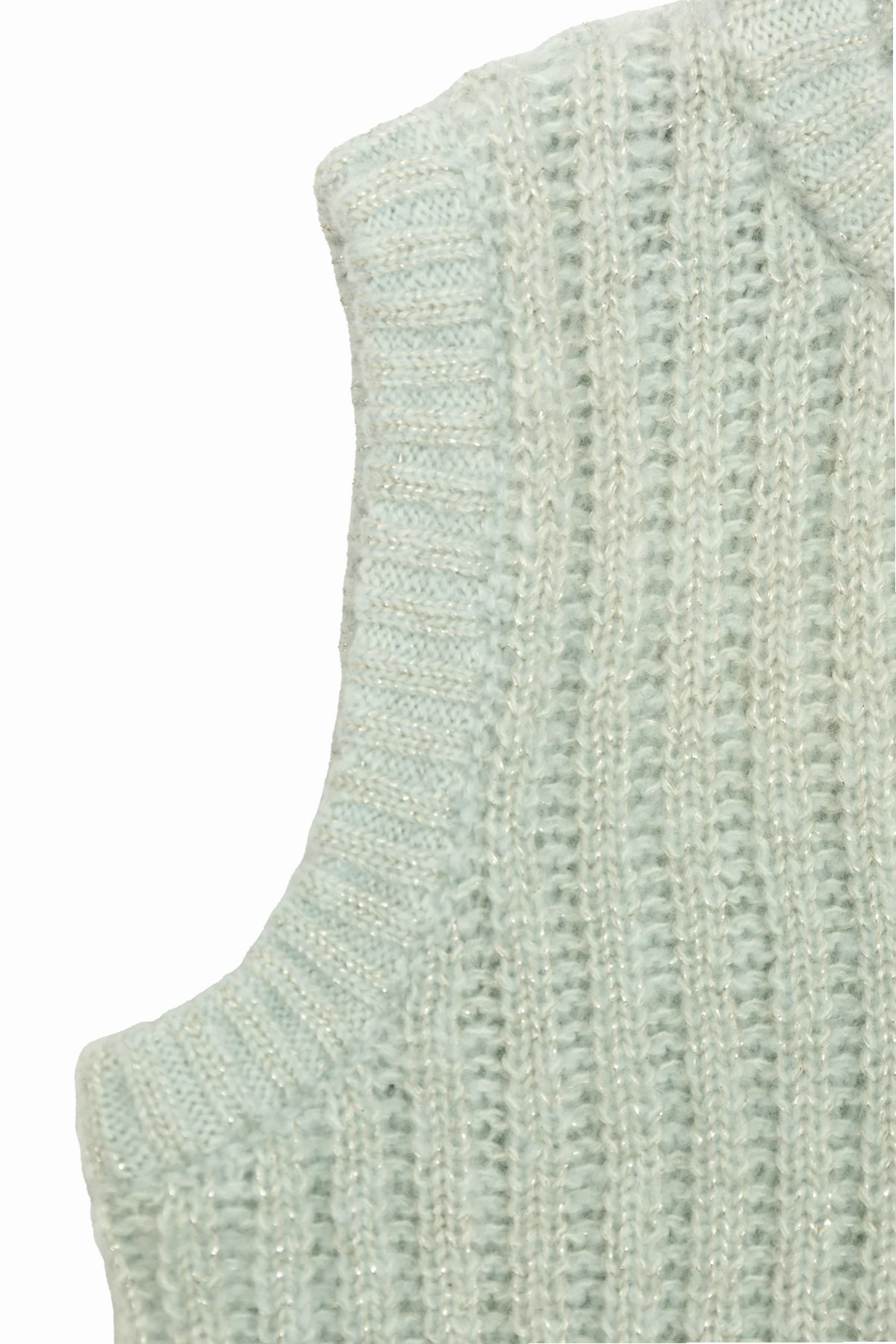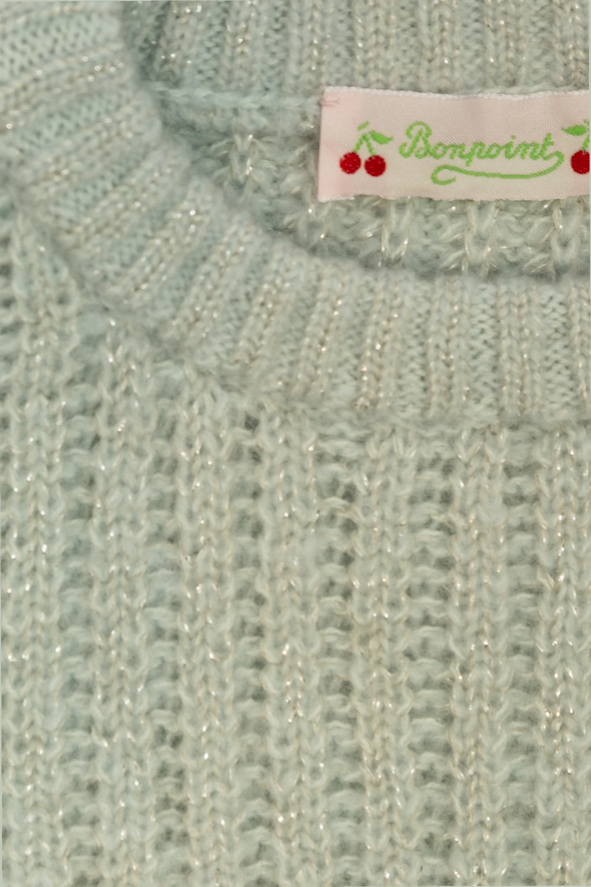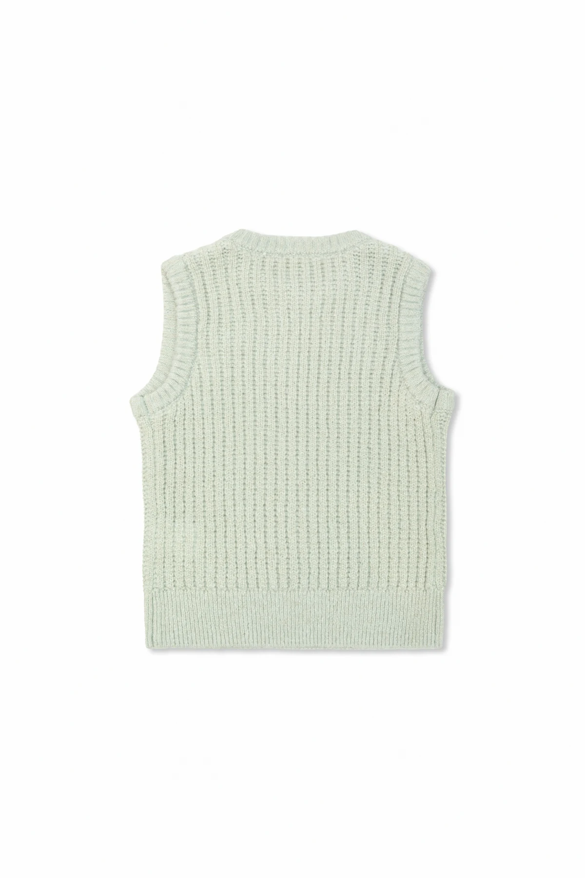 Introducing an exquisite addition to your young lady\'s wardrobe: the Bonpoint Woolen Vest in a serene light blue hue. Designed for girls aged 4-14, this sleeveless vest embodies timeless elegance with its classic, straightforward cut and delicate vertical striped texture. The blend of materials, 72% wool, 18% cashmere, 8% polyester, and 4% metallic thread, ensures both warmth and unparalleled softness, promising comfort in its wear. The vest\'s collar and edges are crafted with a ribbed finish, offering flexibility and a snug fit to the body. Its gentle light blue shade is accentuated with silver metallic threads, lending a touch of sparkle and sophistication to the piece. Additionally, the presence of a designer tag showcases the vest\'s authenticity and ties it back to Bonpoint, a label synonymous with luxury and exclusivity in children\'s fashion. Why Purchase This Product? Timeless design suitable for various occasions High-quality blend of wool and cashmere for warmth and comfort Unique silver metallic thread detailing for an elegant touch Authenticity guaranteed with the designer logo tag Perfect balance of style and practicality for children\'s fashion