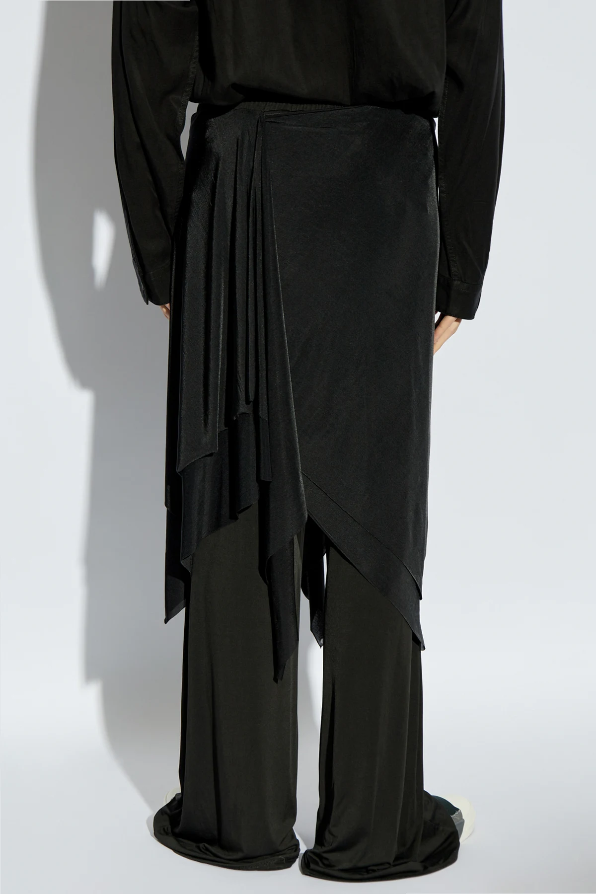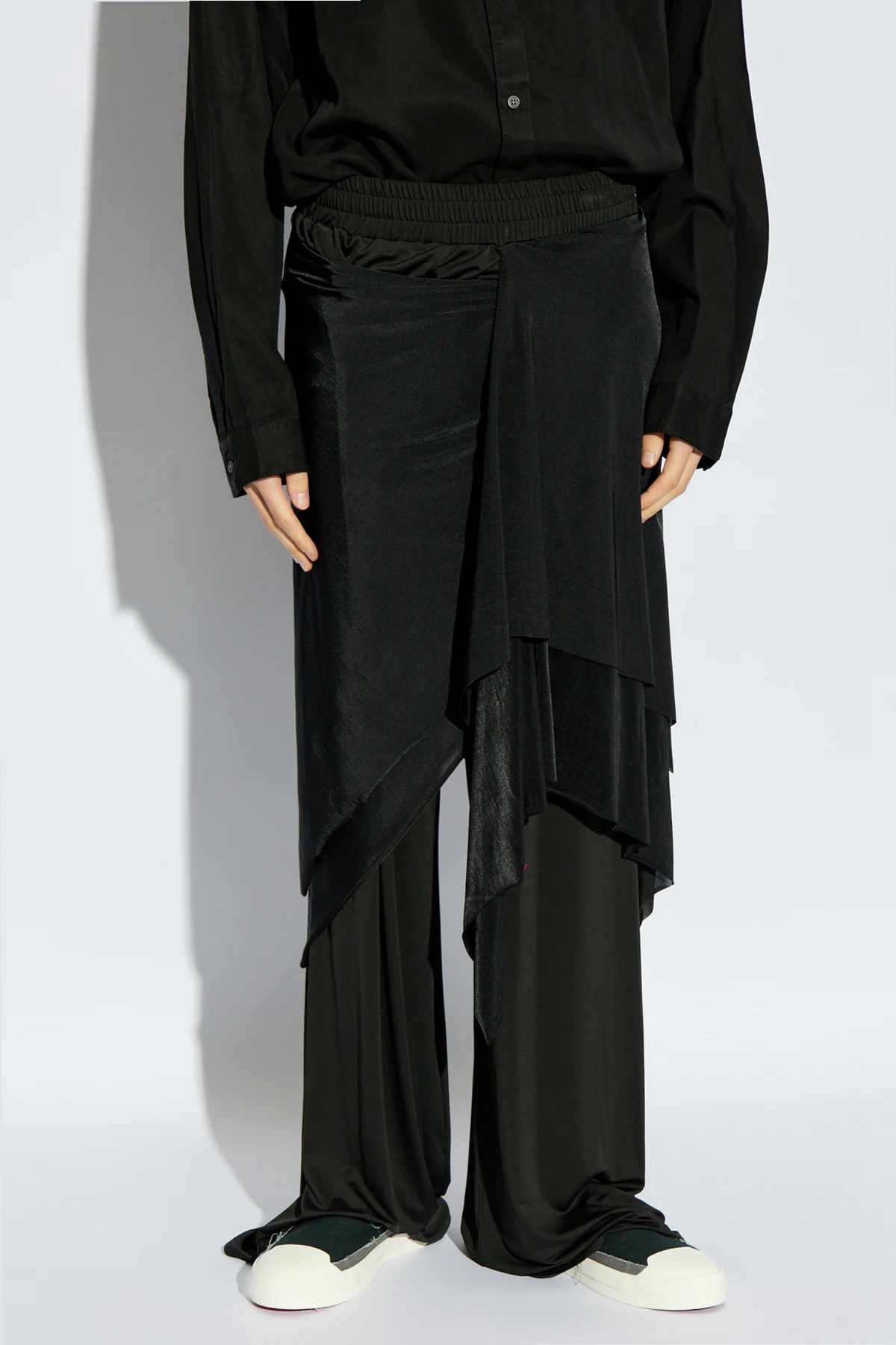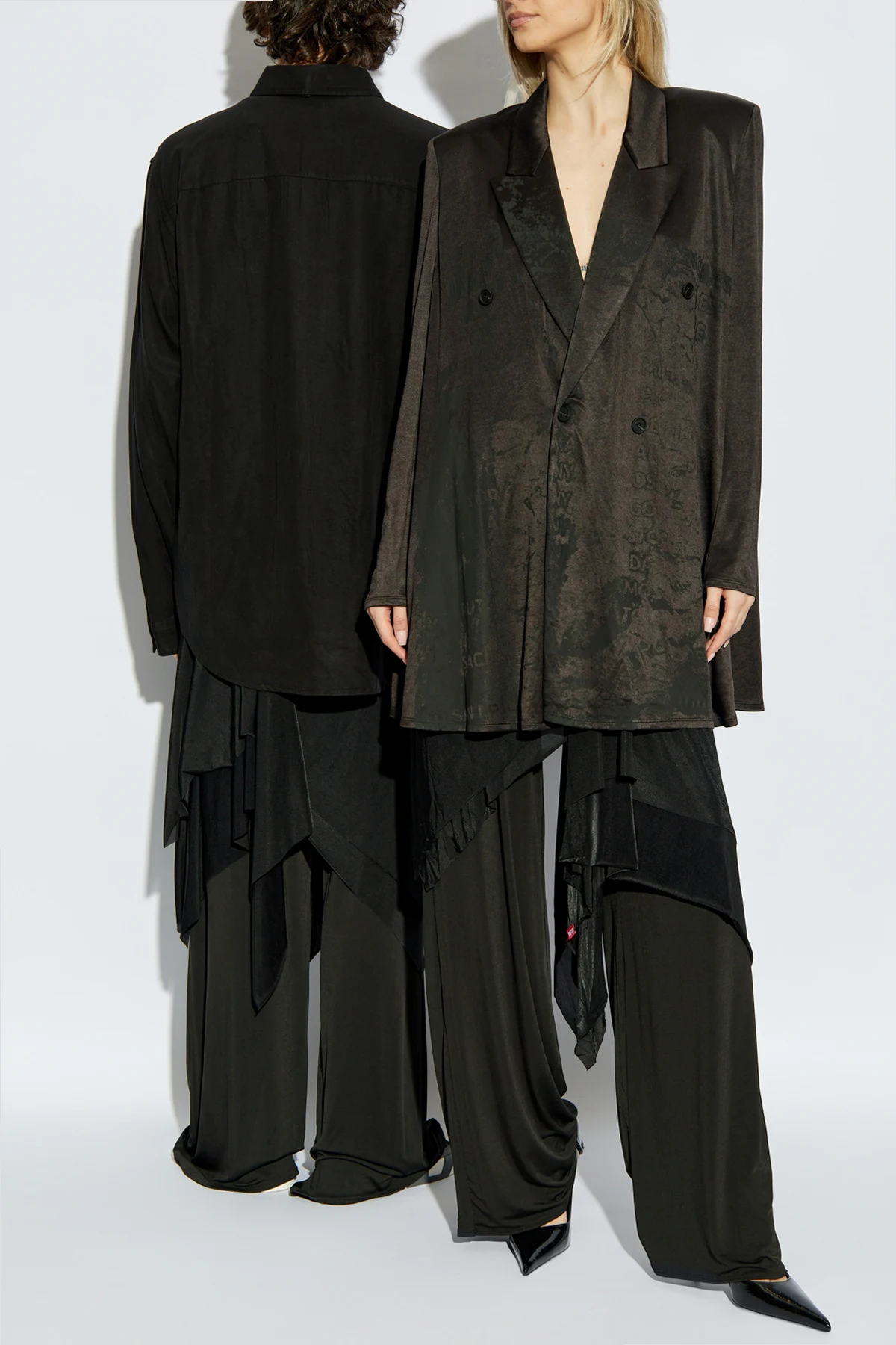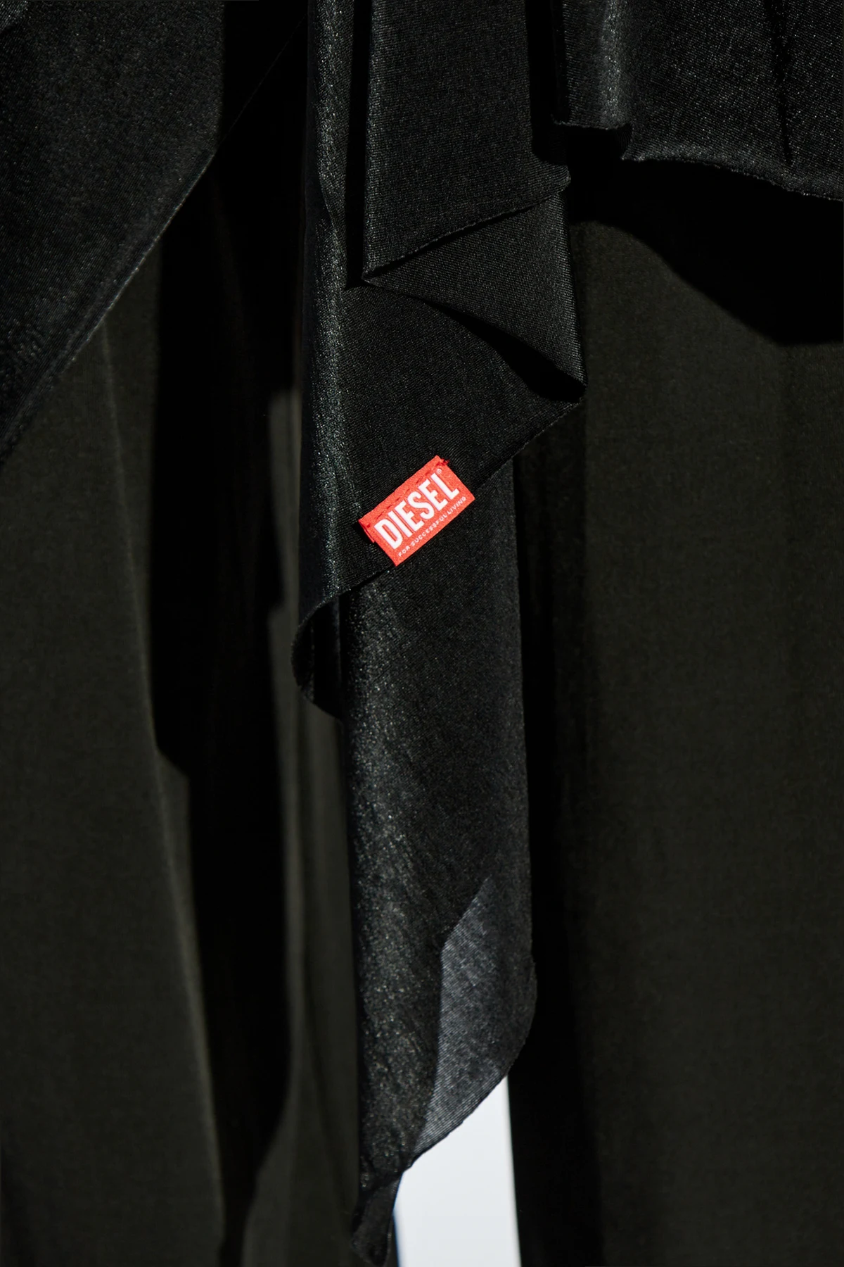 Introducing the exquisite P-FRIZZA-PLAIN pants from the illustrious Diesel collection, a paragon of sartorial elegance and contemporary design. These pants feature a loose fit with wide legs, accentuated by an asymmetrical, draped overlay that exudes a modern and original aesthetic. Crafted from a lightweight, breathable blend, these pants offer unparalleled comfort and freedom of movement. The dominant black hue imparts a timeless and versatile elegance, suitable for any sophisticated wardrobe. A subtle yet striking detail, the small, red \"DIESEL\" label, discreetly adorns the garment, adding a touch of designer flair. Designed as a unisex piece, these pants are perfect for creating casual yet trendy ensembles, suitable for both men and women. Why Choose These Pants? Exquisite design by renowned Italian brand Diesel. Unisex style, offering versatility for all. Comfortable, breathable material for ease of wear. Fashion-forward draped asymmetric overlay. Timeless black color for easy pairing.