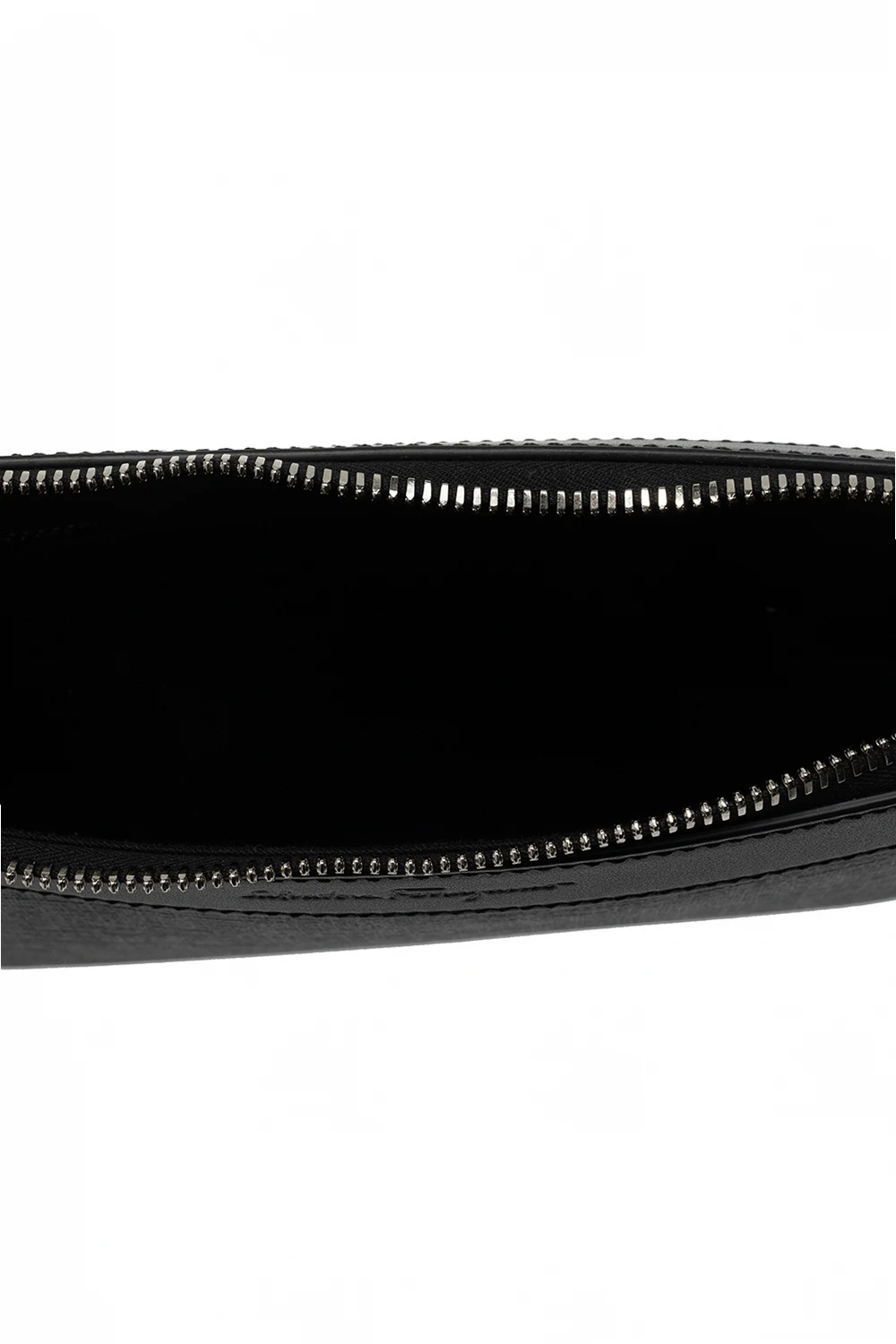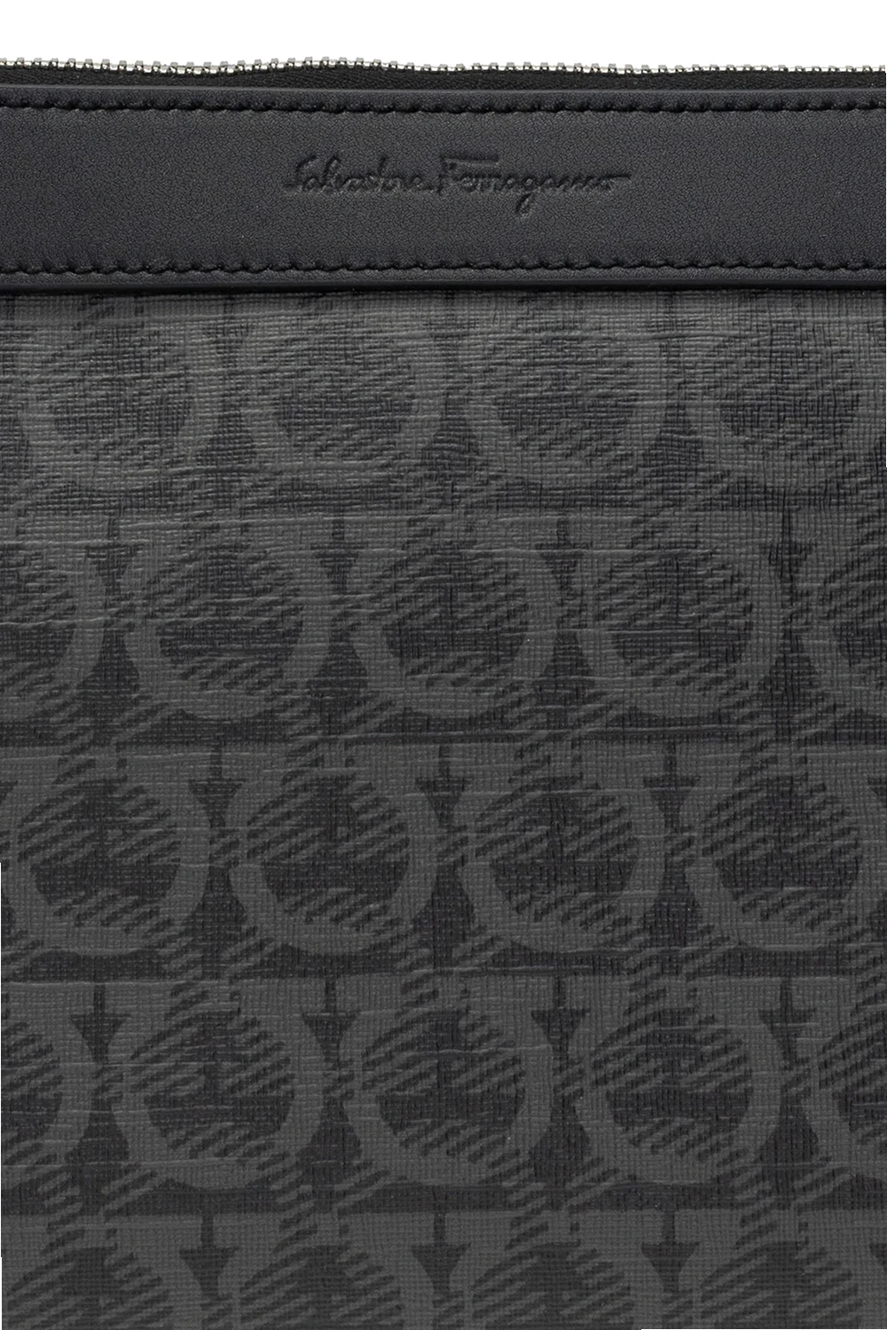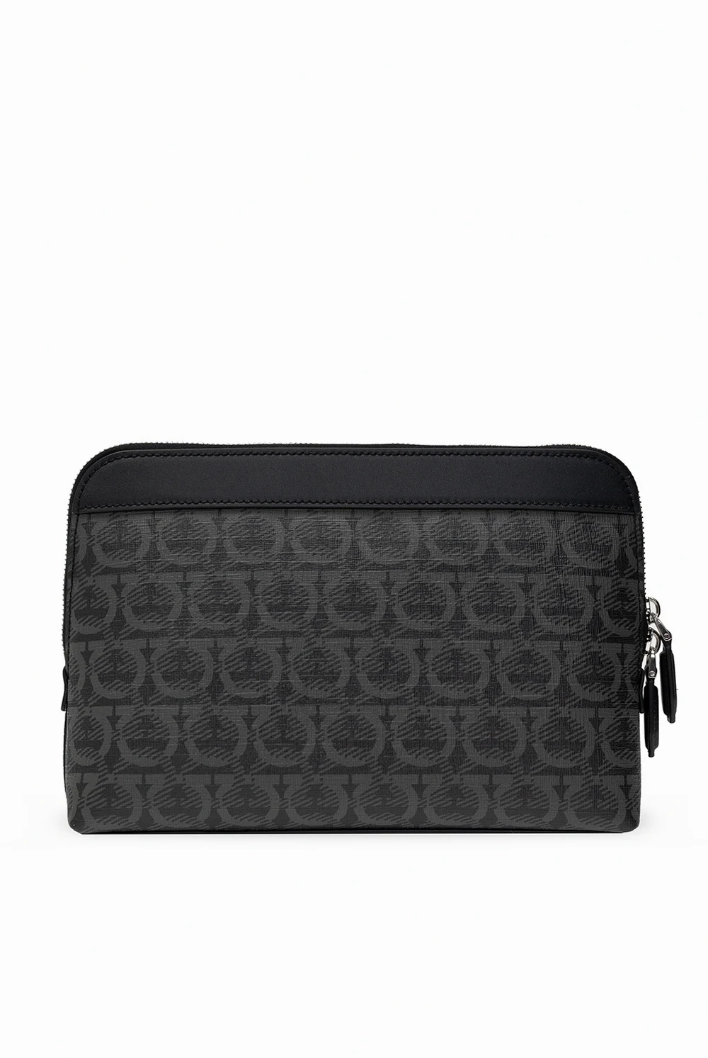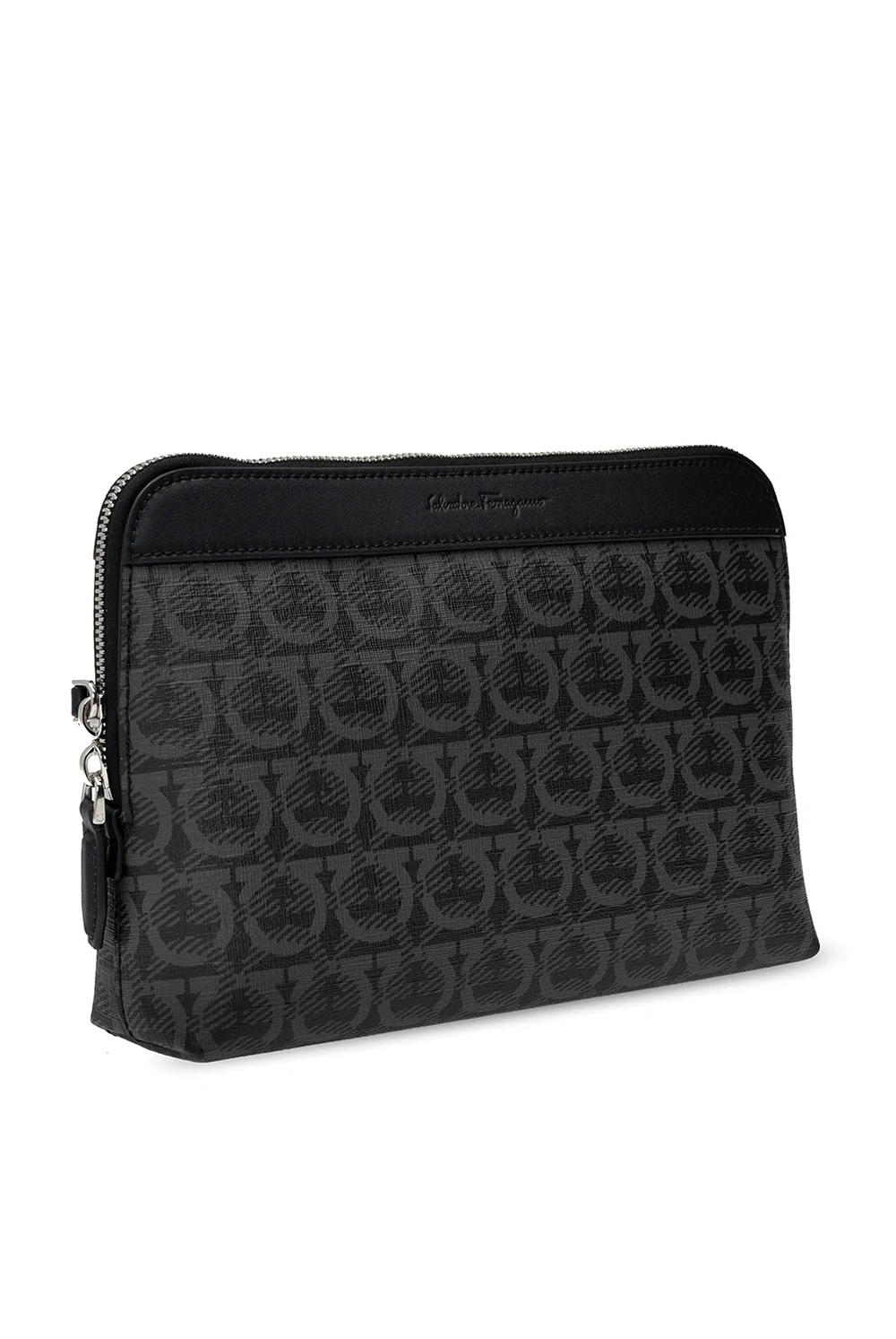 Grey and black clutch from Salvatore Ferragamo. Crafted from textured canvas with a logo print, this design fastens via a two-way zip and features calf leather trims and interior with one compartment, one slip pocket and one zip pocket.