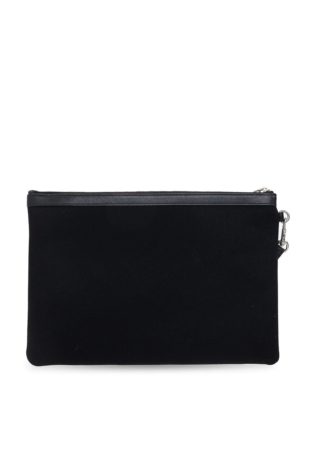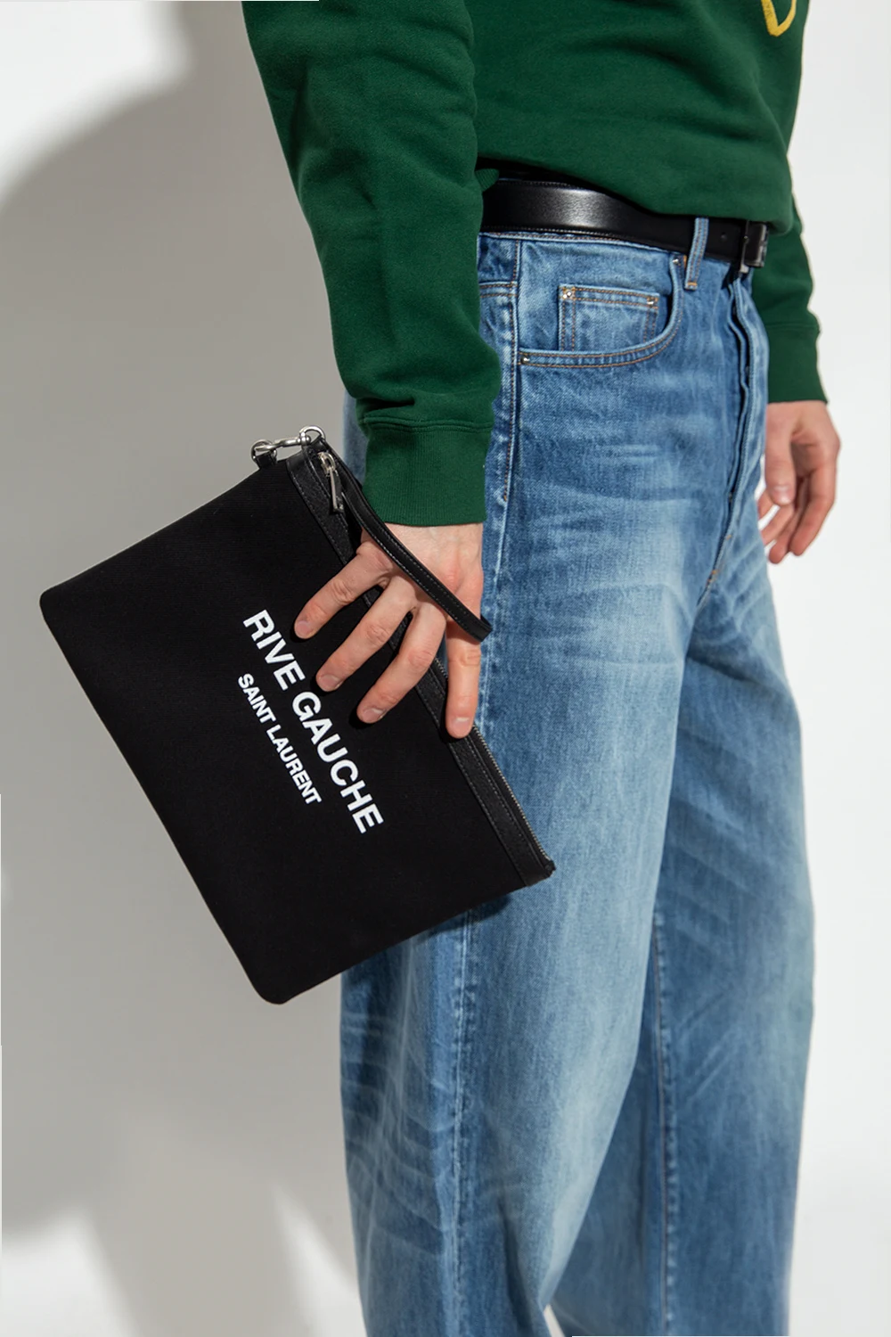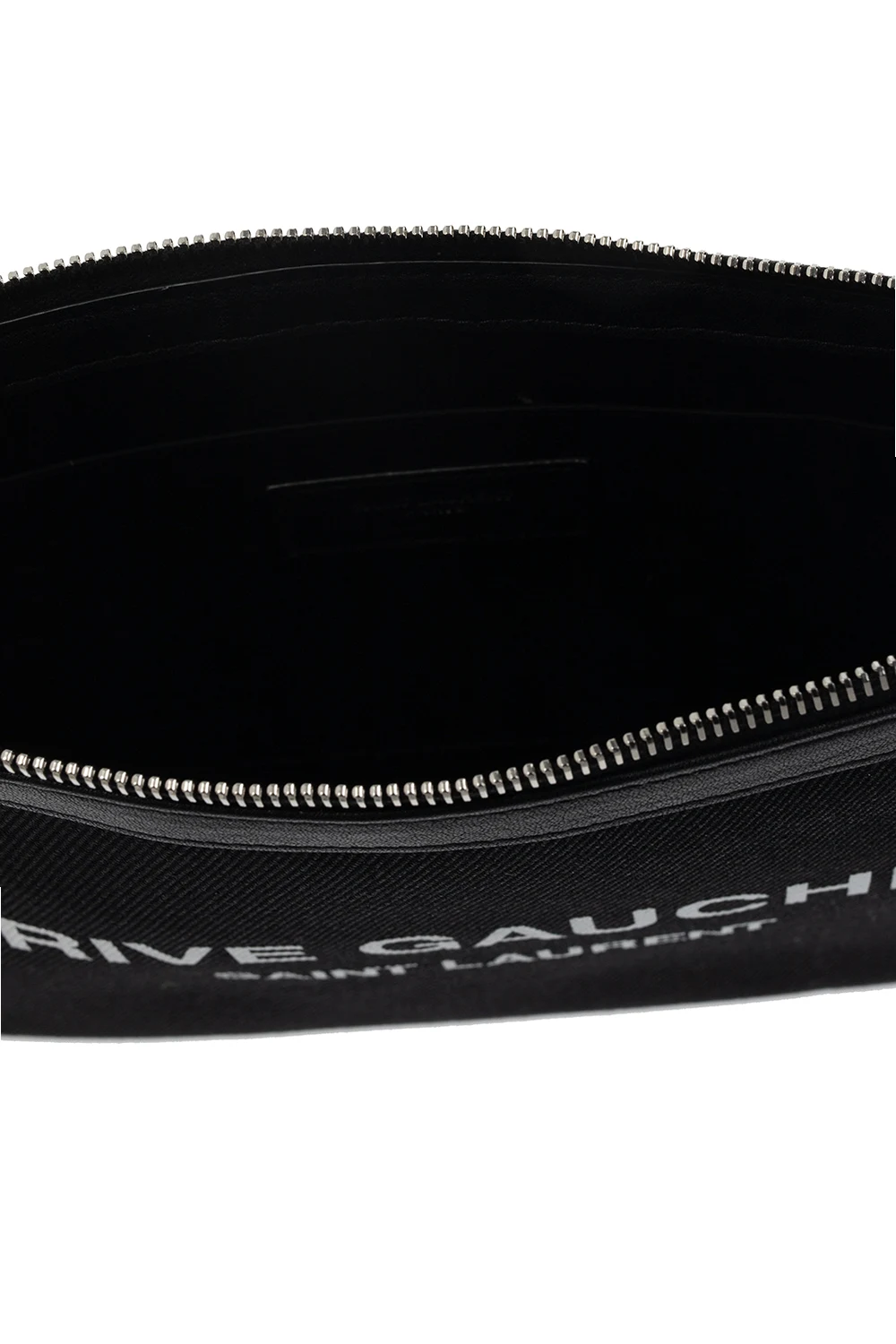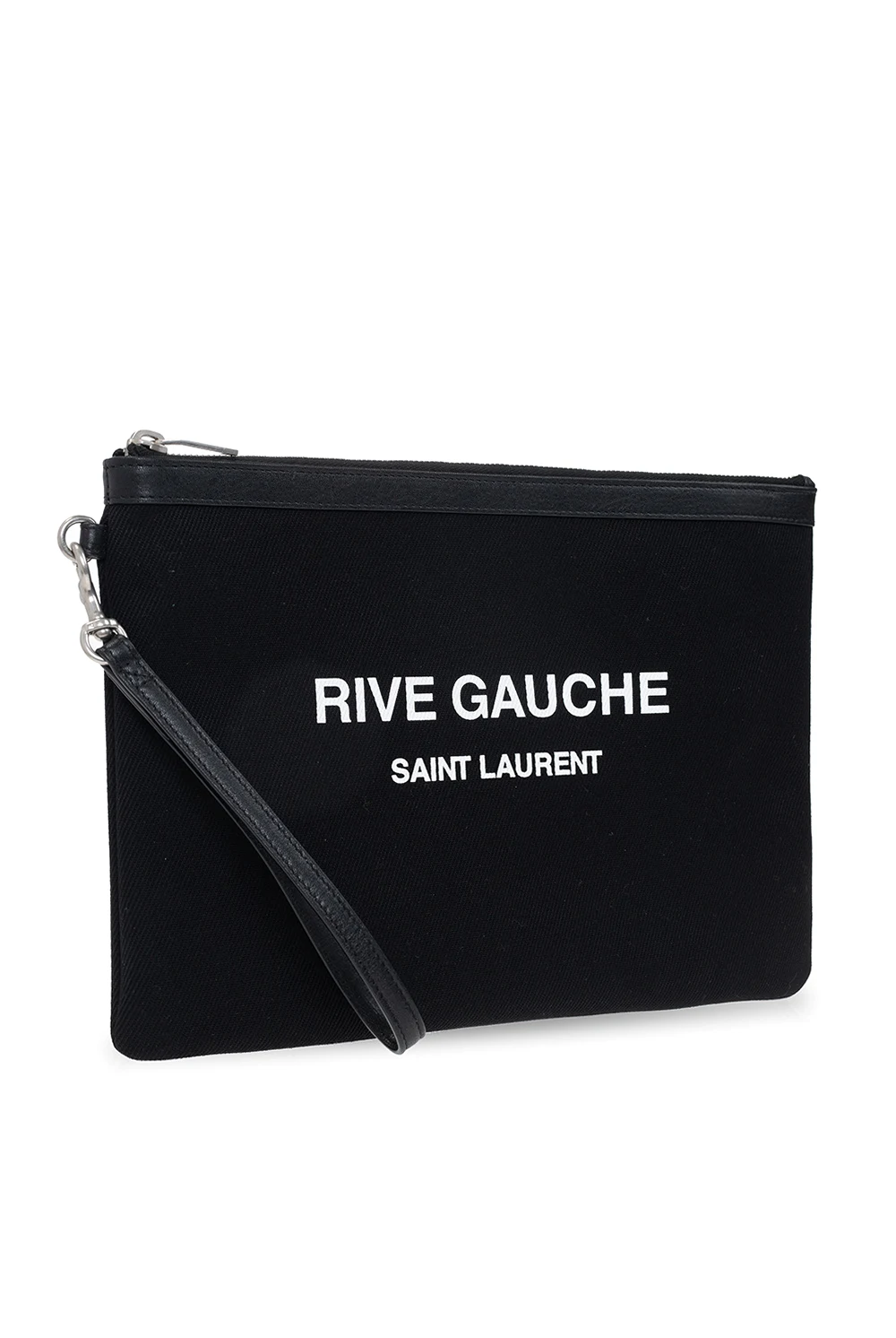 Black Saint Laurent handbag. Made of cotton. Decorated with a white logo print. Wrist belt. One compartment and two slip pockets inside. Metal elements in gray. Black leather finish.