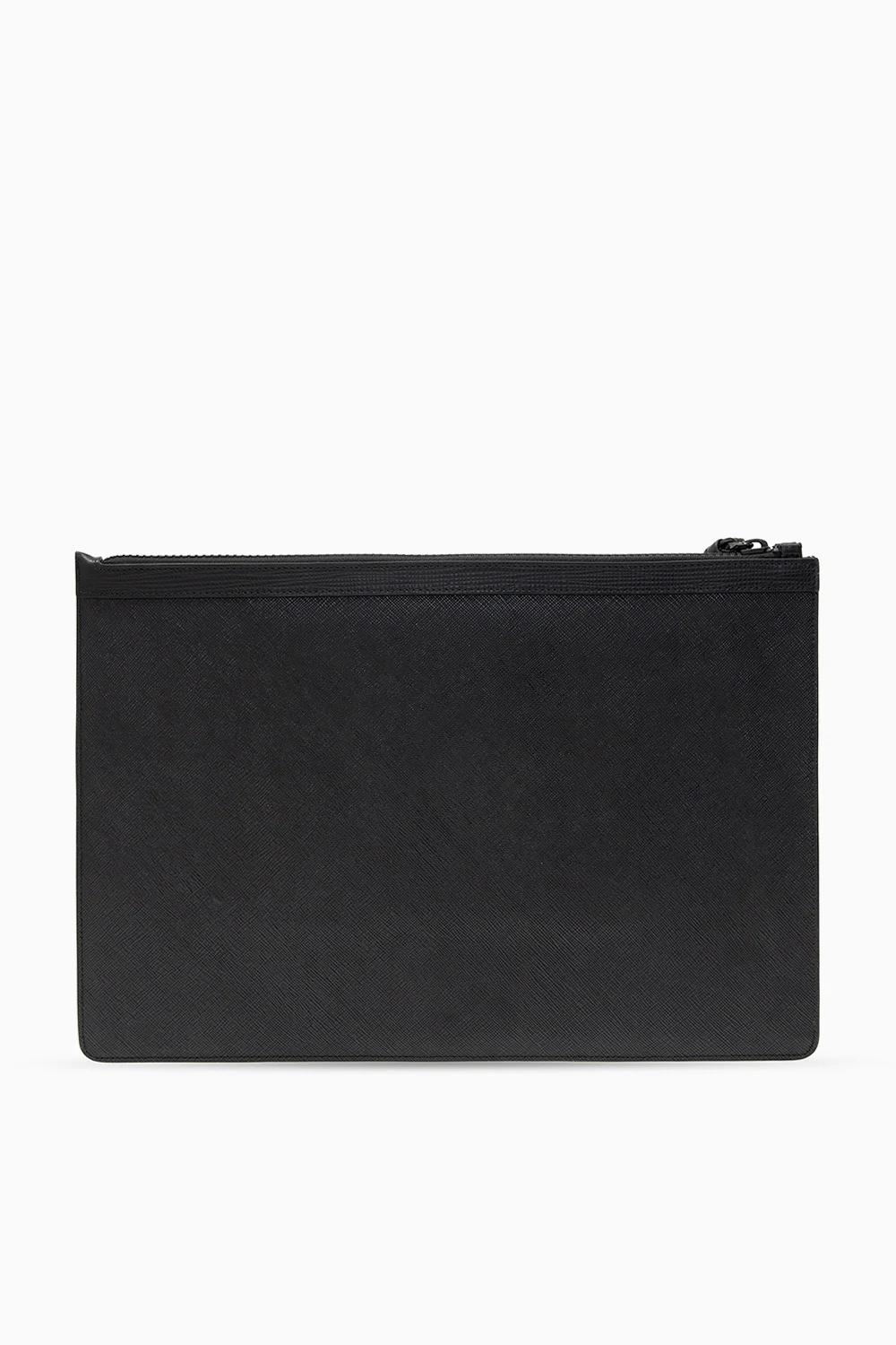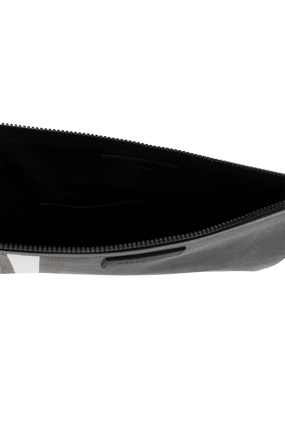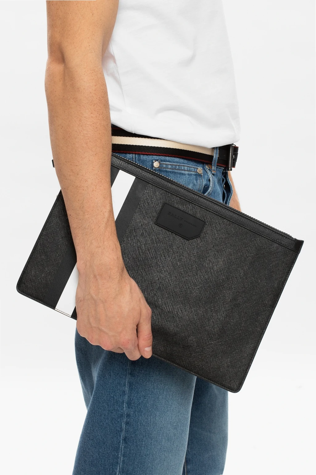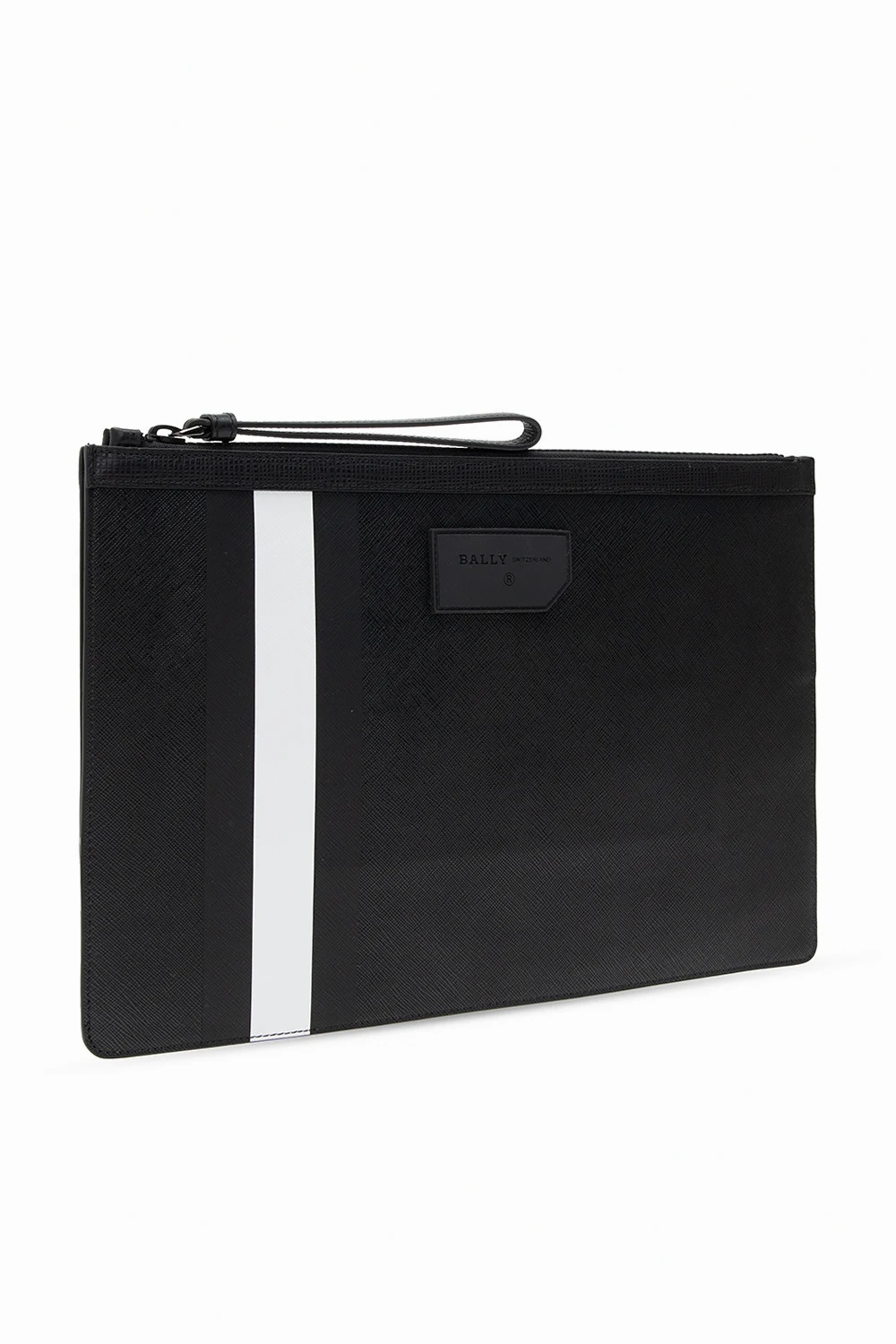 Black hand bag from Bally. Emblazoned with a logo-embossed patch and a black and white stripe, which is highly recognisable for the brand, this design fastens via a zip and employs black metal hardware and interior with one compartment, two slip pockets and one zipped pocket.