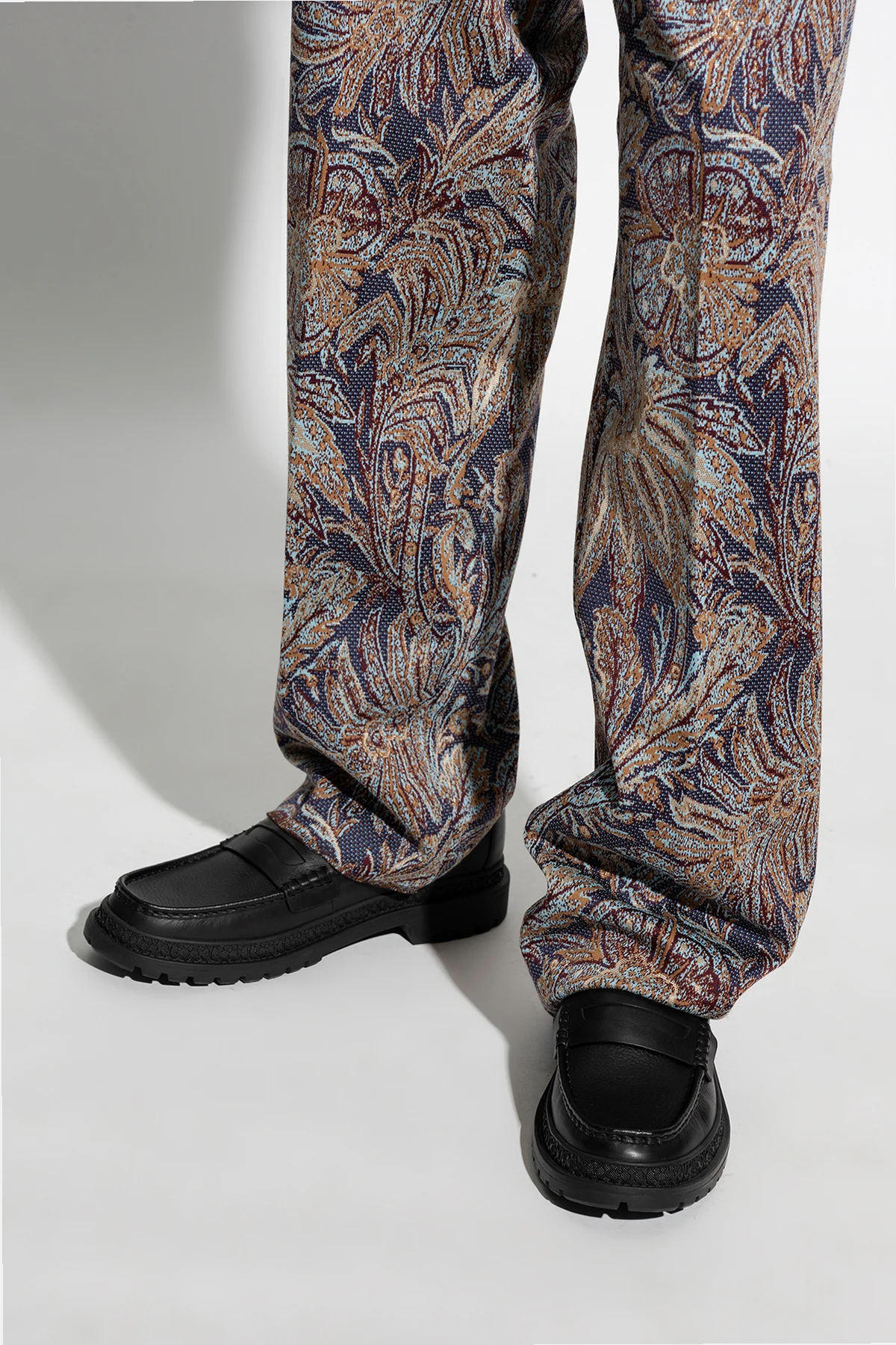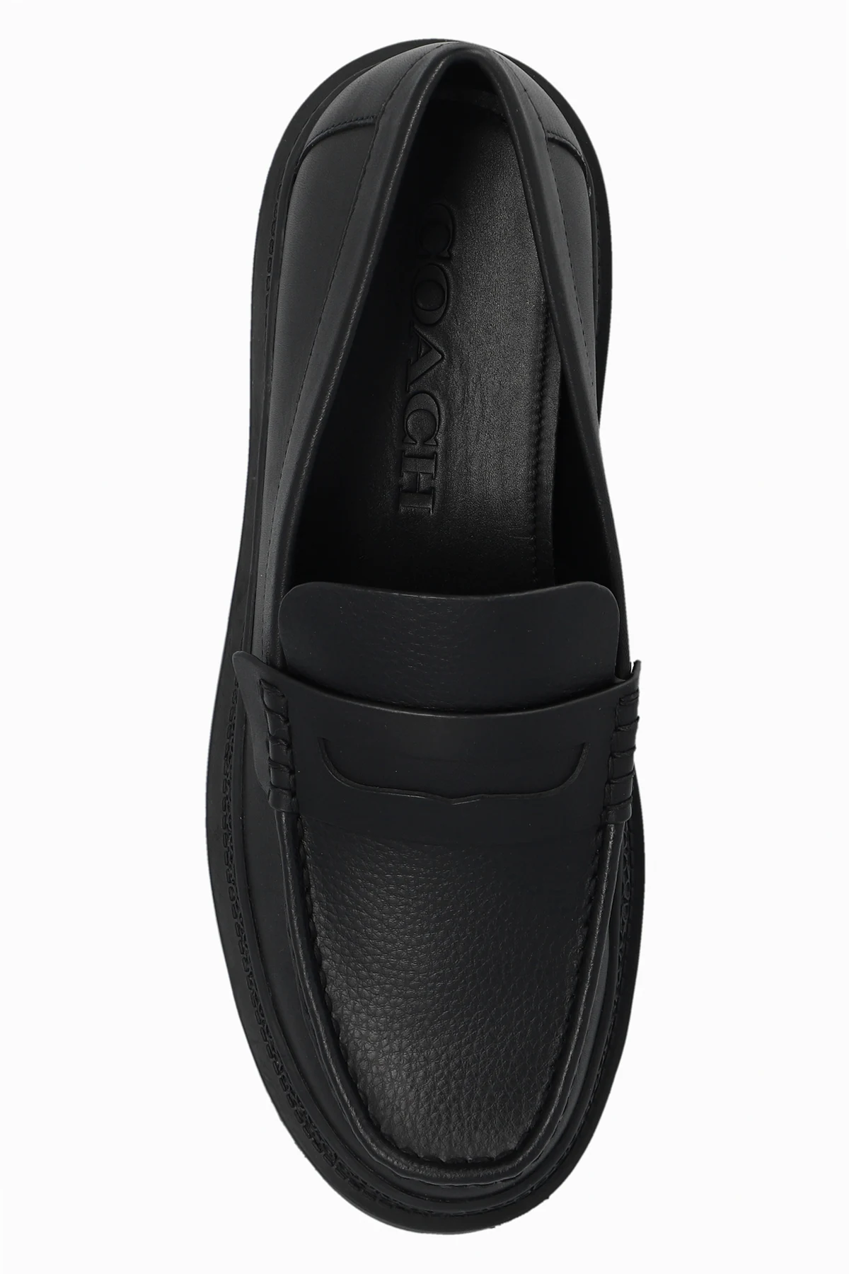 Black loafers from Coach. Made of leather, this pair features an embossed jacquard monogram pattern and black rubber sole.