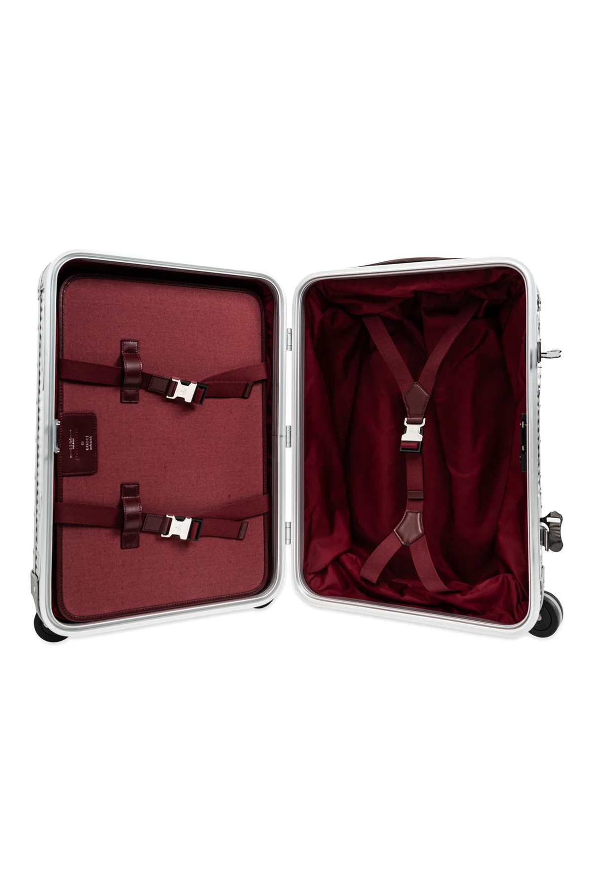 Introducing the Monogram Suitcase, the essence of luxury and modern design, crafted by the renowned brand Gucci. This exclusive suitcase features a rectangular shape with gently rounded edges, accentuated by sturdy silver metal. The entire surface is adorned with a repeating \"GG\" monogram, symbolizing the highest class. Its sophisticated appearance is complemented by four swivel wheels and an elegant handle made of high-quality plastic or leather. The interior of the suitcase, lined with dark red fabric, offers space with two compartments and a removable zippered divider. With securing straps, organizing your luggage becomes exceptionally simple. Why should you buy this product? Luxurious Gucci design setting fashion trends. Solid and elegant aluminum construction. Practical interior with thoughtful organization. Ease of maneuvering thanks to swivel wheels. Exclusivity emphasized by the unique \"GG\" monogram.