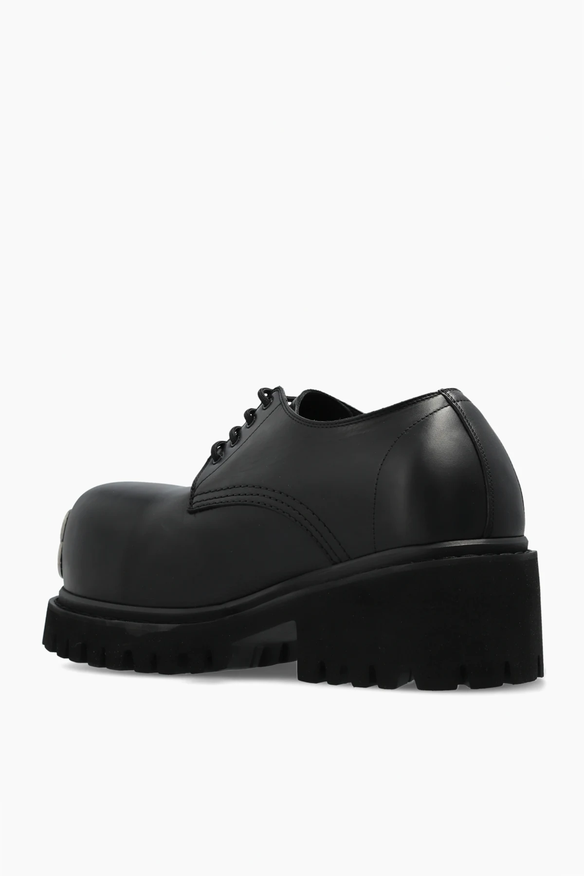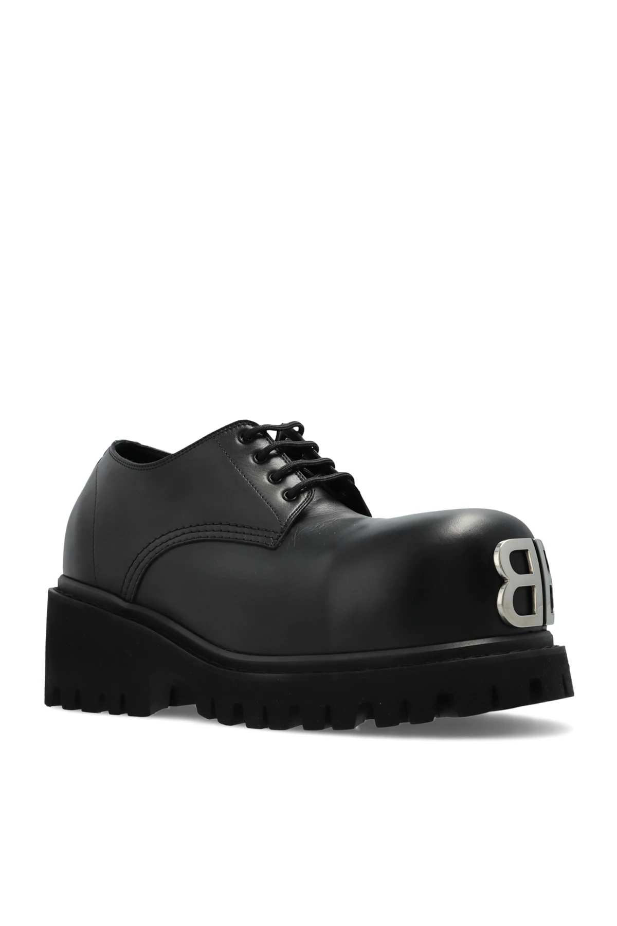 Discover the quintessence of modern elegance with the Stomper leather shoes, a remarkable creation from the esteemed house of Balenciaga. Crafted from sumptuous black leather, these shoes epitomize sophistication and audacity. The robust, thick rubber sole with a pronounced tread ensures a commanding presence, while the silver-toned metal logo adorning the front elevates their distinctive allure. The lace-up design, a hallmark of classic refinement, guarantees an impeccable fit. Marrying the timeless with the avant-garde, the Stomper shoes are an embodiment of Balenciaga\'s commitment to sartorial excellence and contemporary innovation. Why Choose This Product? Exquisite craftsmanship from a legendary fashion house. Durable design with a striking, modern aesthetic. Perfect fusion of classic style and avant-garde elements. Distinctive silver logo for a touch of luxury. Ensures comfortable fit with lace-up closure.