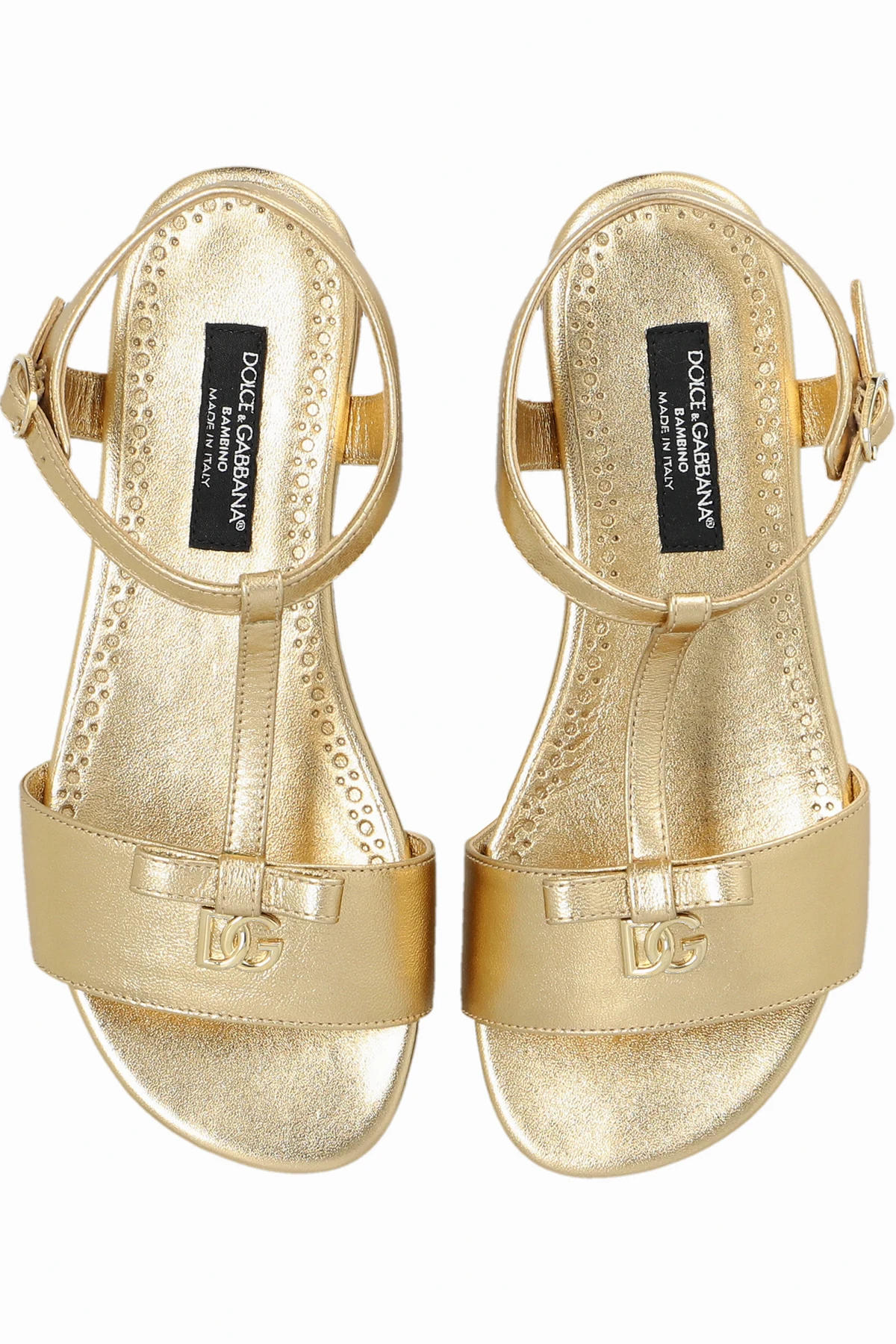Gold-tone sandals from Dolce & Gabbana Kids. Made of leather, this model sits on a brown rubber sole and features a bow accompanied by a logo application on the front and an adjustable ankle strap with a buckle.