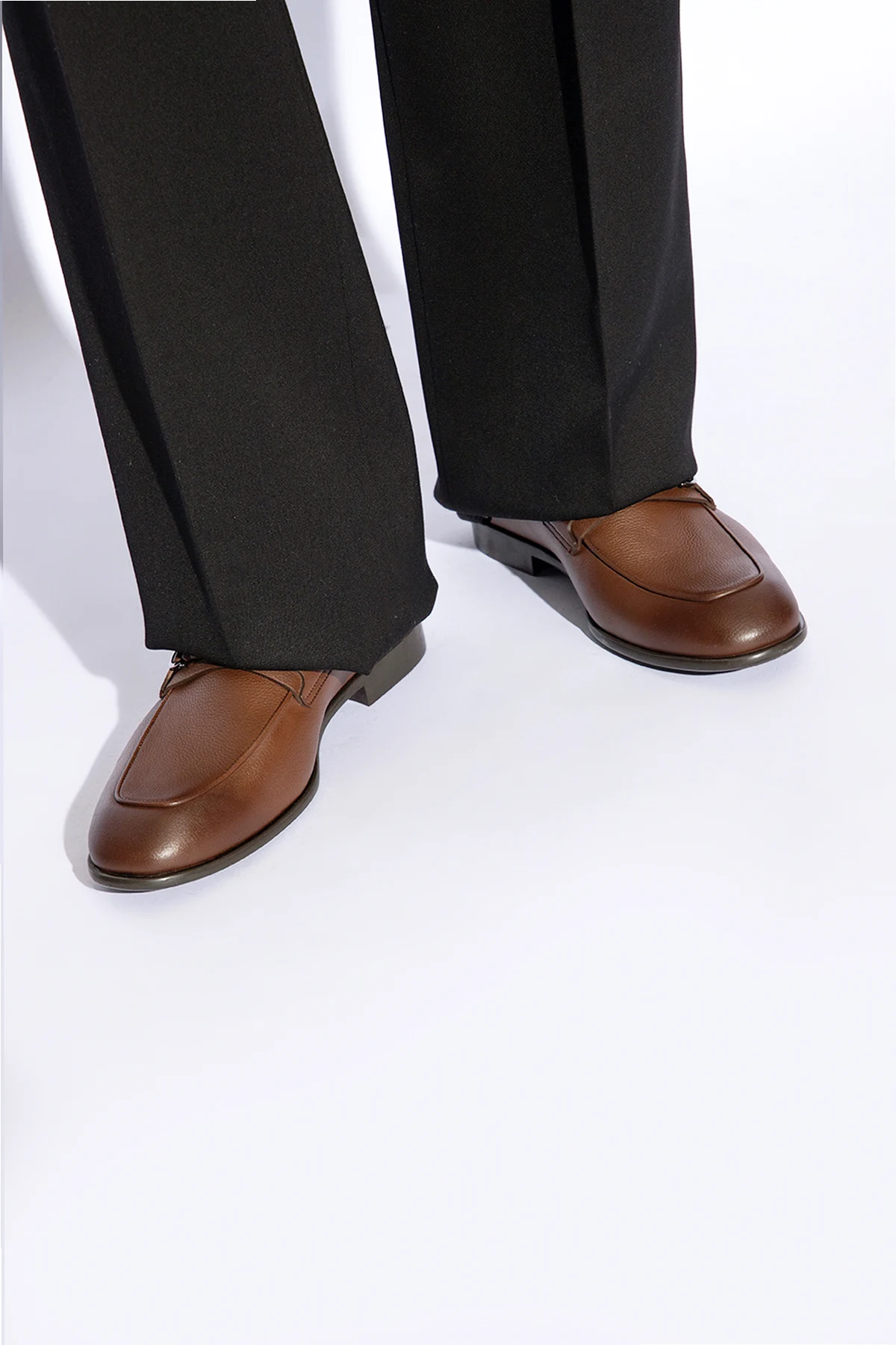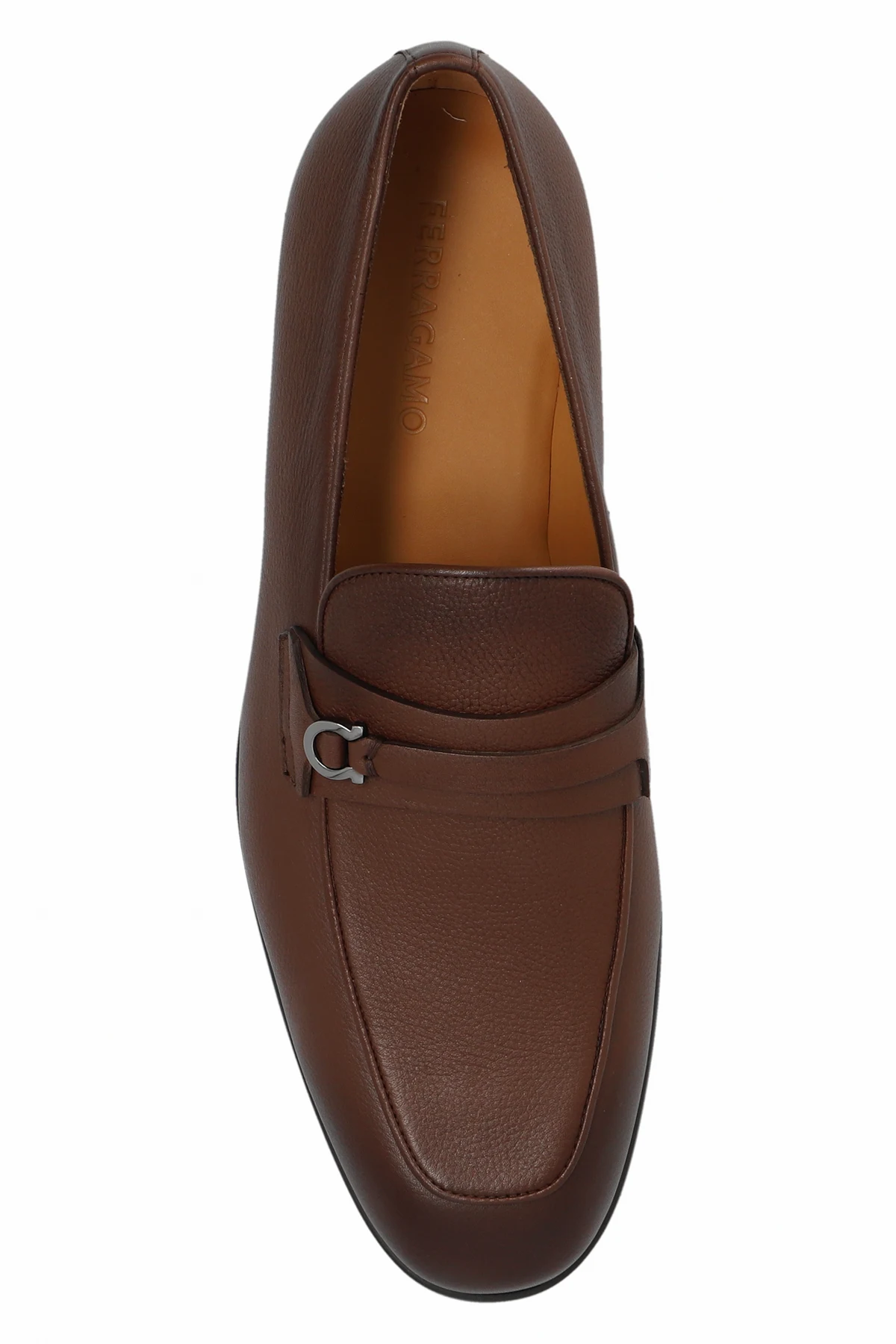 Brown ‘Desio’ loafers from FERRAGAMO. Made of calf leather, this model sits on a dark brown rubber sole and showcases silver-tone Gancini hardware on the front. Extrawide insole.