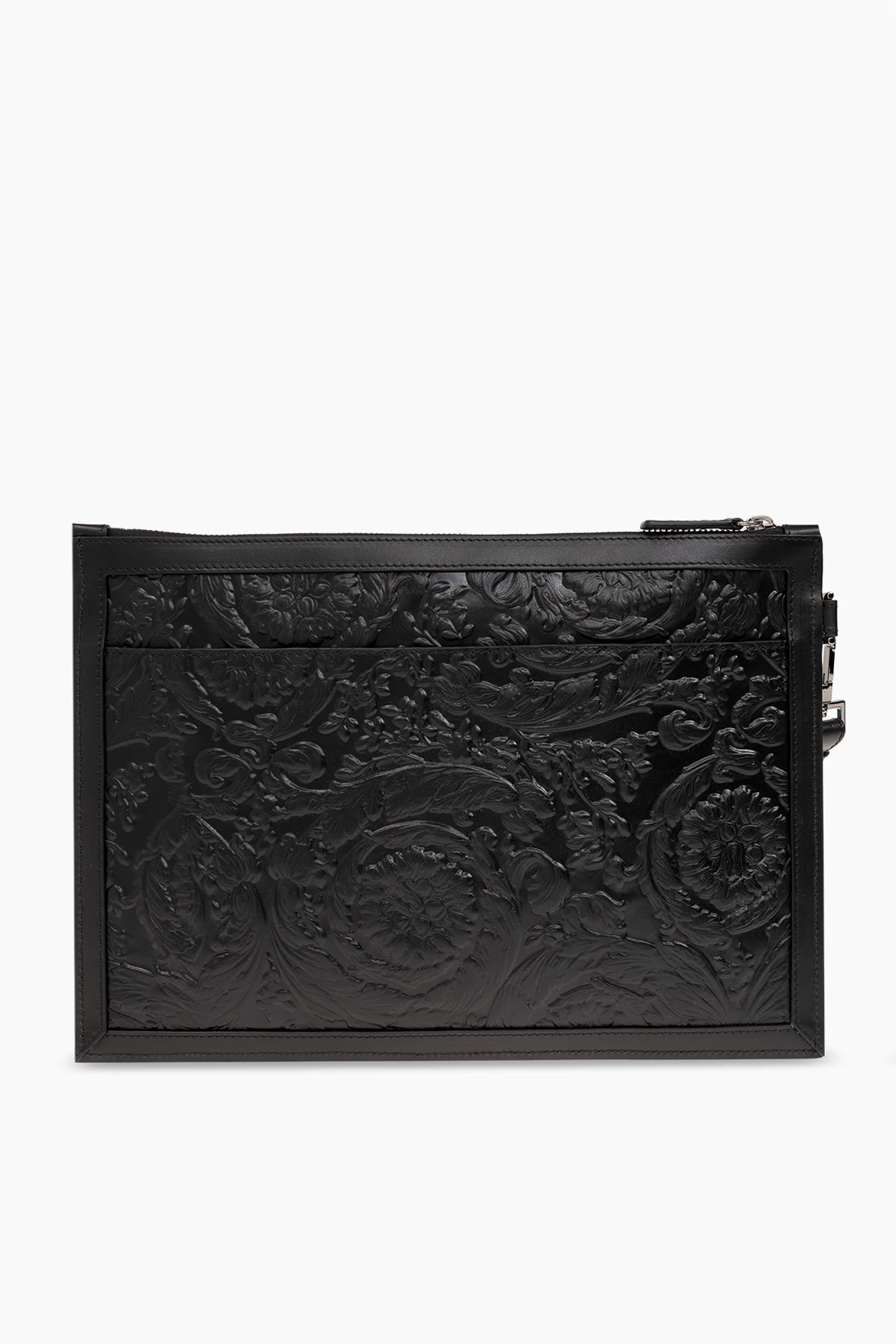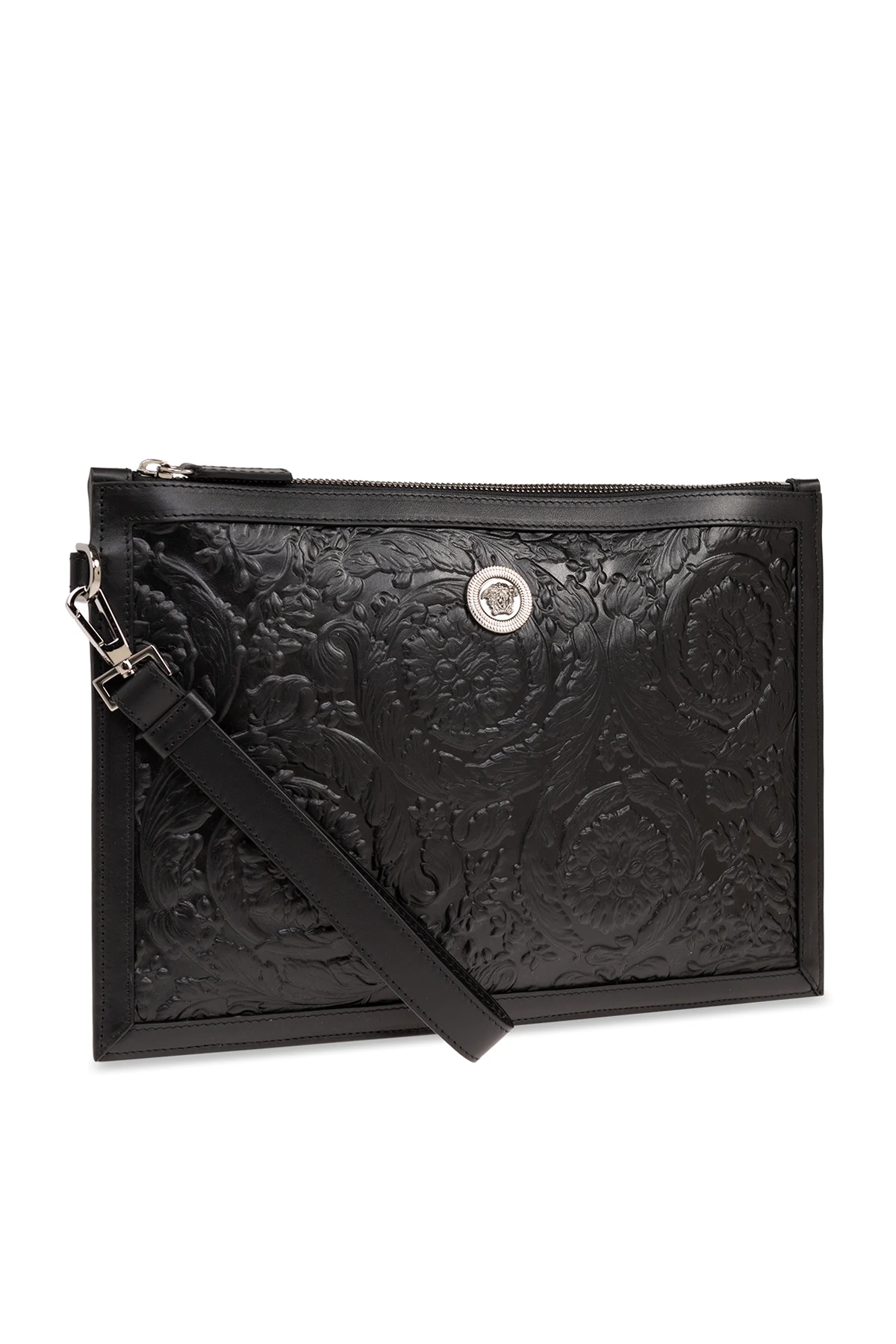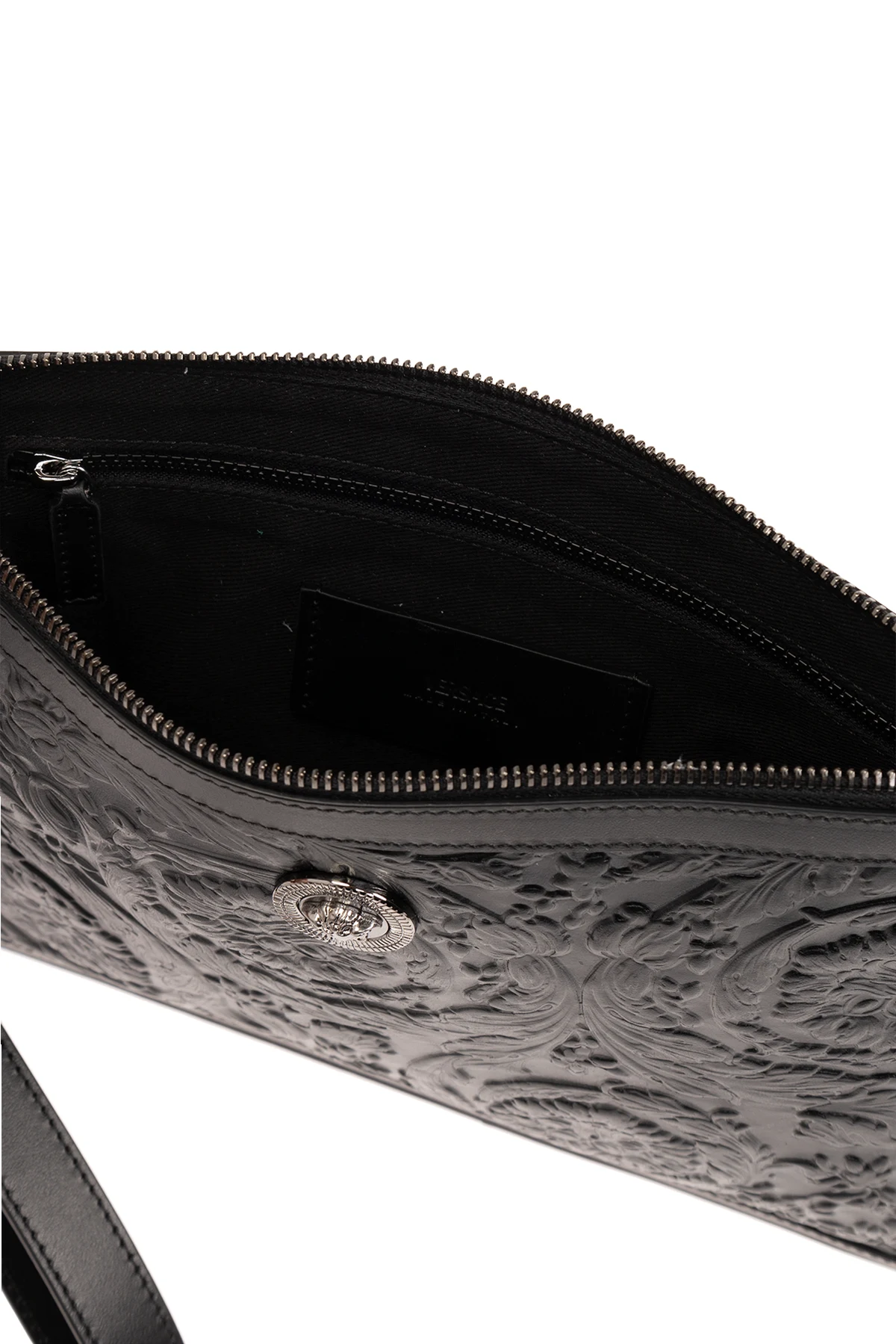 Black handbag from Versace. Made of calf leather with a tactile Barocco motif, this model features a zip fastening, the brand’s signature Medusa head detail, detachable wrist strap on the side, back pocket, silver-tone metal hardware and one internal compartment with one zip pocket.