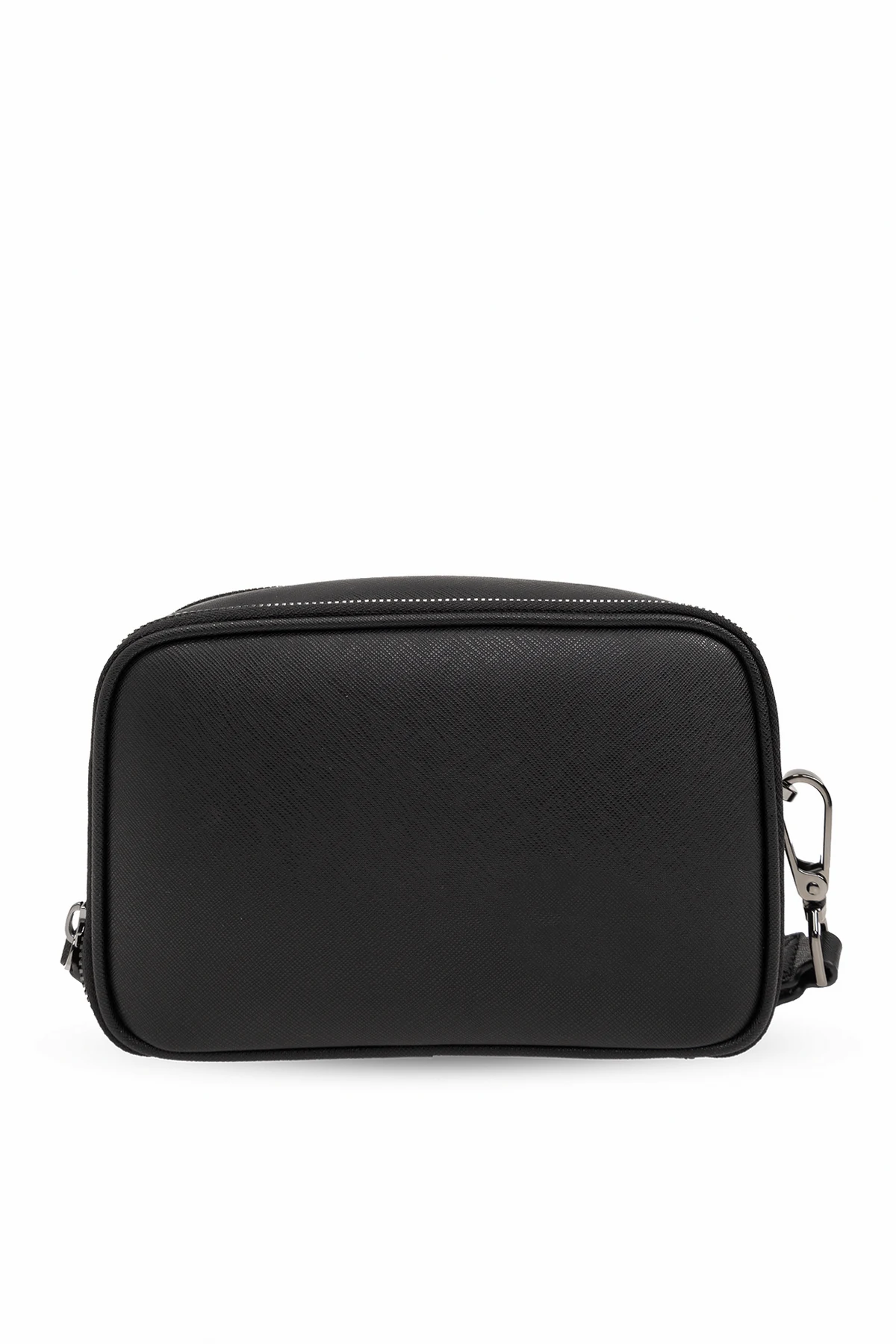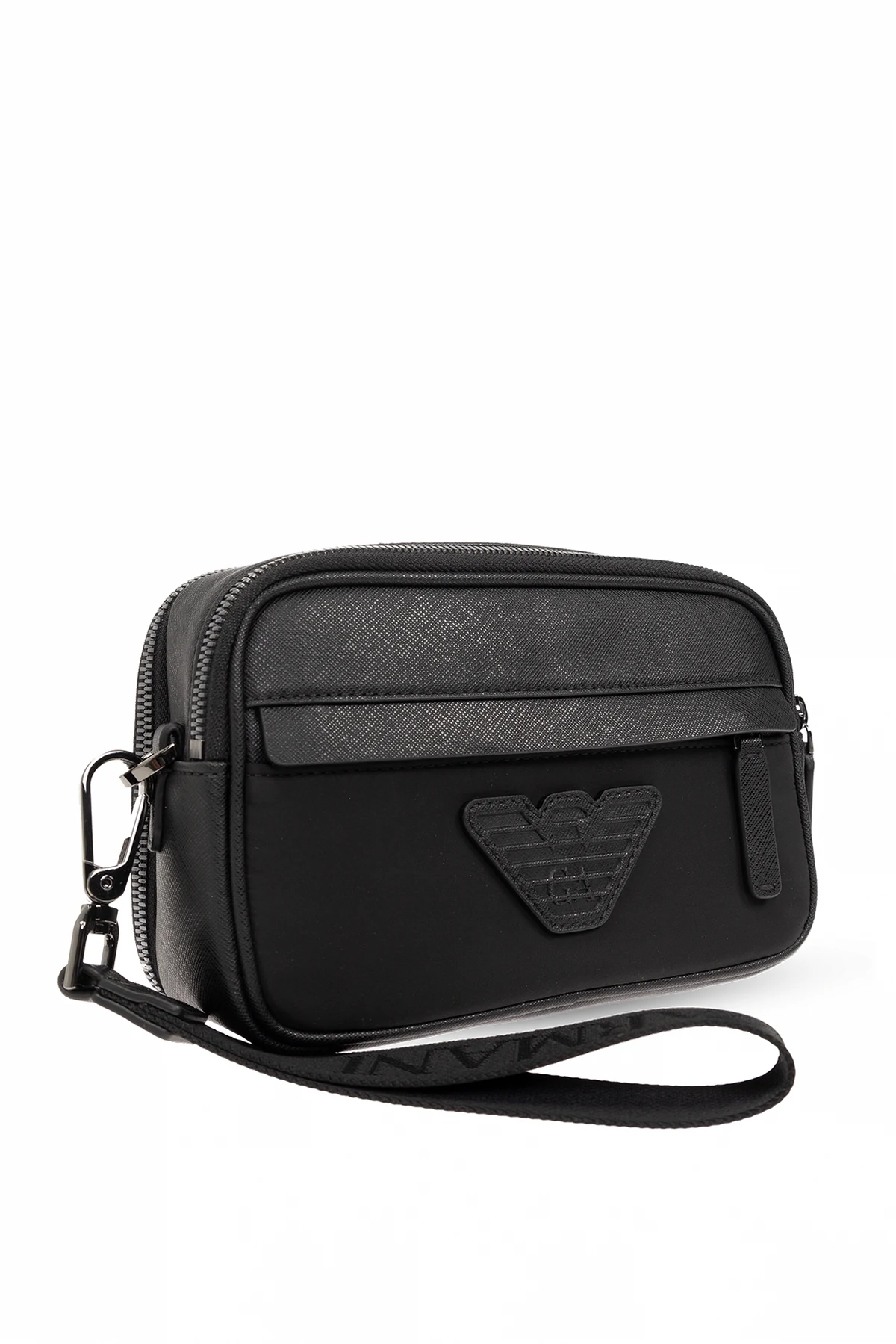 Introducing the Emporio Armani Handheld Bag from the distinguished \'Sustainability\' collection. This exquisite accessory, designed exclusively for men, merges sophistication with practicality, making it an essential addition to any discerning wardrobe. Crafted from premium canvas and material, this black bag features a sleek, rectangular silhouette with elegantly rounded corners. The front surface is smooth, embellished centrally with the iconic Emporio Armani logo, adding a touch of refined elegance. The upper and back sections boast a leather-like texture, enhancing its luxurious appeal. Functionality is at the forefront of this design, with a front zippered pocket and a main compartment also secured by a zipper, ensuring the safety of your essentials. The interior is thoughtfully lined, offering additional compartments for small items. A detachable, adjustable shoulder strap and a side wrist strap provide versatile carrying options. Why Choose This Product? Elegant minimalistic design with high-quality craftsmanship Central embroidered logo for a distinctive, exclusive look Versatile carrying options with detachable shoulder and wrist straps Secure storage with zippered compartments and organized interior Contrast silver-tone metal accents for added sophistication