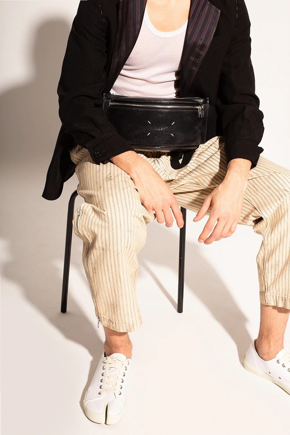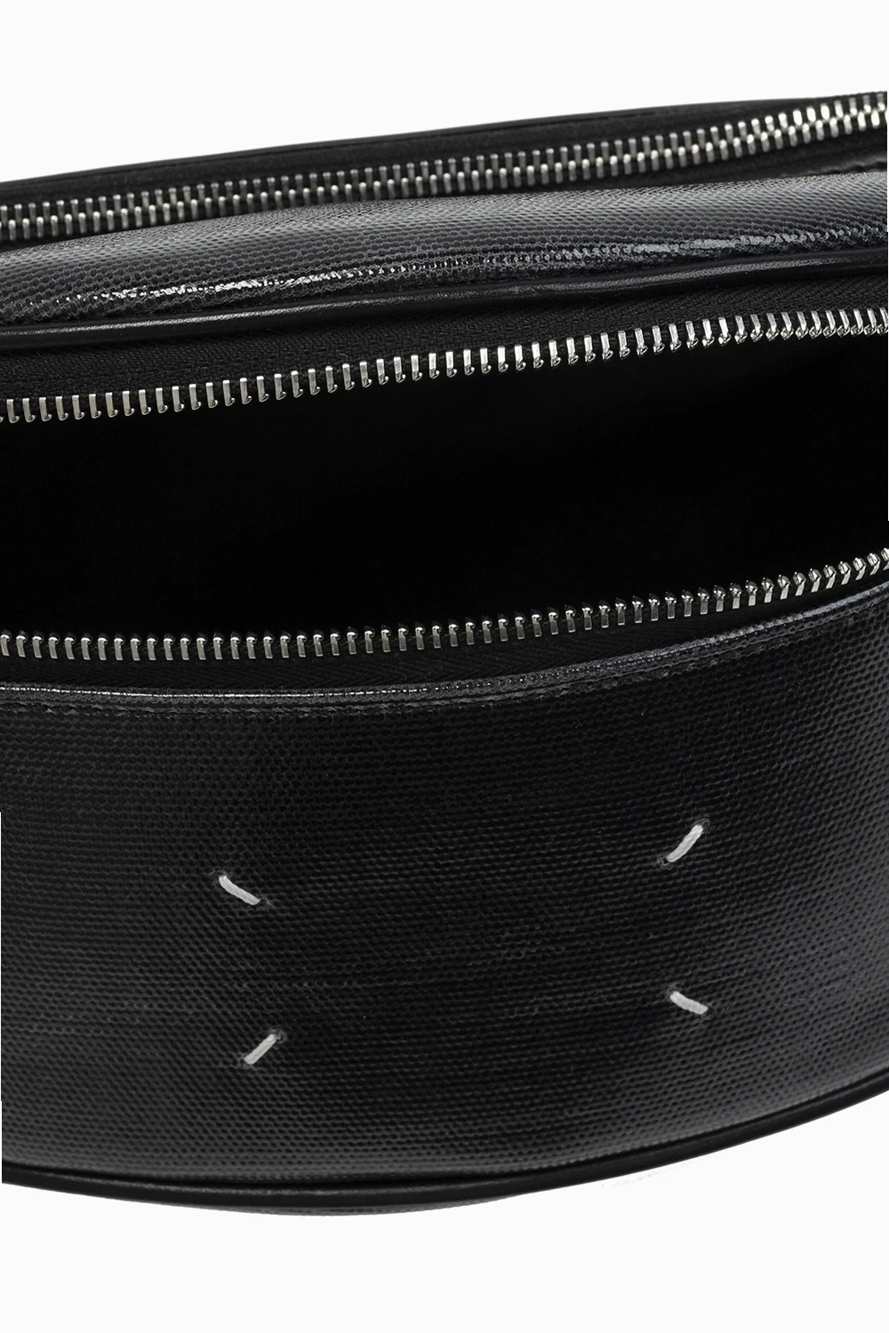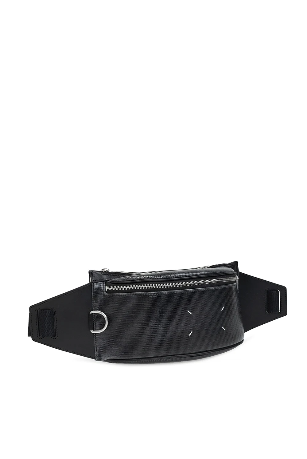 Black belt bag from Maison Margiela. Embroidered with the brand\'s logo in white, this item fastens via a two-way zip and features an adjustable strap, silver-tone metal hardware, leather inserts and one internal compartment.