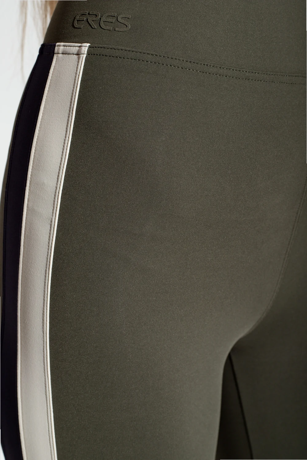 Green ‘Rythmique’ training leggings from Eres. This pair has an elastic waistband, logo appliqué and side stripes in cream and navy.