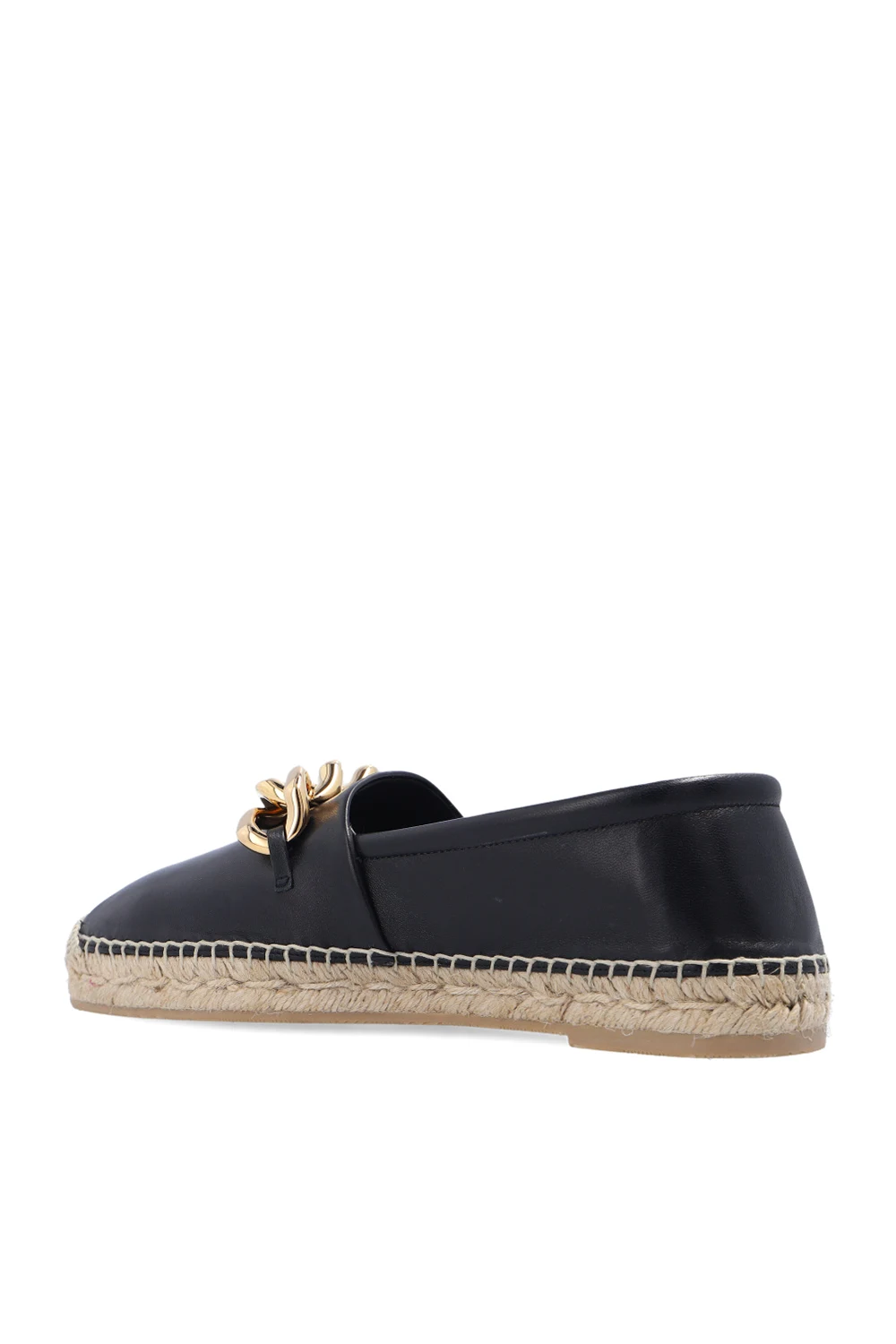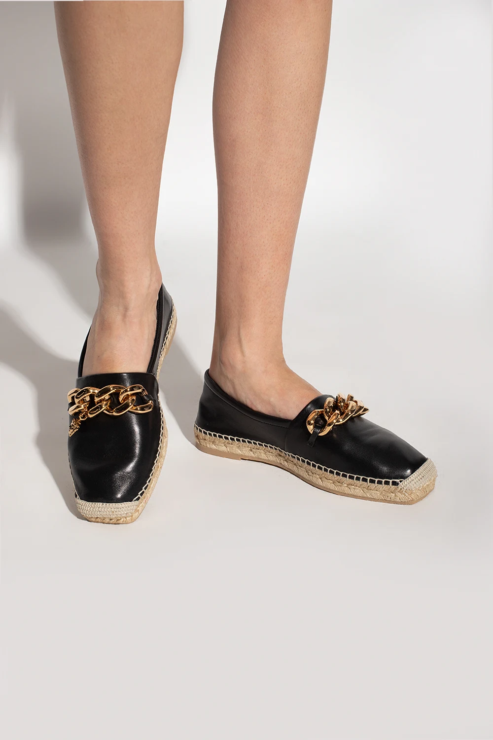 Black espadrilles from Versace. Made of leather, this model sits on a light beige rubber sole and showcases gold-tone chain link hardware accompanied by Medusa charm on the front.