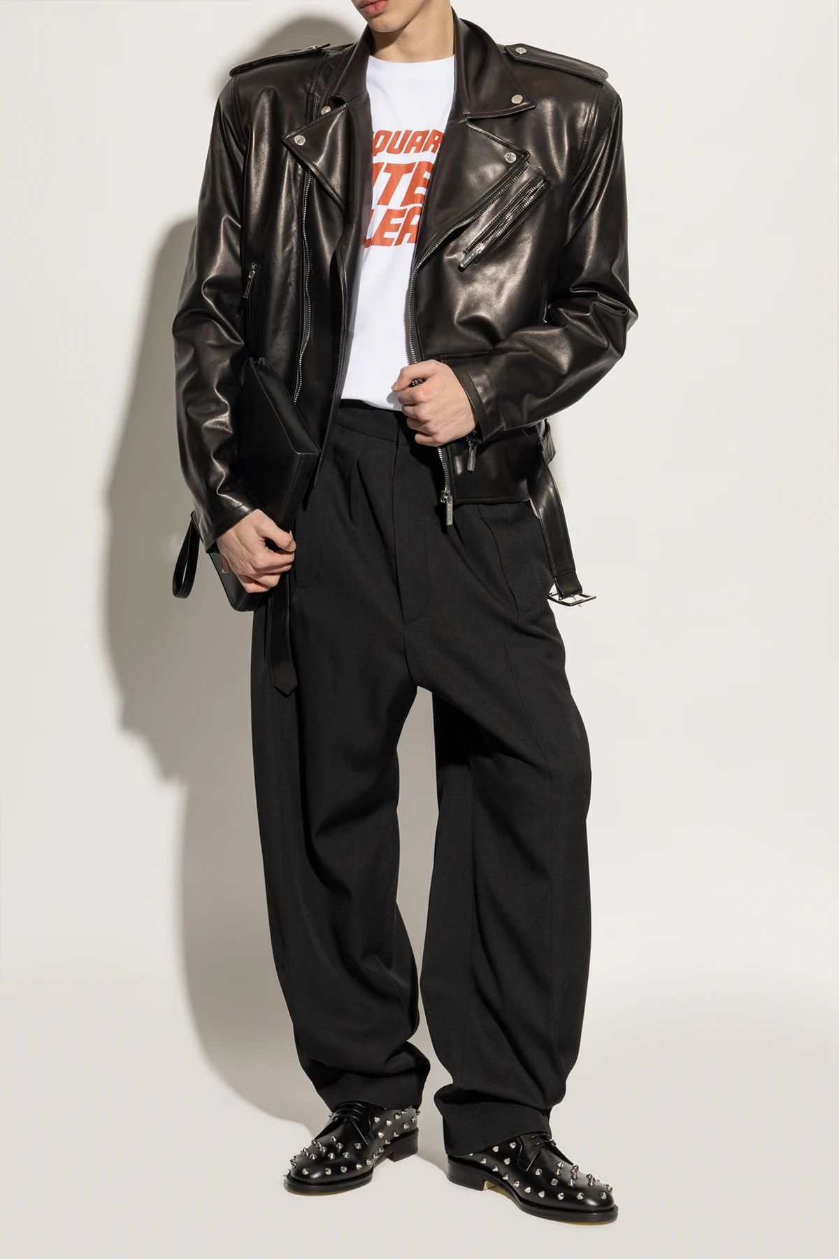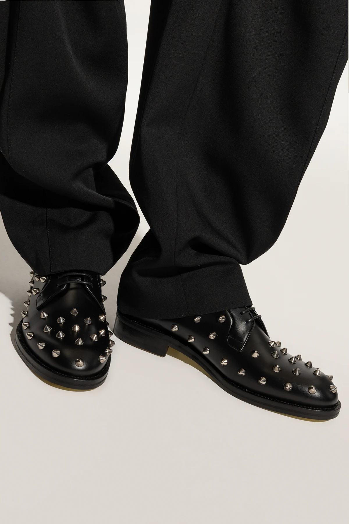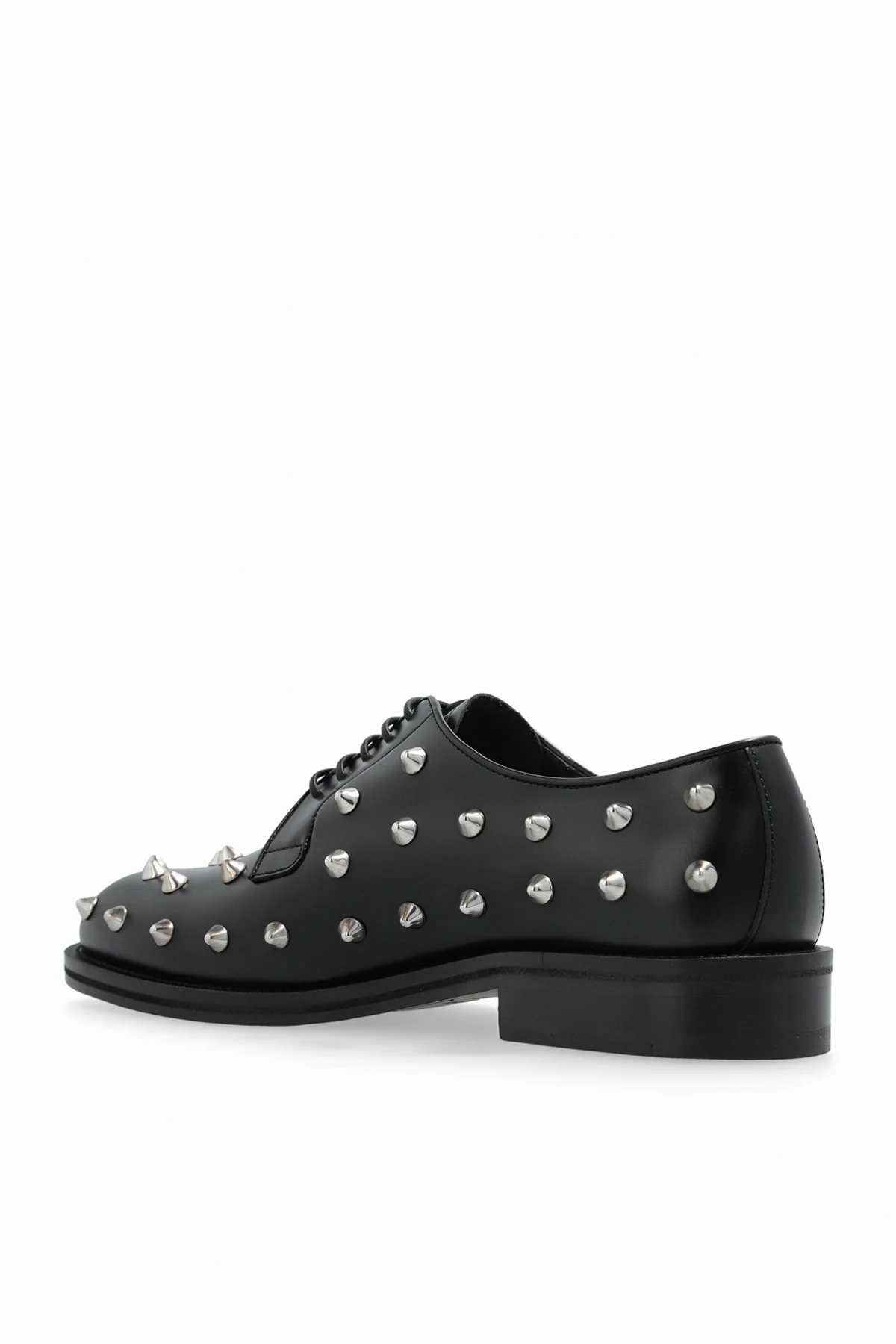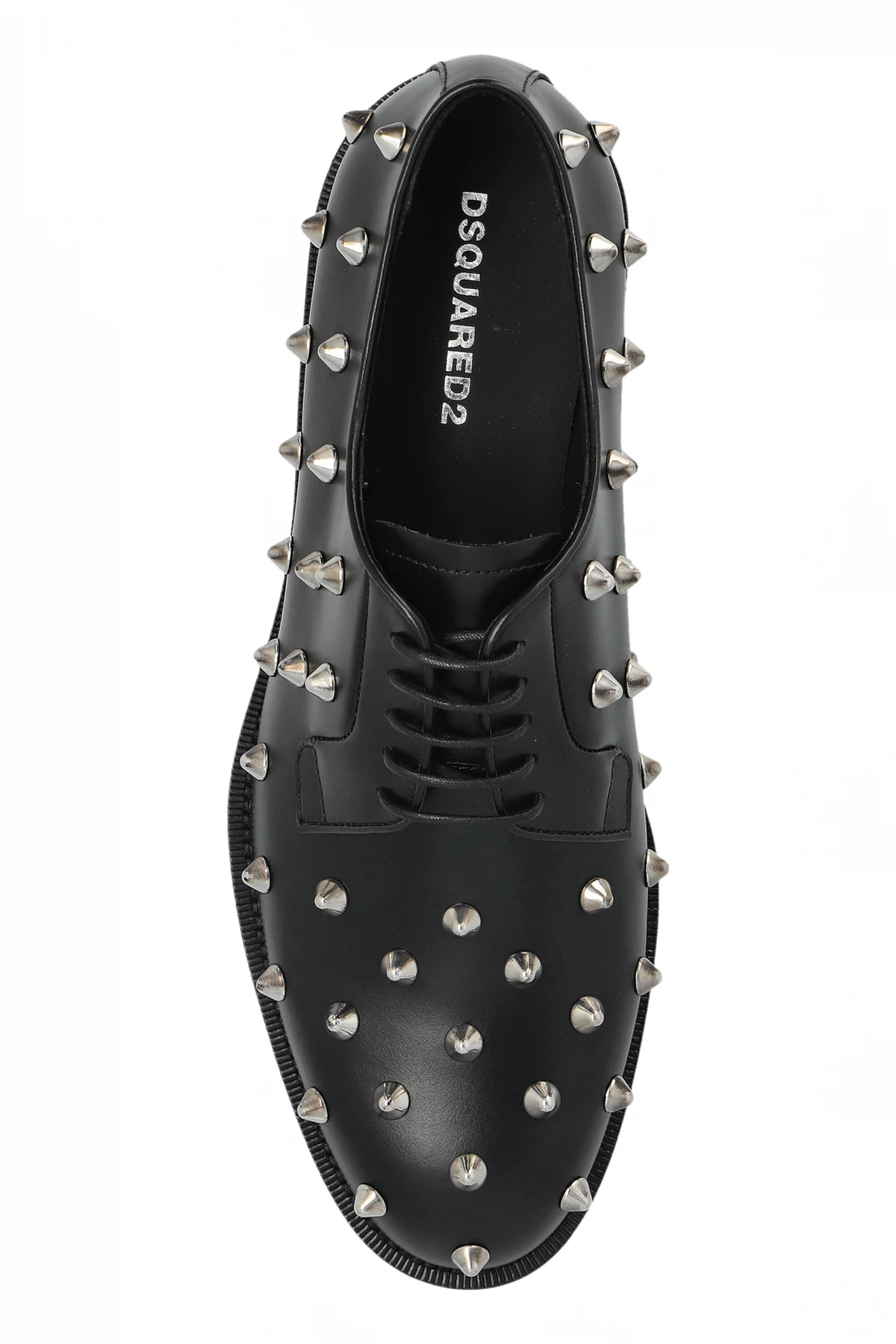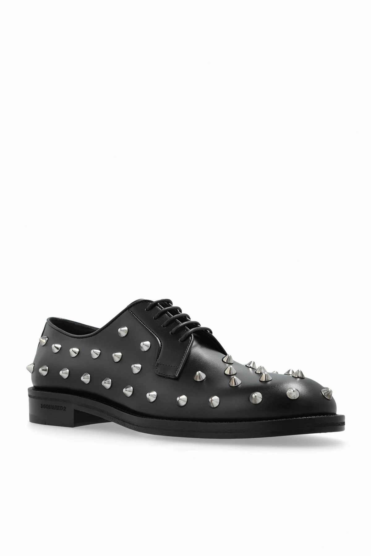 Introducing the Leather Studded Shoes, an exquisite piece from the exclusive collection of Dsquared2. These shoes epitomize the fusion of classic elegance and bold, contemporary design. Crafted from premium black leather, these shoes feature a timeless silhouette with a closed front and lace-up design. The surface is adorned with striking silver studs, imparting a distinctive, rock-inspired character. The flat, robust sole ensures durability, while meticulous attention to detail is evident throughout. Inside, the designer\'s logo, \"DSQUARED2,\" is elegantly positioned on the insole, affirming their authentic, luxury origin. Why choose this product? Combines classic style with a modern edge. Crafted from luxurious black leather. Distinctive silver stud embellishments for a bold look. Authentic designer touch with the \"DSQUARED2\" logo. Part of the men\'s collection, ideal for flat, lace-up shoe enthusiasts.