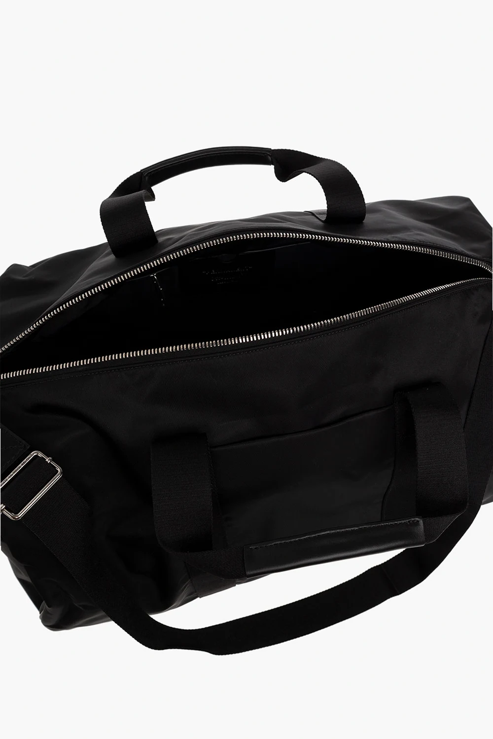 Black holdall bag from Off-White. Trimmed with calf leather, this design features a two-way zip, front pocket, snap-fastened side pocket with a logo, two half-round handles, adjustable shoulder strap, silver-tone metal hardware and one internal compartment with one zip pocket and one card slot.