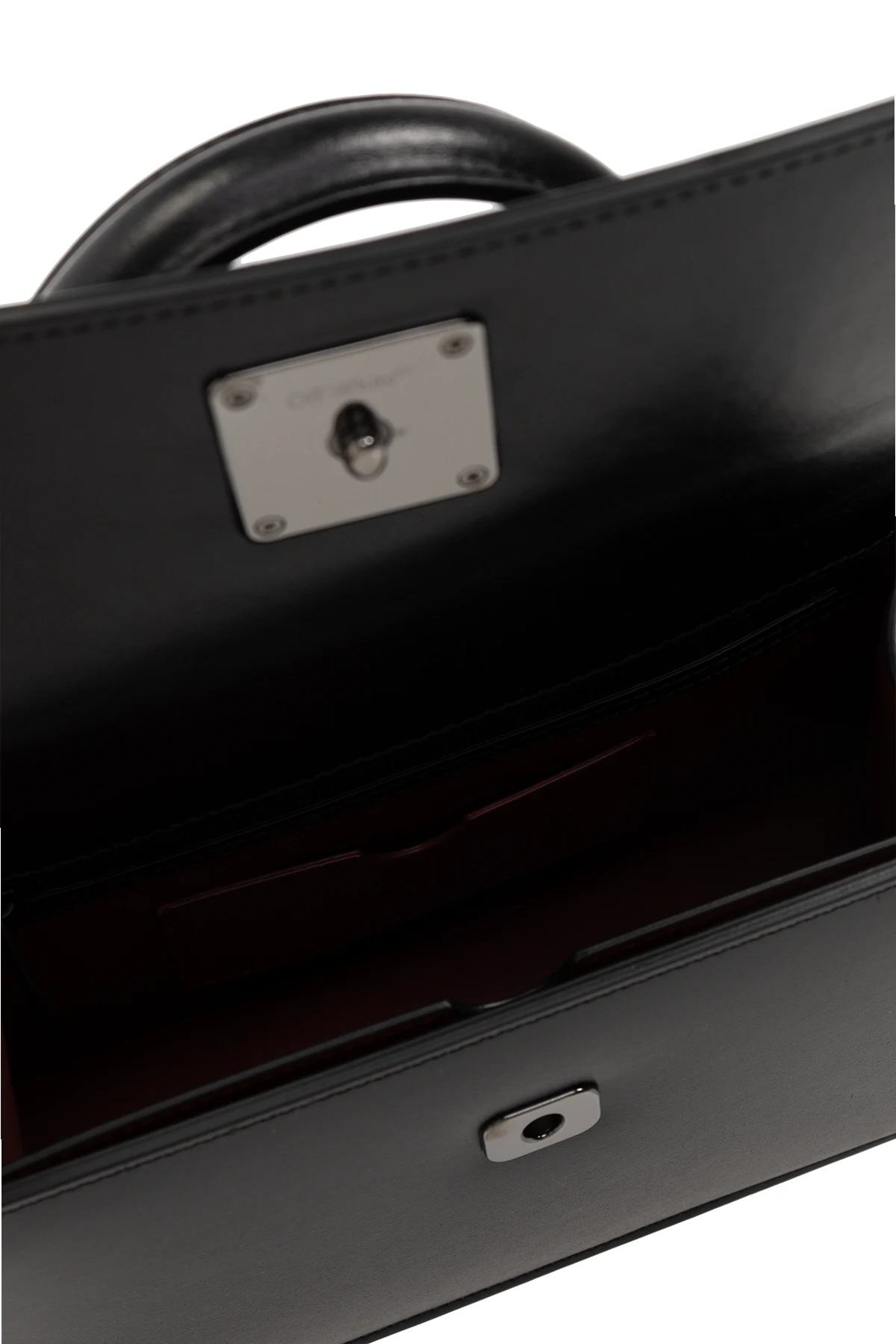 Black ‘Jitney 1.4’ shoulder bag from Off-White. Made of smooth calf leather, this design fastens with a logo-shaped twist snap and features a logo print and one slip pocket on the back, a half-round handle, a detachable and adjustable shoulder strap, black metal hardware and a maroon-clad interior with one compartment with one zip pocket, one slip pocket and one card slot.