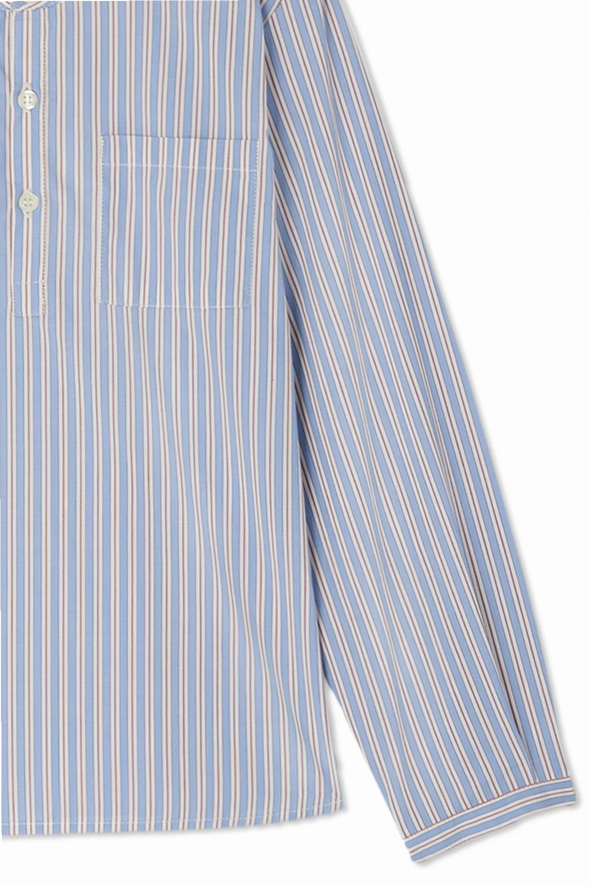 Introducing the quintessence of sartorial elegance, the Striped Long-Sleeve Shirt from the exclusive collection of Bonpoint. This meticulously crafted piece redefines classic attire with its sophisticated design and premium quality. Featuring a timeless henley-style neckline with a subtle button placket, this shirt offers a modern take on traditional aesthetics. The shirt\'s silhouette is accentuated by its classic, straight cut, long sleeves, and a smart collar, culminating in a garment that exudes refined simplicity. The blue and white striped pattern enhances its visual appeal, making it a versatile addition to any wardrobe. Constructed from what appears to be a lightweight and smooth cotton blend, this shirt promises not only exceptional comfort but also ease of care. The attention to detail is evident in the pristine white buttons that contrast beautifully against the shirt\'s blue hues, and a discreet chest pocket adds a touch of functionality without compromising style. The presence of the Bonpoint designer\'s logo on the collar\'s label guarantees authenticity and signifies the garment\'s inclusion in an elite fashion lineage. Moreover, the precision in stitching speaks volumes about the high-quality craftsmanship that has gone into creating this exquisite piece. Why Purchase This Product? Elegance encapsulated in a classic striped design suitable for diverse styling options. Made from premium cotton blend, ensuring both comfort and durability. Exquisite craftsmanship and attention to detail, including precise stitching and designer logo authentication. Perfect for those who appreciate timeless fashion with a modern twist.