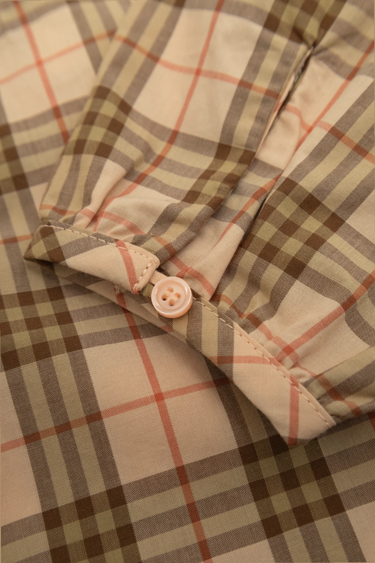 Introducing the Burberry Kids Plaid Shirt, an epitome of youthful elegance and comfort, meticulously crafted for girls aged 4-14. This exquisite shirt showcases a timeless plaid pattern in shades of beige, brown, and orange, a signature touch of Burberry’s luxurious British aesthetic. Made from soft, pure cotton, this shirt promises both comfort and a gentle touch on the skin. The delicately embroidered collar adds a sophisticated charm, while the front button placket adorned with pale pink buttons brings a subtle pop of color. The long sleeves, finished with buttoned cuffs, enhance its classic appeal. Why Choose This Product? Luxurious design from the renowned Burberry Kids collection. Soft, breathable cotton material ensures all-day comfort. Elegant details like embroidered collar and pink buttons. Loose fit for added comfort and ease of movement. Perfect blend of traditional craftsmanship and modern style.