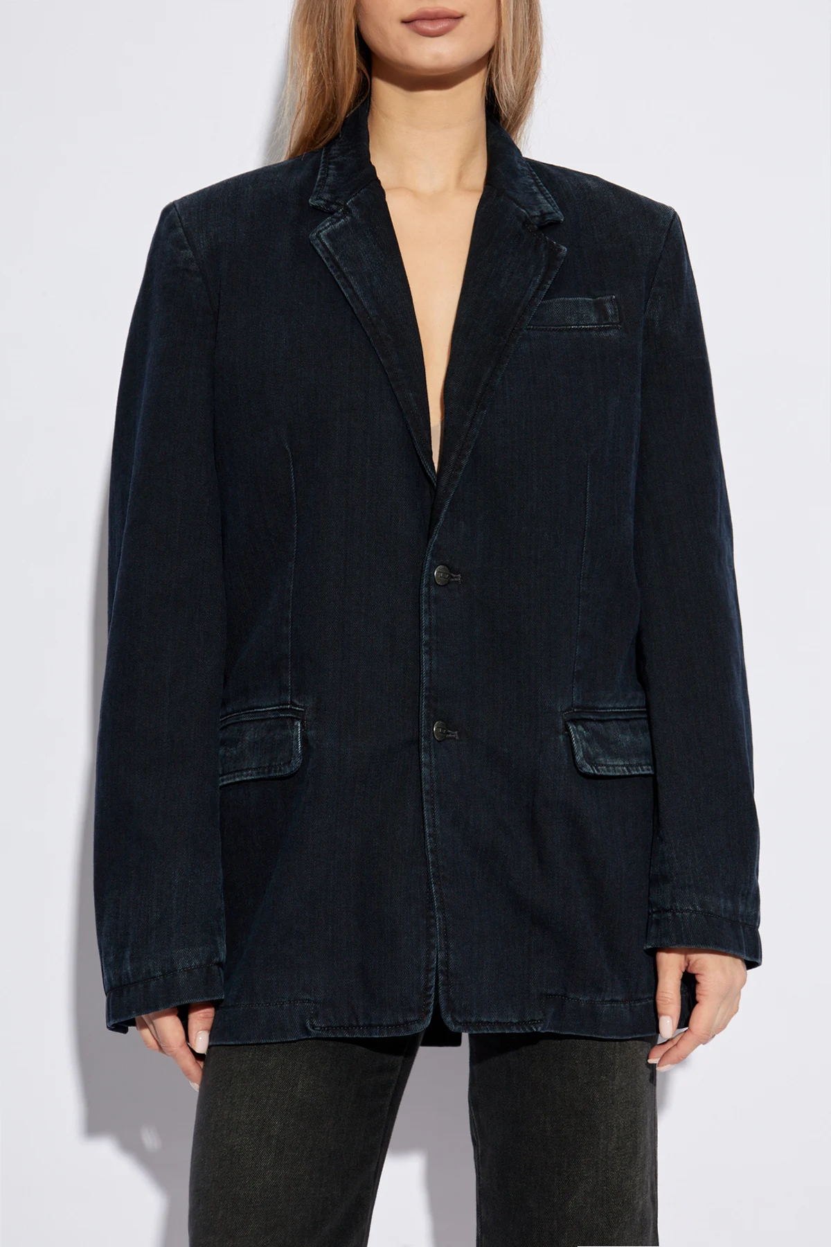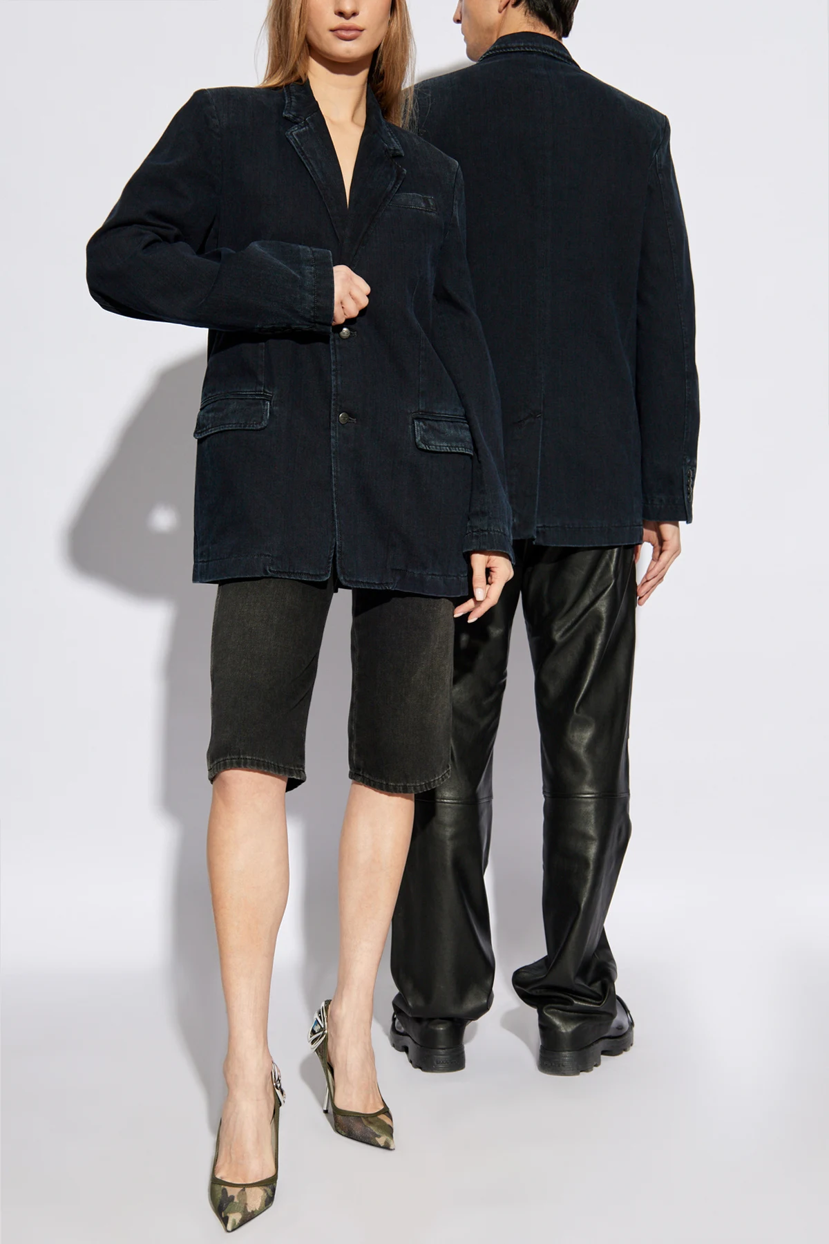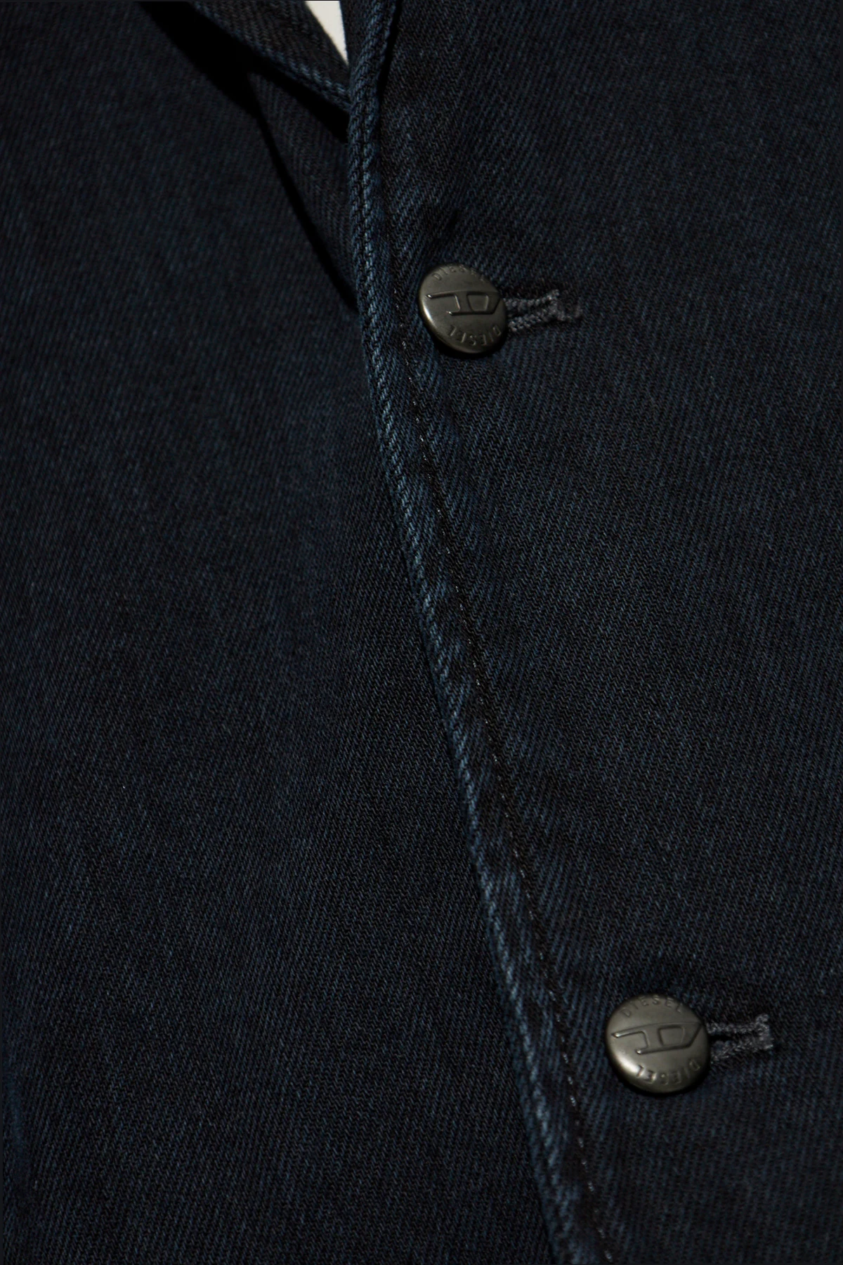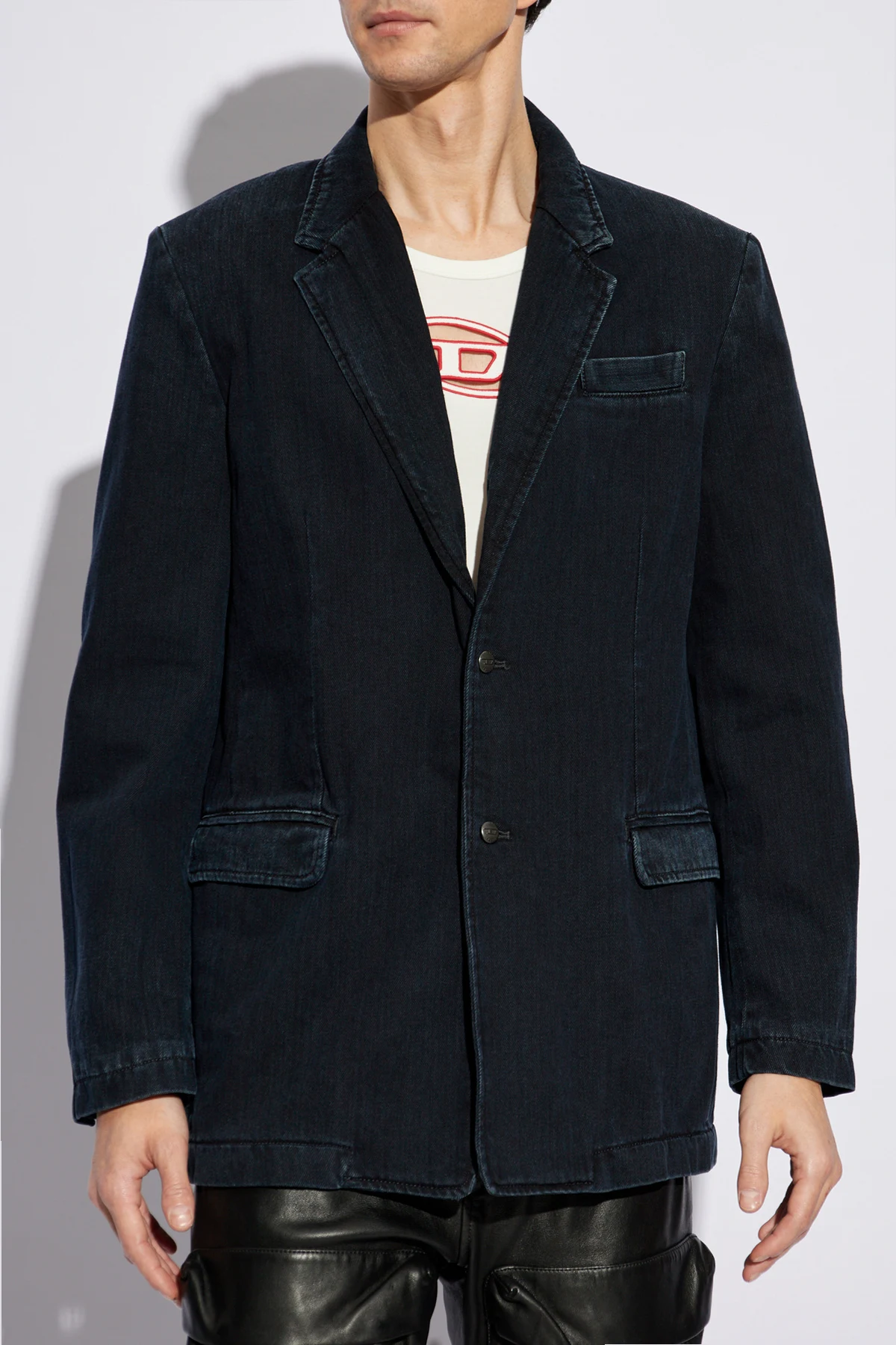 Introducing the Jeans Blazer \'D-REGER-D\' by the illustrious fashion house, Diesel. This navy masterpiece exudes an air of refined casual elegance, seamlessly blending comfort with sophistication. Crafted from premium denim, this blazer showcases a classic straight cut with a lapel collar, epitomizing timeless style. Intricate details include two front buttons adorned with subtle embossed patterns, dual flap pockets at the bottom, and a singular chest pocket on the left. The back hem features a single vent, enhancing wearability and comfort. With its unisex design, this blazer is suitable for both men and women, making it a versatile addition to any wardrobe. The visible stitching elegantly accentuates the blazer\'s structure, adding a touch of sophistication to its overall aesthetic. Why Choose This Product? Exclusive design by renowned brand Diesel. Perfect fusion of casual denim and elegant blazer style. Unisex fit suitable for any occasion. Exquisite details and superior craftsmanship.