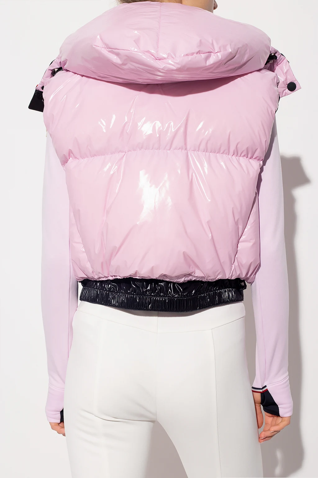 Pink and black ‘Teillon’ down vest from Moncler Grenoble. Fastened with a zipper, snaps and hook-and-loop closure, this style feautres drawstring hood, two front zipped pockets, a black logo patch on the back and an elasticated bottom hem with snap fastenings.