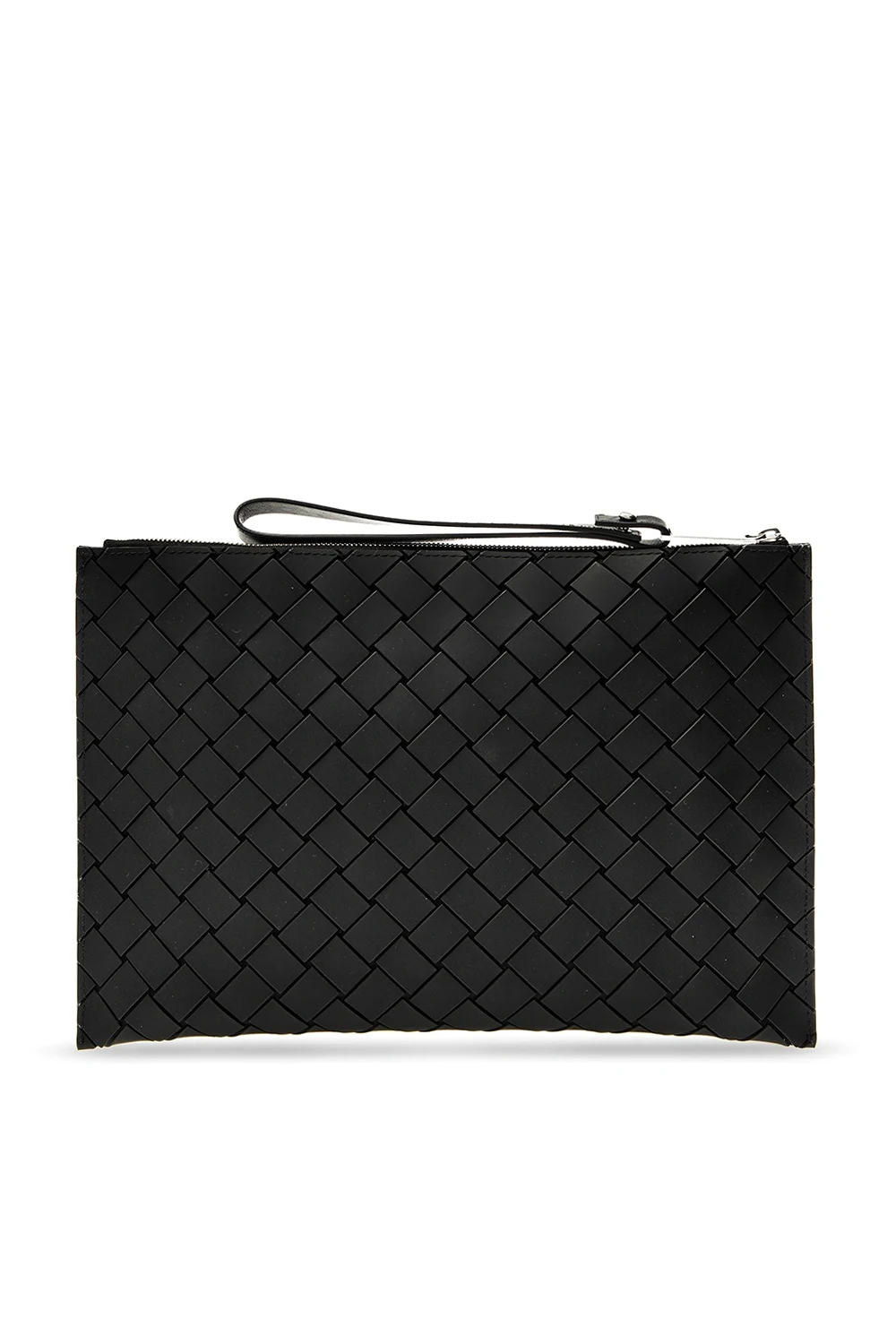 Black clutch from Bottega Veneta. Spruced up with a rubberised appliqué inspired by the label\'s iconic \'Intrecciato\' weave, this leather-crafted item fastens via zip and employs a wrist strap, silver-tone metal hardware and one internal compartment.