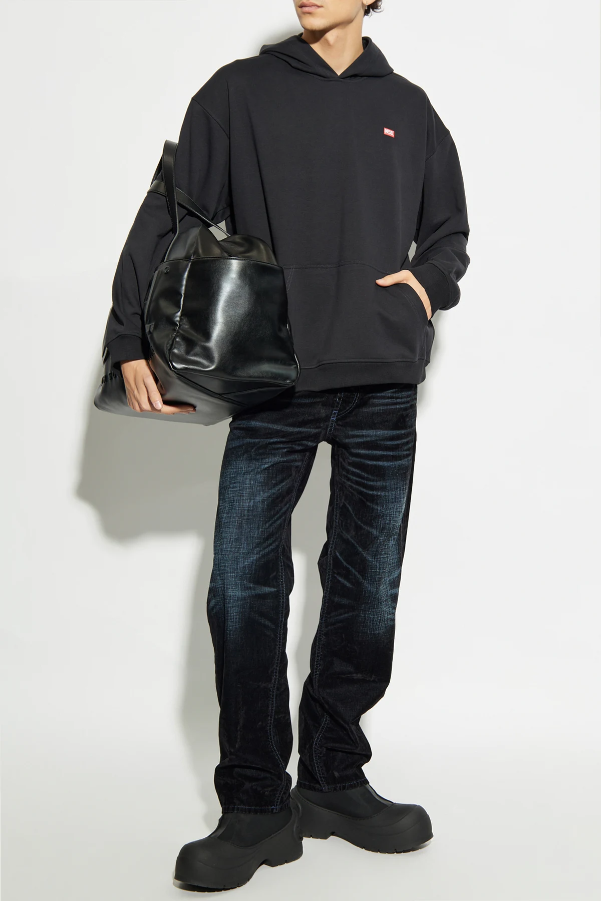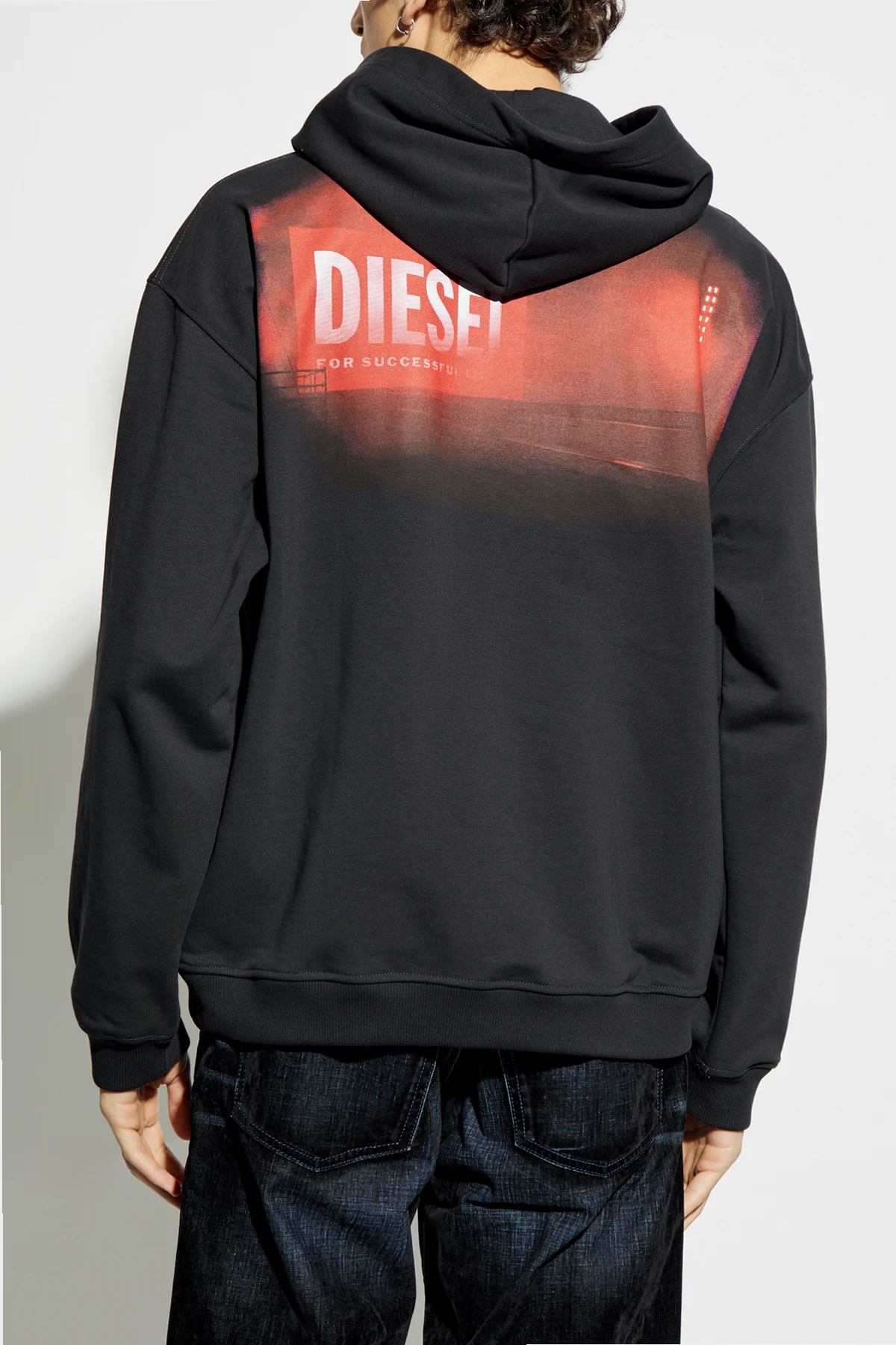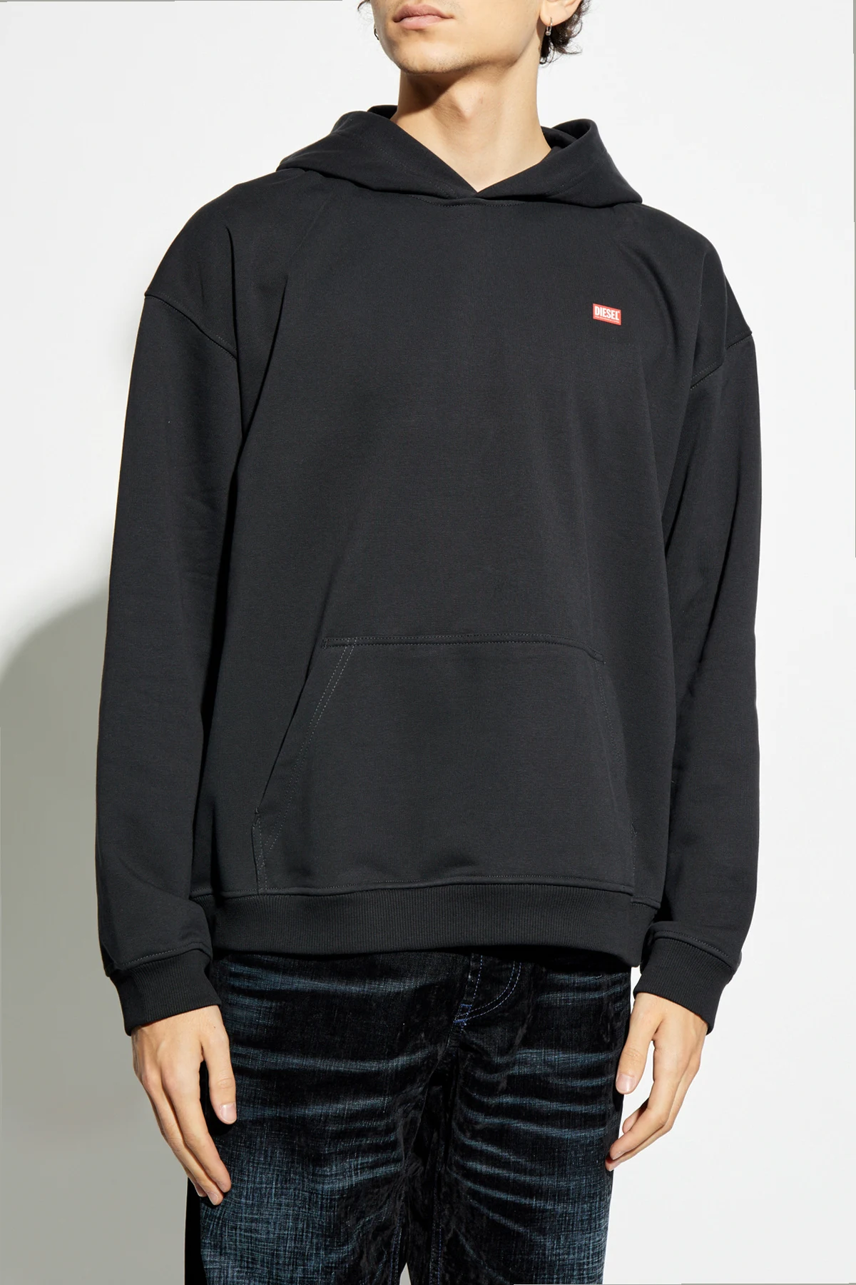 Introducing the S-BOXT-HOOD by Diesel, a paragon of sophisticated casual wear. This black hoodie epitomizes understated elegance with its classic silhouette, featuring a generous kangaroo pocket and long sleeves with ribbed cuffs. A subtle yet striking red Diesel logo adorns the left chest, while the back boasts a bold red print inscribed with \"DIESEL FOR SUCCESSFUL LIVING,\" a testament to the brand\'s ethos. Crafted from a blend of cotton and polyester, the material offers a plush touch and enduring comfort, ideal for those who cherish the fusion of comfort and style. Diesel, an illustrious Italian brand, renowned for its avant-garde jeans and exclusive men\'s accessories, continues to captivate under the visionary guidance of creative director Glenn Mertens. Why Choose This Product? Timeless design with a contemporary edge Luxuriously soft and comfortable material Iconic branding for a distinctive look Perfect blend of style and practicality