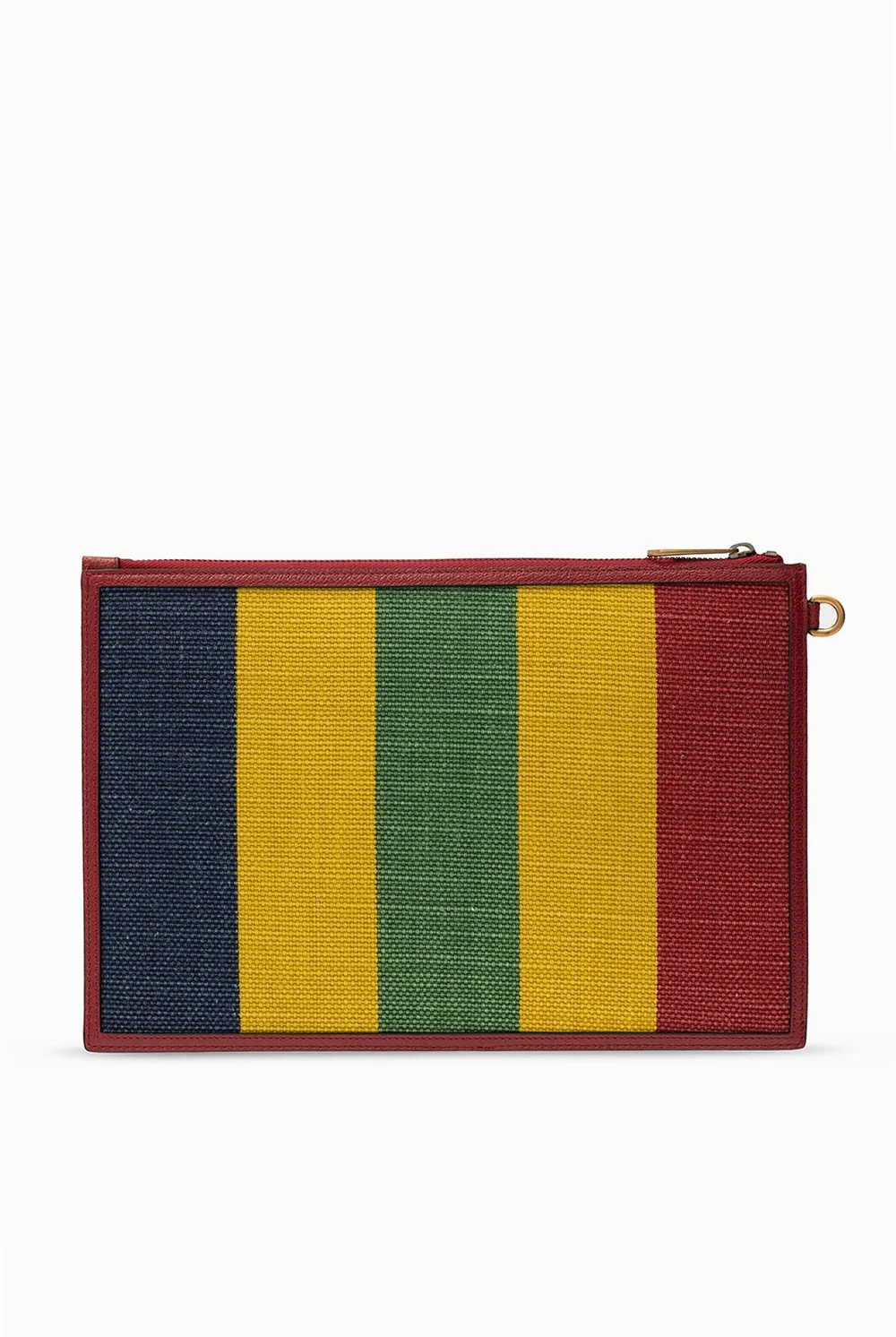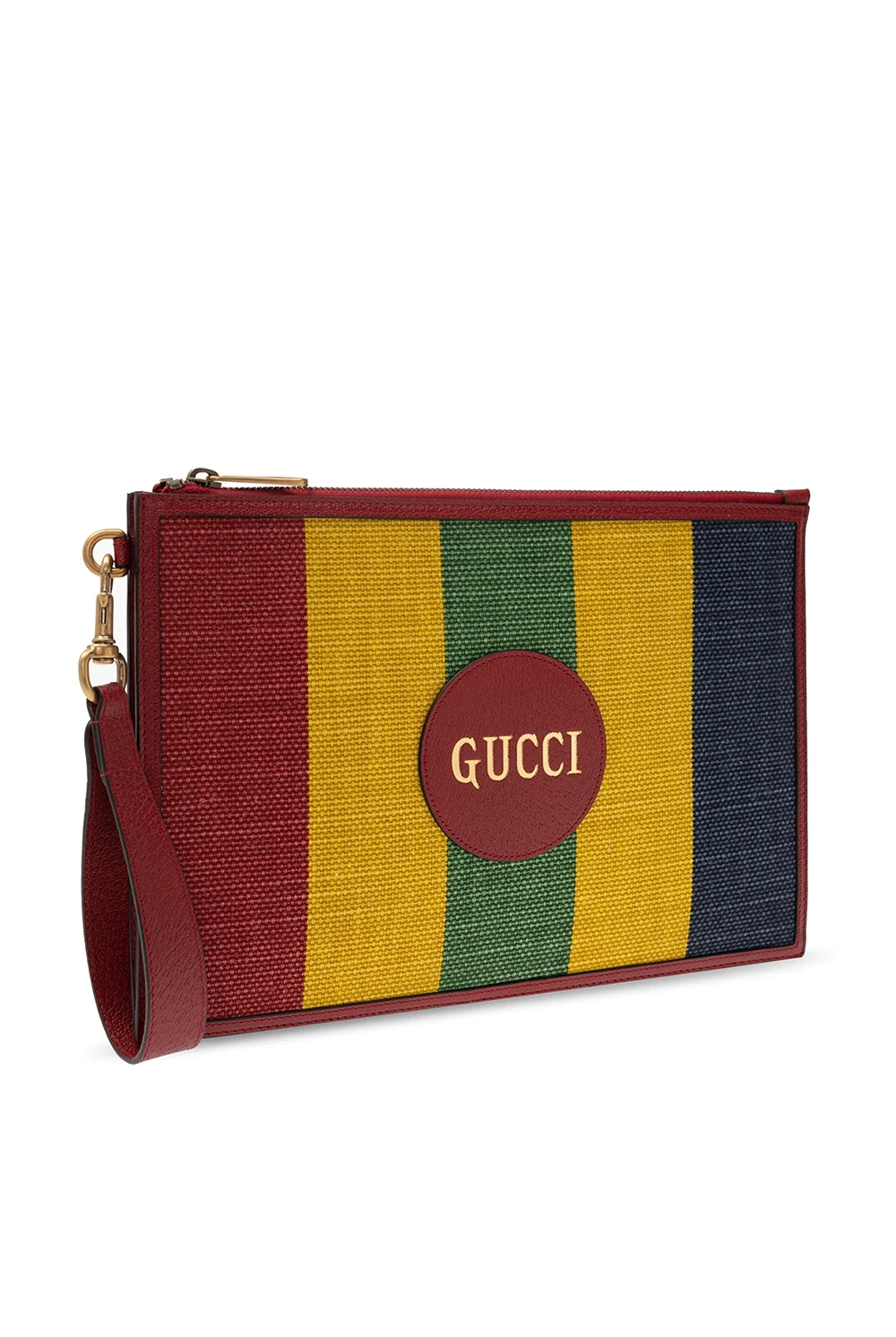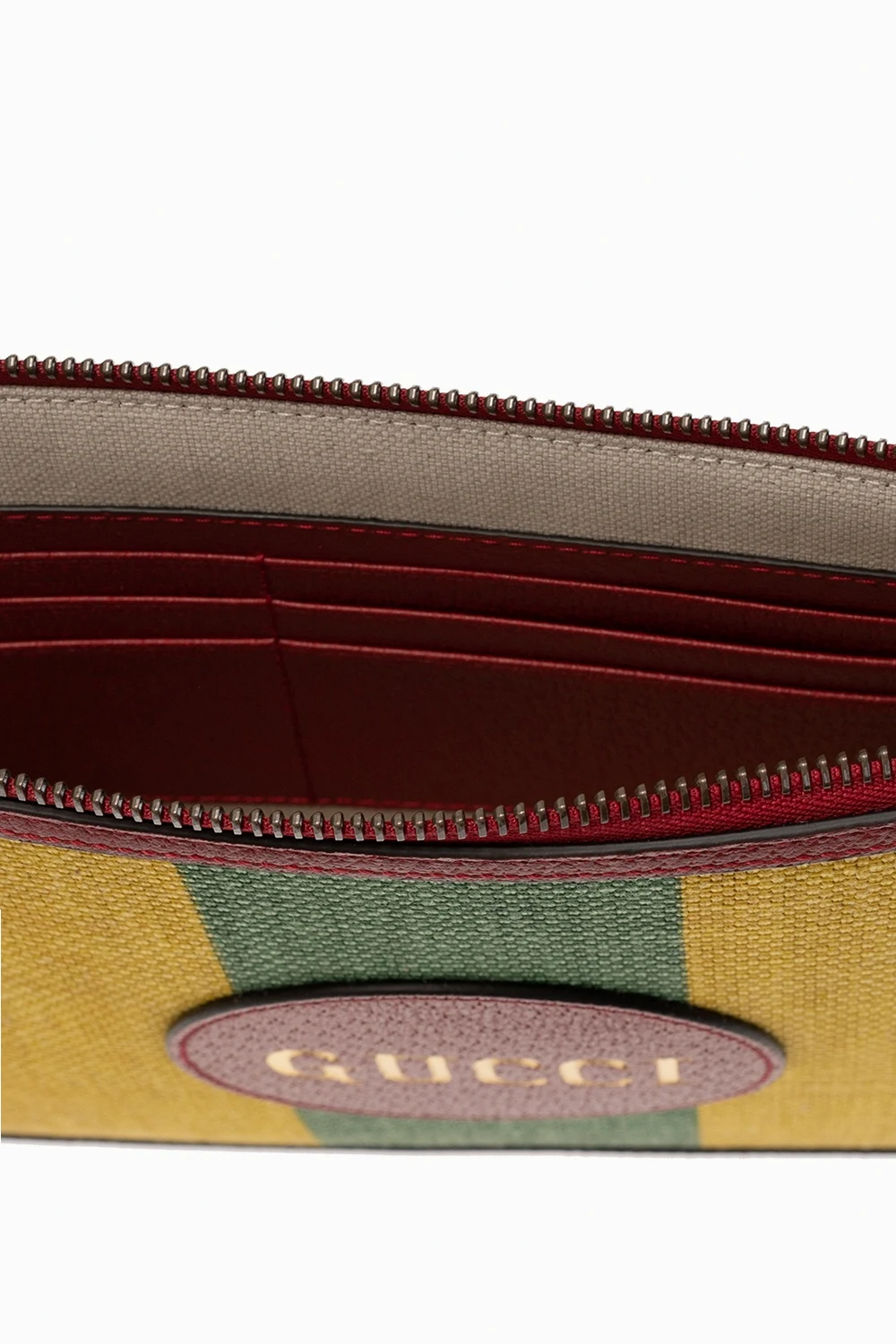 Multicoloured \'Baiadera\' pouch from Gucci. Rendered in stripes, this canvas item has zip fastening, leather trims, an embroidered logo appliqué, a detachable wrist strap and interior with one compartment, one slip pocket and six card slots.