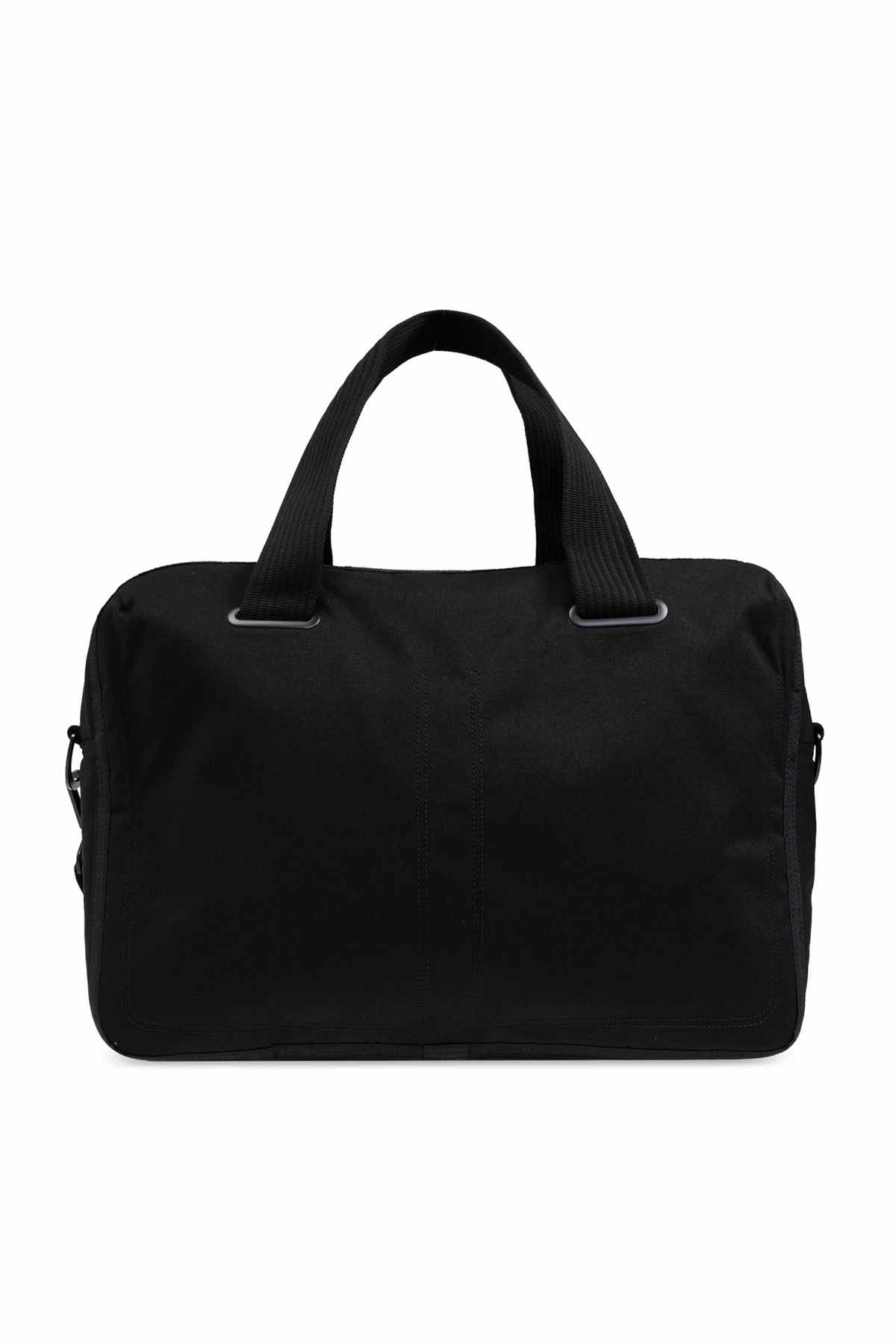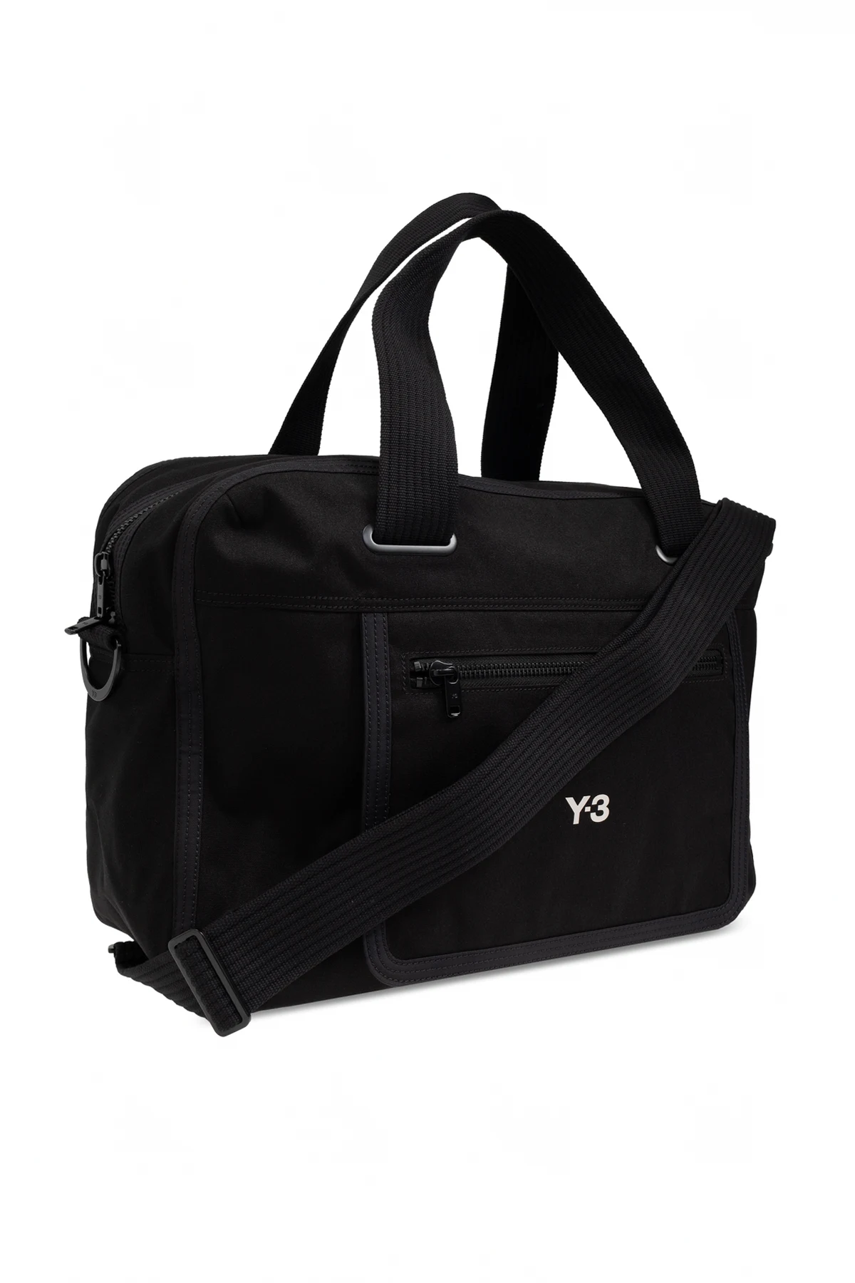 Discover the epitome of sophistication with the Y-3 Yohji Yamamoto Handheld Bag, a distinguished piece from the exclusive fashion collection. This elegant bag, crafted with meticulous attention to detail, offers both style and utility. The bag boasts a sleek, rectangular shape with subtly rounded edges, presented in a classic, uniform black hue. Constructed from durable textile material, likely nylon or polyester, it promises longevity and resilience. The front proudly displays the iconic white \"Y-3\" logo, a symbol of unparalleled quality and design. Functionality is at the forefront with this bag, featuring an external zippered pocket and a spacious internal compartment, also secured with a high-quality zipper. The bag is designed for versatility, equipped with two short handles for handheld carrying and a long, adjustable shoulder strap for added convenience. Attention to detail is evident in the solid finish and reinforced stitching at the handles, ensuring robustness and elegance. Why Choose This Product? Timeless Design: Classic black color with a prominent \"Y-3\" logo. Durable Material: Made from resilient textile, built to last. Functional Features: External and internal zippered pockets for secure storage. Versatile Carrying Options: Short handles and an adjustable shoulder strap. Quality Craftsmanship: Reinforced stitching and high-quality zippers.