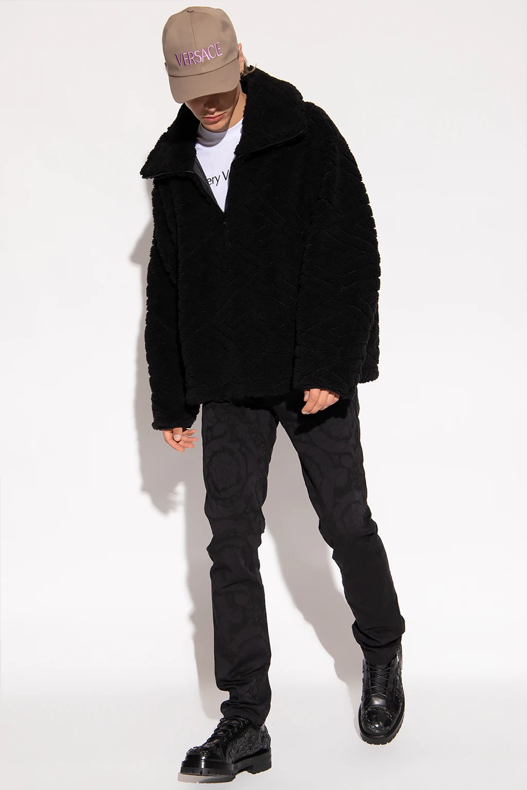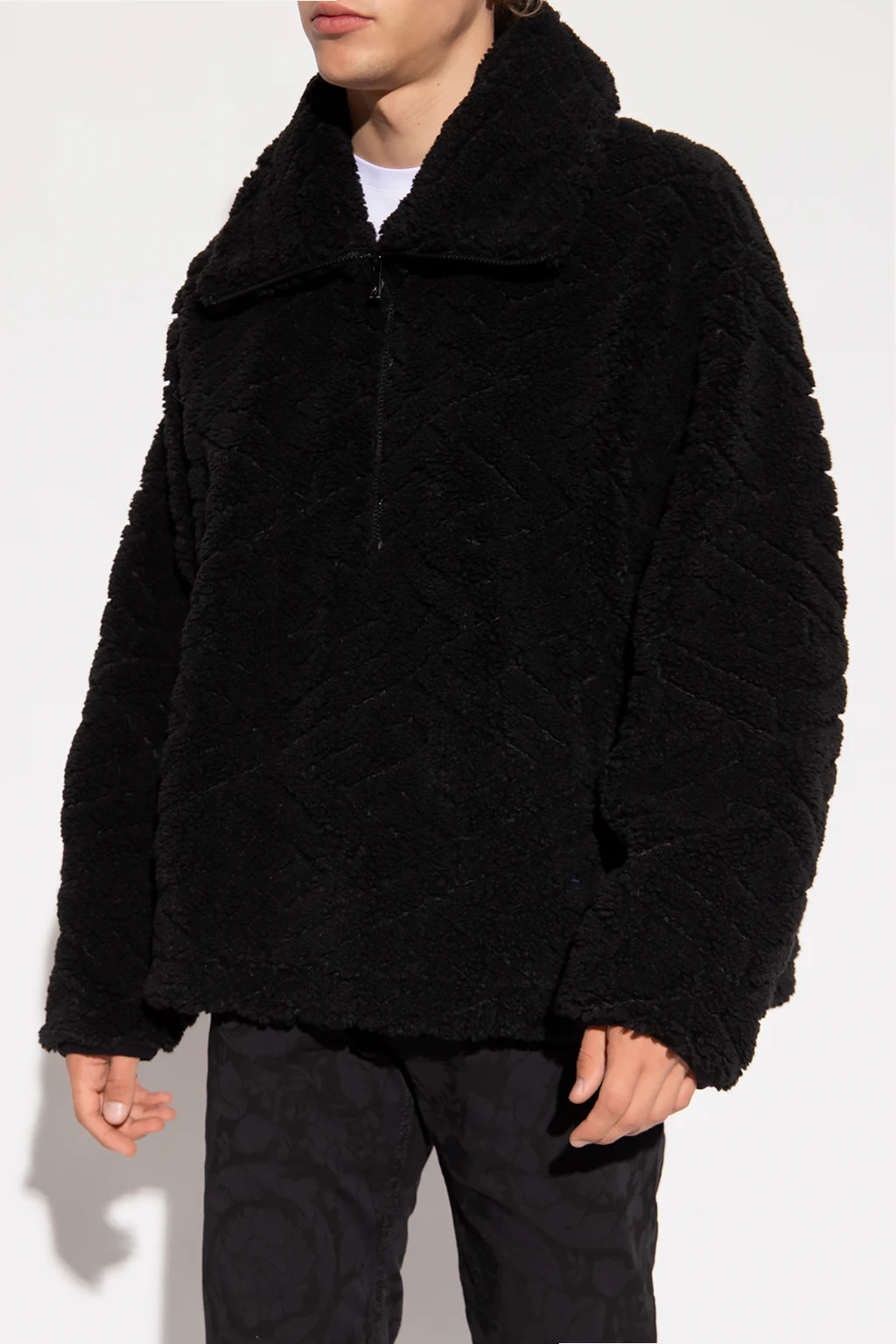 Black sweatshirt from Versace. Crafted from faux fur, this item features a collar with a quarter-zip closure, two snap-fastened pockets on the front and long sleeves.