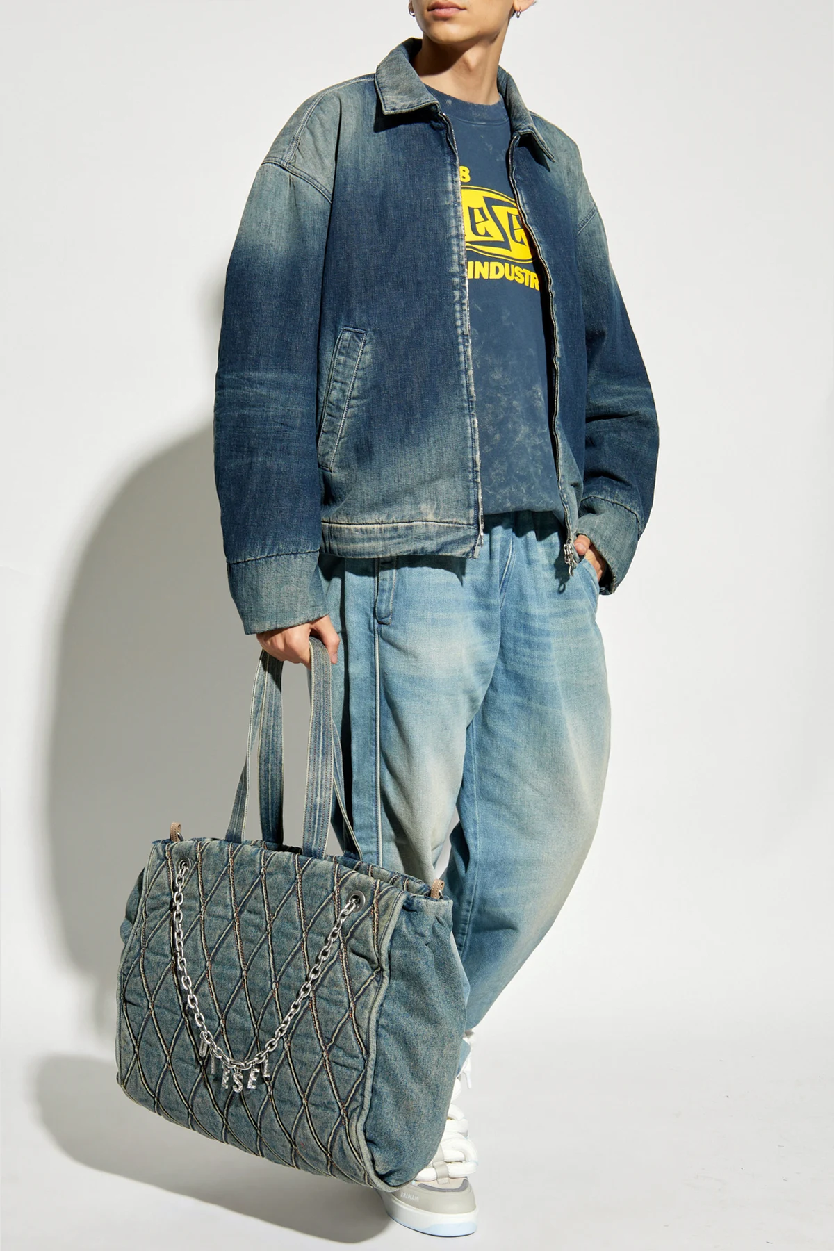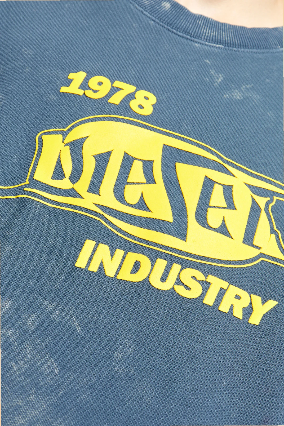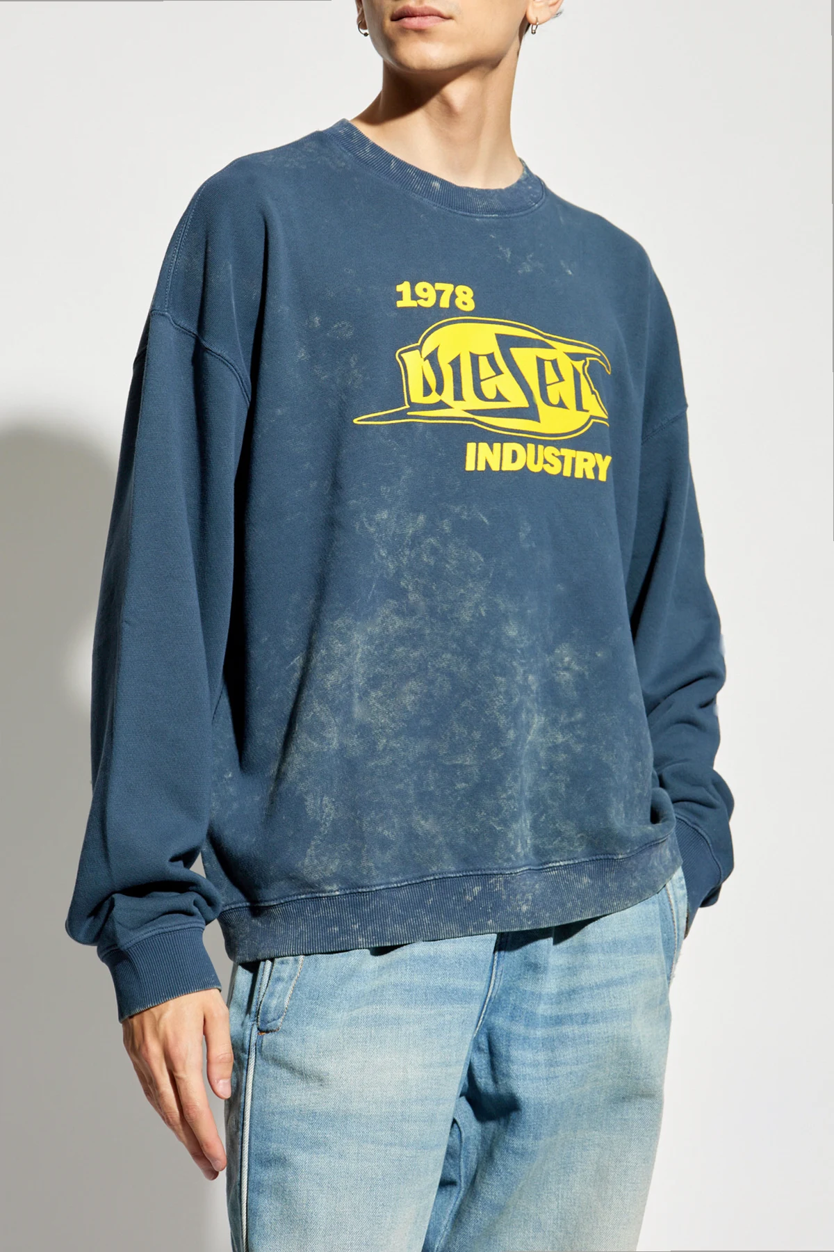 Experience the epitome of refined casual wear with the Bluza \'S-BOXT-Q5\' from the esteemed Diesel brand. This navy blue crewneck sweatshirt stands as a testament to classic design and contemporary excellence. Crafted from premium cotton, this sweatshirt boasts a timeless crewneck silhouette, complete with long sleeves adorned with elastic cuffs, and a hem finished with a flexible waistband. The front features a bold, yellow print that reads \"1978 DIESEL INDUSTRY,\" offering a striking contrast against the rich navy background. The retro-styled print and the washed fabric effect contribute to its unique, slightly vintage appeal. Diesel\'s dedication to quality and style is evident in every detail, from the meticulously crafted fabric to the internal branding that showcases the iconic Diesel logo. Perfectly balancing comfort and style, this sweatshirt is ideal for everyday wear, seamlessly blending with various wardrobe staples. Why choose this product? Timeless Design: Classic crewneck cut with a modern, retro twist. Premium Material: Made from high-quality cotton for maximum comfort and durability. Bold Aesthetics: Eye-catching yellow print against a navy background. Versatile Style: Perfect for both casual and stylish outfits. Renowned Brand: From Diesel, a name synonymous with quality and innovation.