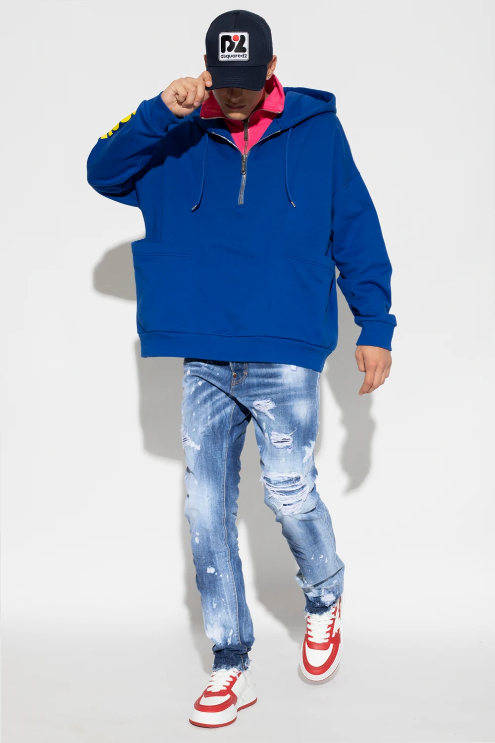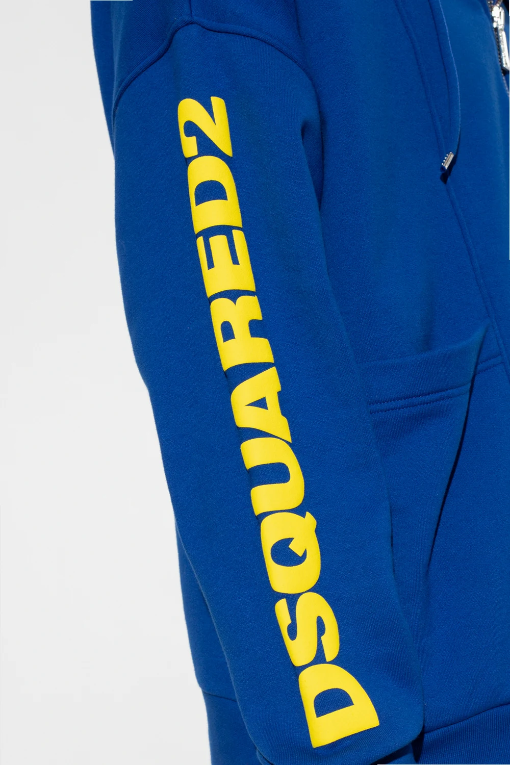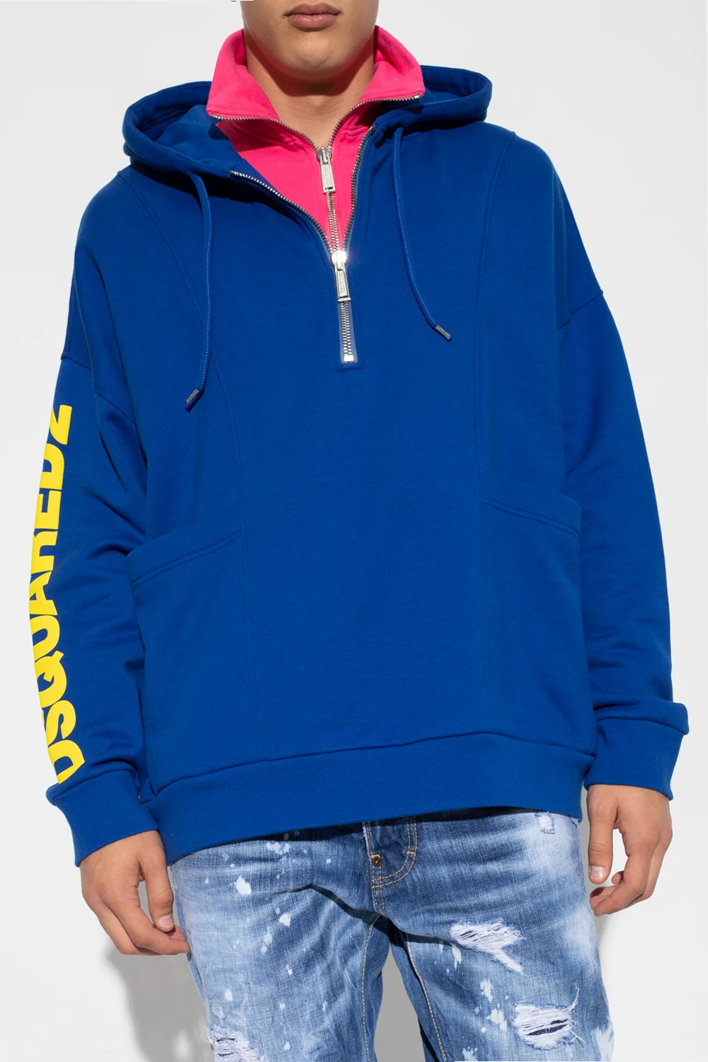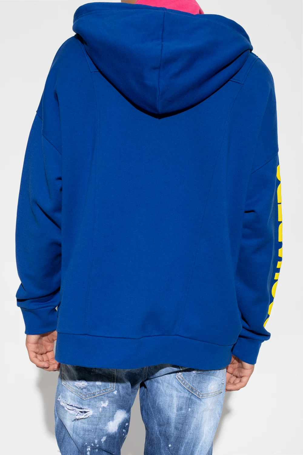 Blue and pink hoodie from Dsquared2. Made of cotton, this garment features a double neckline with a zip, drawstring hood, two front pockets, long sleeve with a yellow logo print and ribbed trims at the hem and cuffs.
