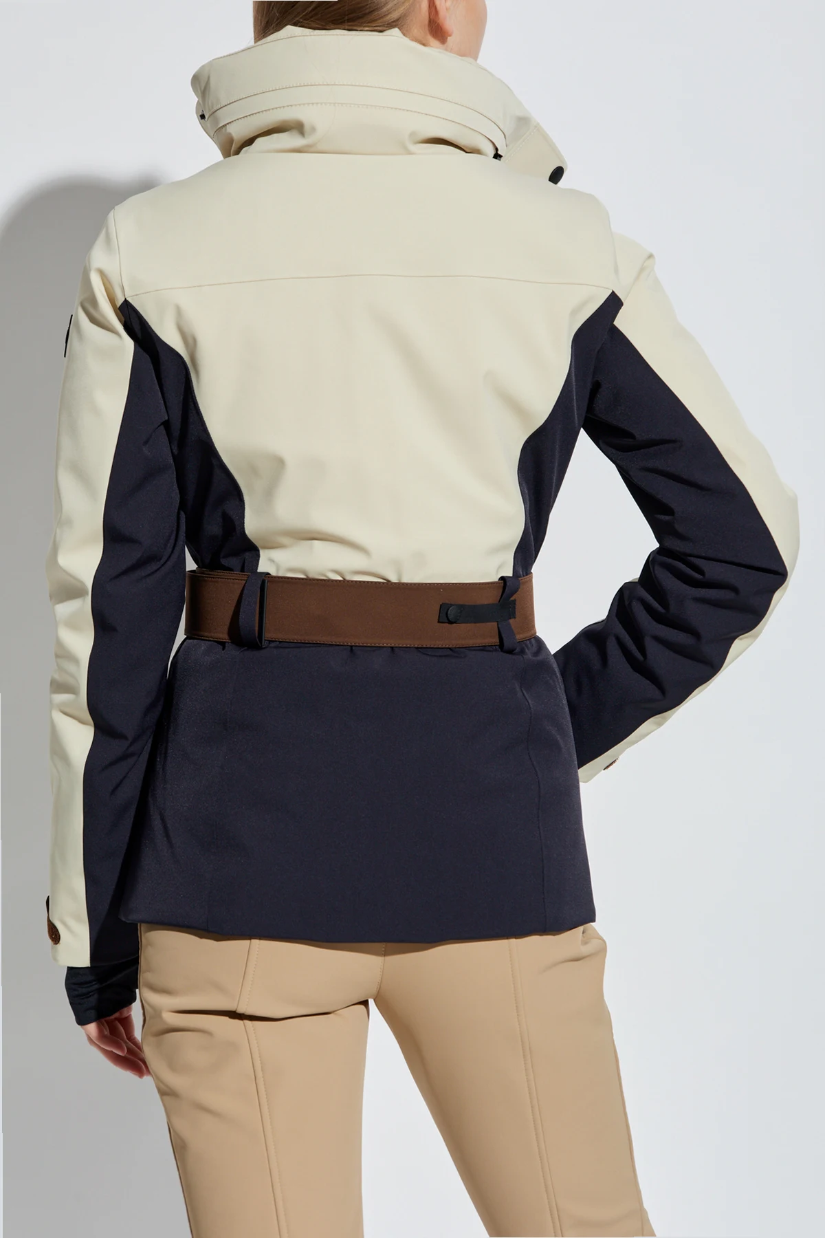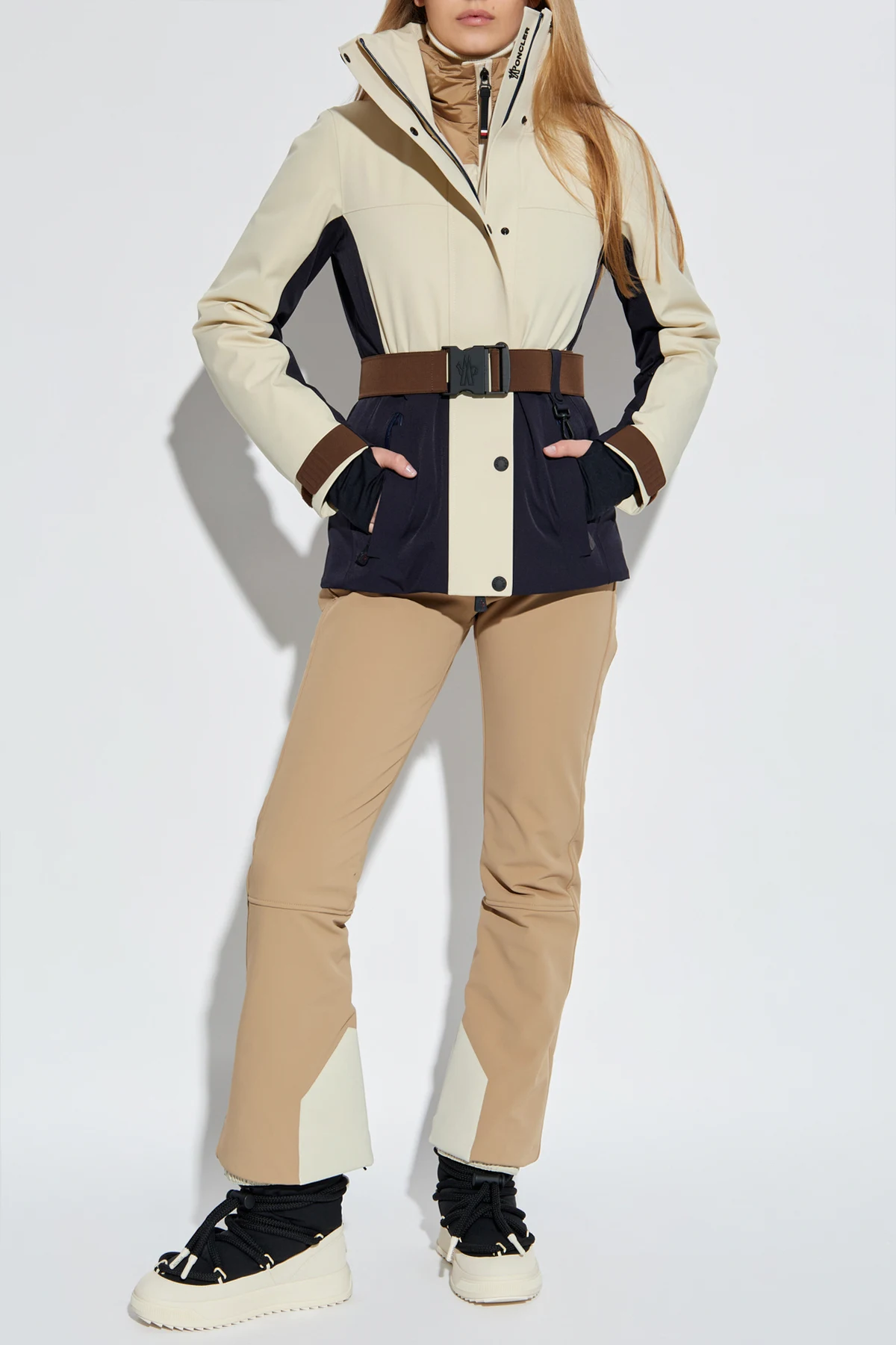 The MONCLER GRENOBLE HIGH PERFORMANCE women\'s ski jacket is the epitome of modern alpine elegance and functional luxury. Expertly tailored with a refined silhouette, it features a slim fit accentuated by a statement-wide front belt, sculpting the waist and flattering the figure. The dominant off-white hue is enhanced by contrasting deep navy panels at the sides and back, while rich brown accents at the belt and cuffs add sophisticated distinction. Crafted from premium technical, weather-resistant fabric with a matte exterior finish, the jacket offers protection and comfort in demanding mountain environments. The interior showcases a quilted, subtly lustrous insulating layer, providing essential warmth without compromising style. Discreet zipper closures ensure a sleek profile. A true testament to Moncler Grenoble’s legacy, this jacket seamlessly marries high-fashion sensibility with performance-driven design—perfect for those who demand both excellence and allure on and off the slopes. Why choose this product? Exquisitely tailored silhouette with statement belt High-performance, weather-resistant technical fabric Luxurious quilted interior for optimal warmth Striking contrast color panels and refined details Exclusive Moncler Grenoble high-fashion pedigree
