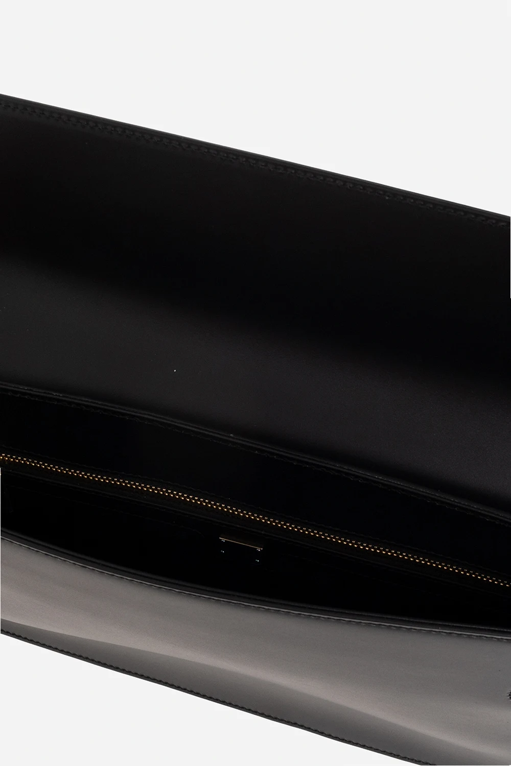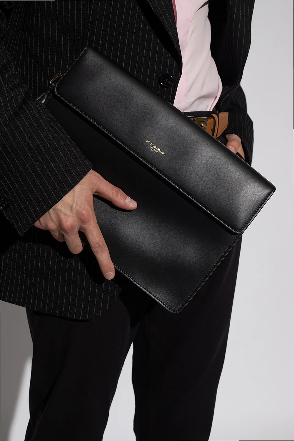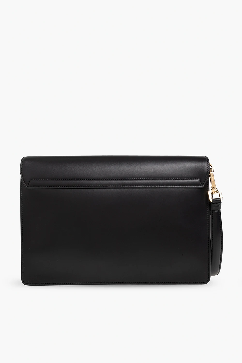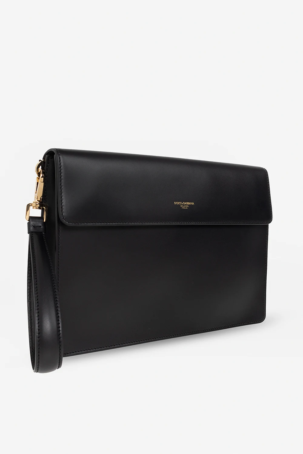Black ‘Monreale’ handbag from Dolce & Gabbana. Made of calf leather, this model is complete with magnetic snaps, a gold-tone logo print, detachable wrist strap with a carabiner hook, gold-tone metal hardware and one internal compartment with one zip pocket.