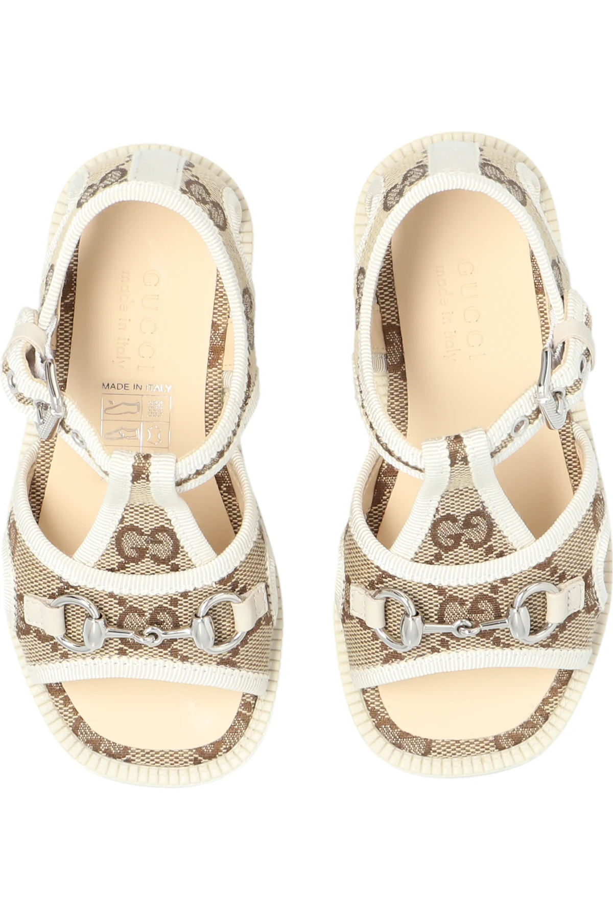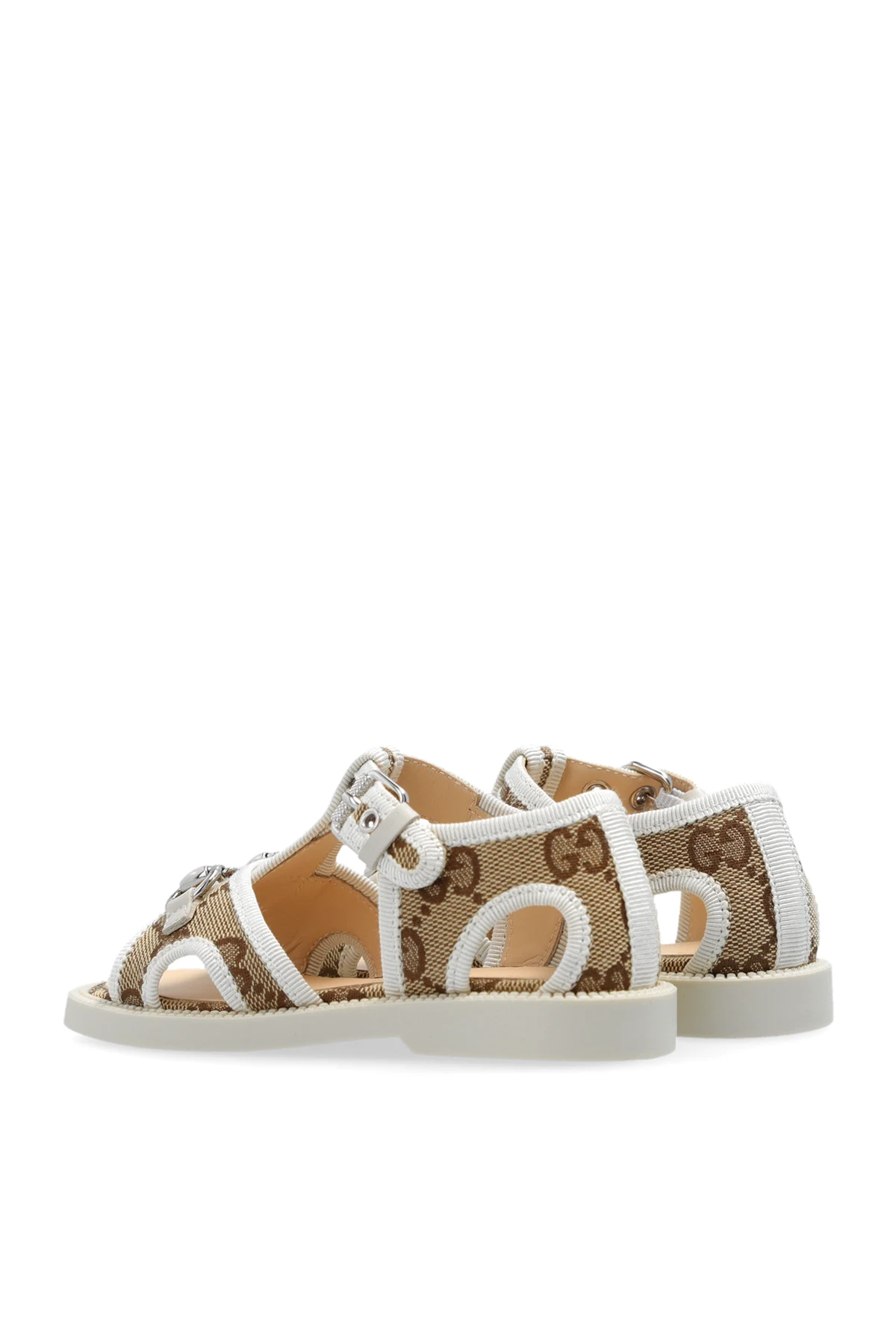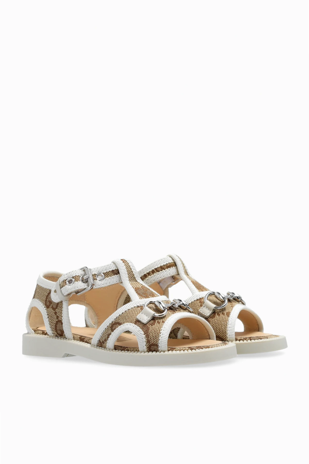 Beige, brown and cream sandals from Gucci Kids. Made of GG canvas, this pair features an adjustable buckle strap, monogram pattern, the brand’s signature horsebit in silver-tone and a cream rubber sole.