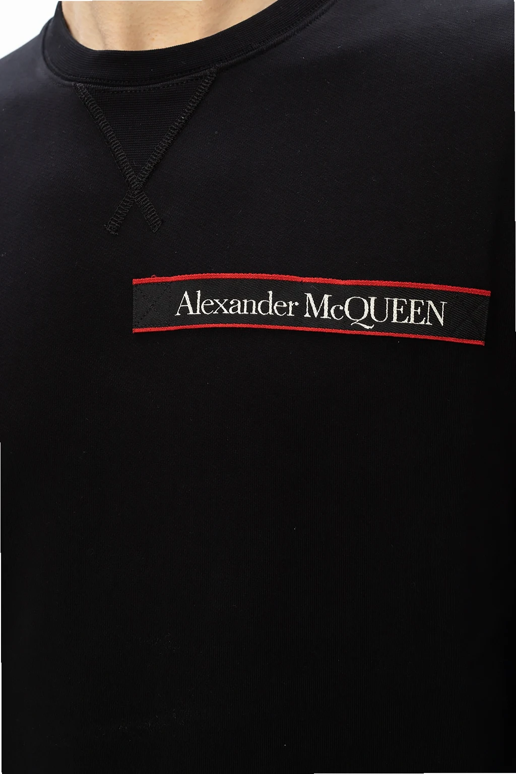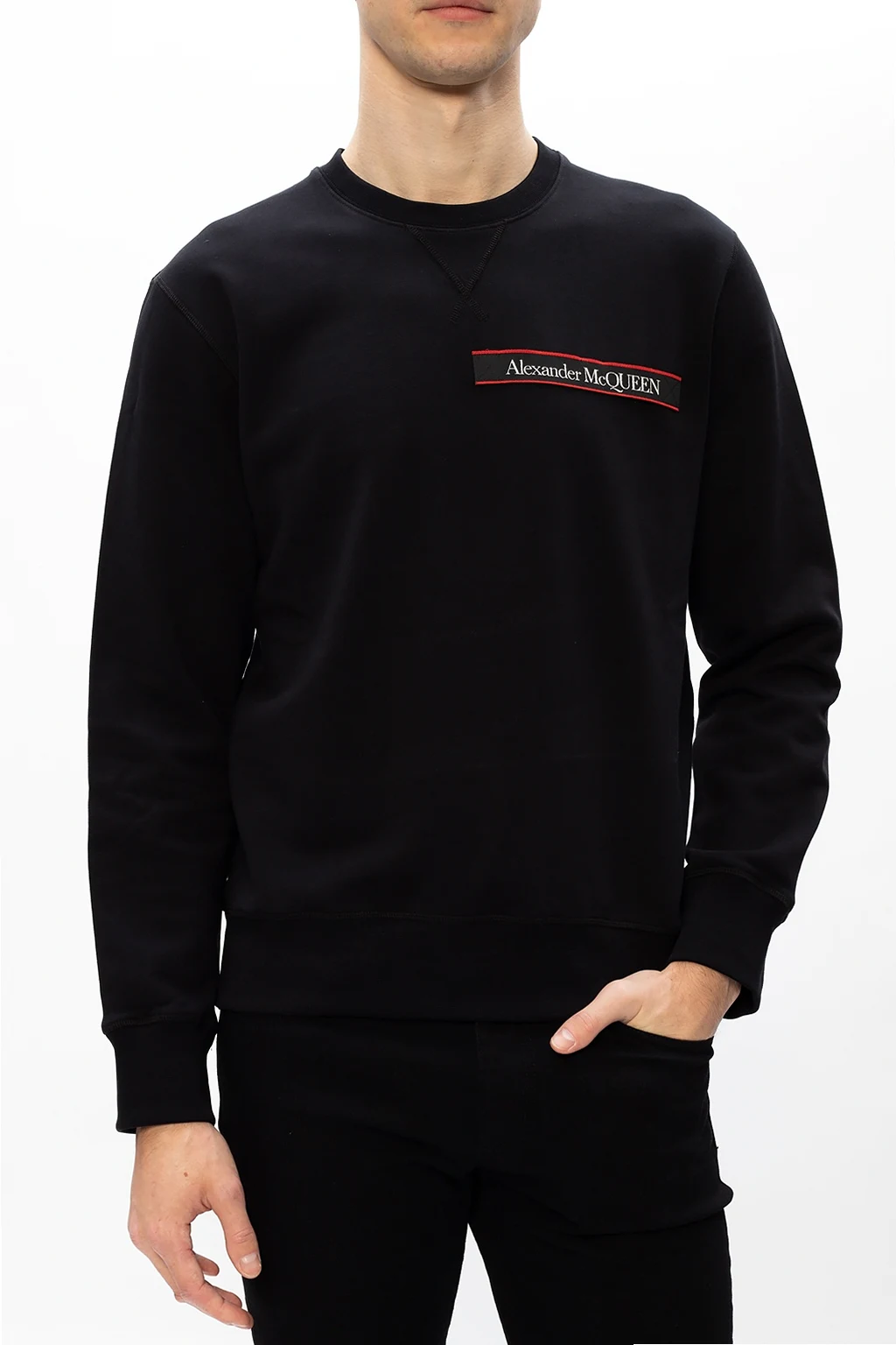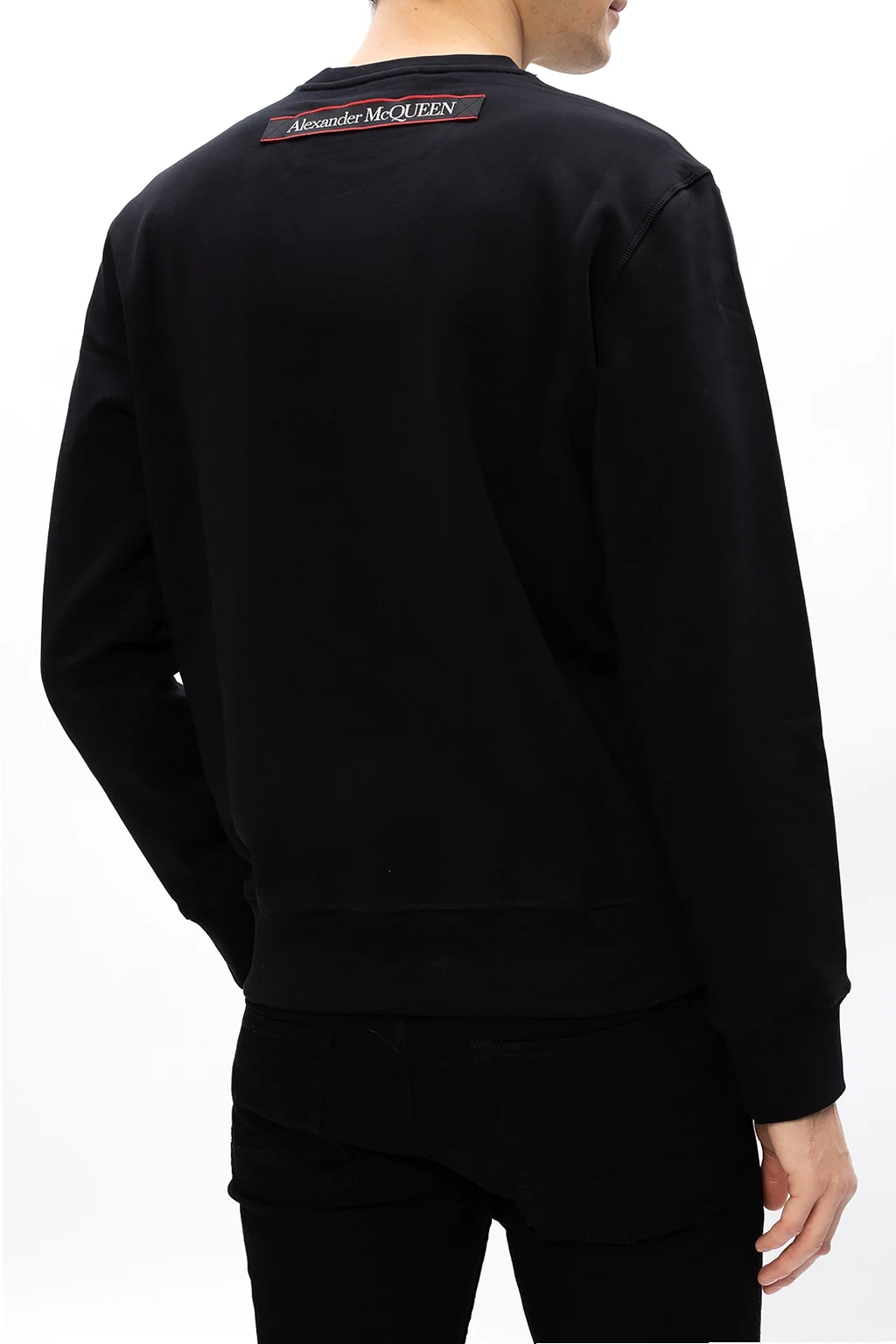 Black crewneck sweatshirt from Alexander McQueen. Boasting a red, white and black logo patch, this cotton-crafted style is complete with rib-knit finishes at the collar, bottom hem and cuffs.