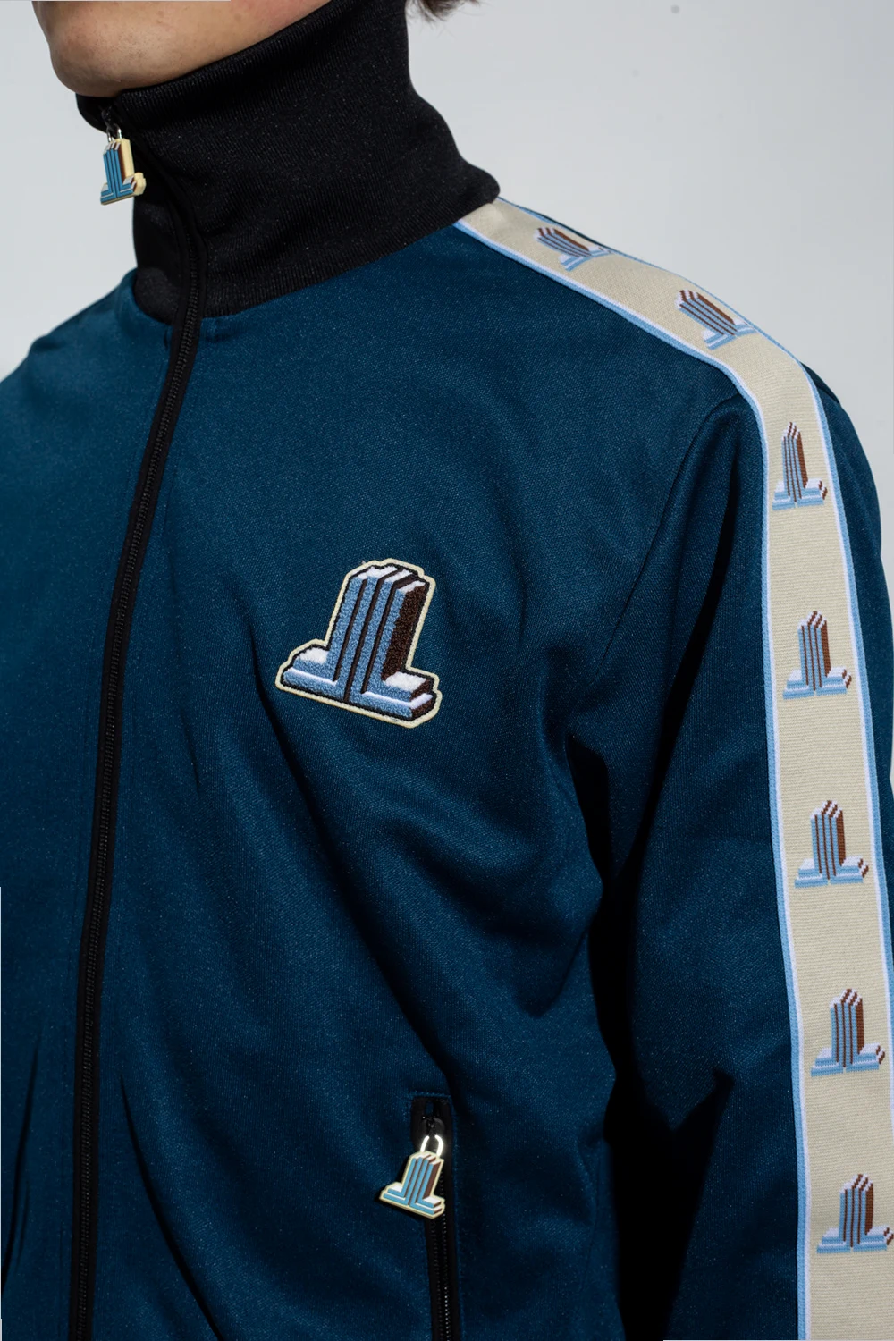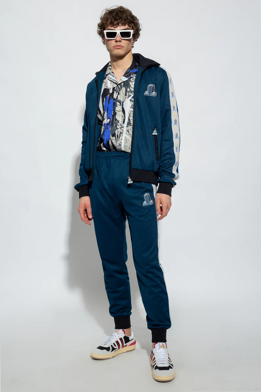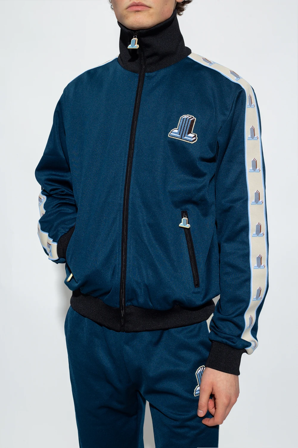 Navy blue and black sweatshirt with a standing collar from Lanvin. Emblazoned with a logo patch, this style features a zip fastening, two zipped pockets and an elasticated collar, bottom hem and cuffs.